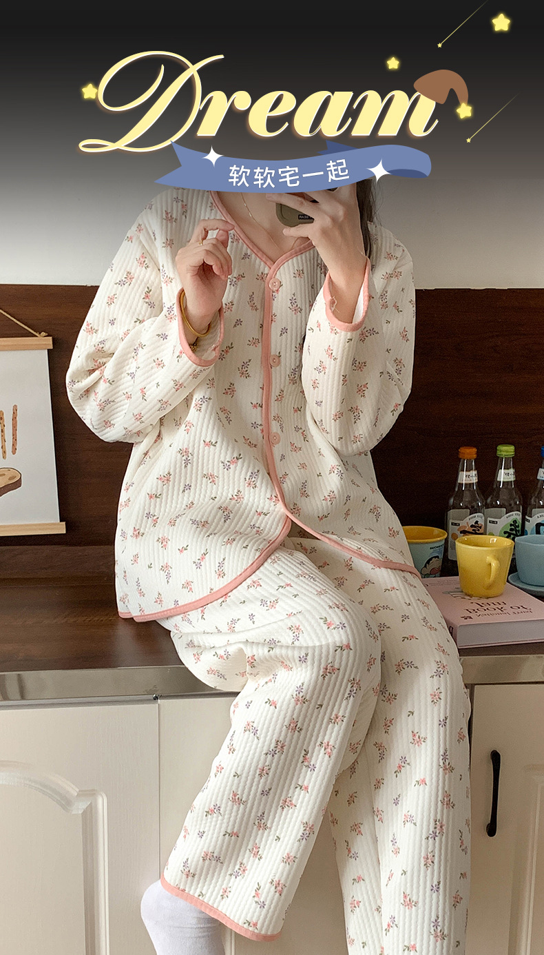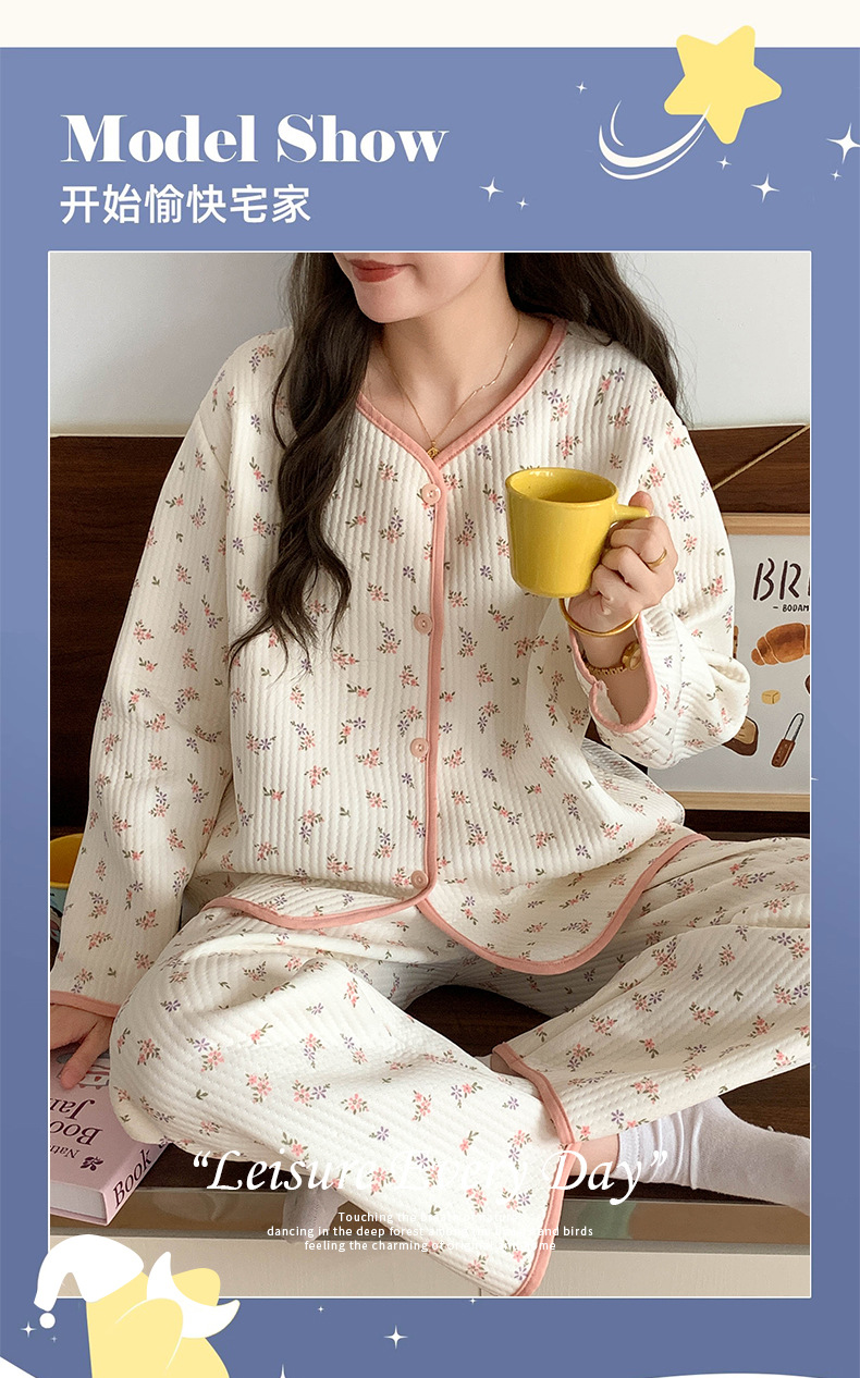 가을과 겨울 공기면 잠옷 여성의 두꺼운 따뜻한 긴 소매 꽃 카디건 달콤한 귀여운 홈 의류 세트 세대 헤어스토어 가기