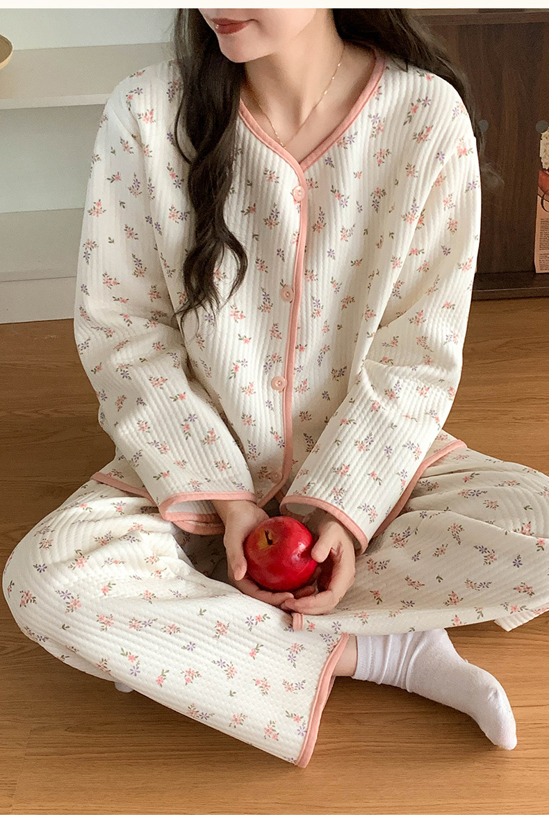 가을과 겨울 공기면 잠옷 여성의 두꺼운 따뜻한 긴 소매 꽃 카디건 달콤한 귀여운 홈 의류 세트 세대 헤어