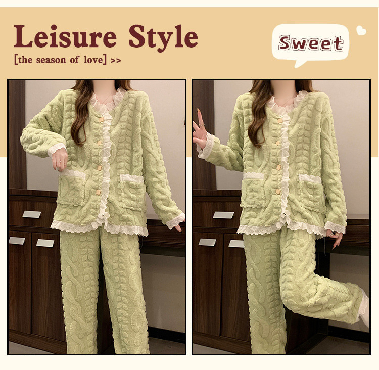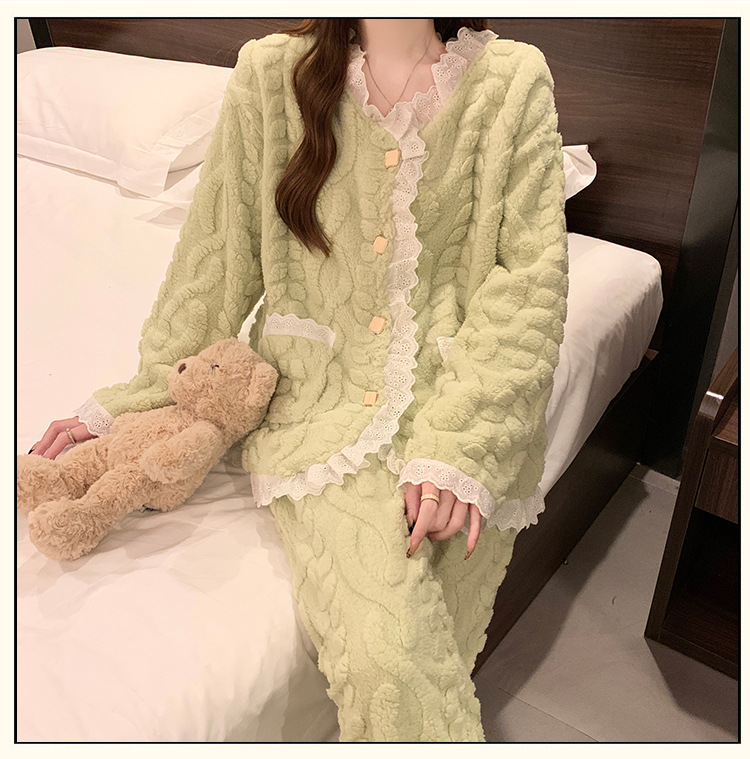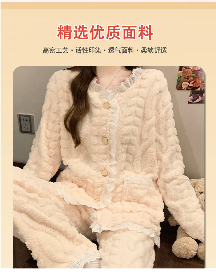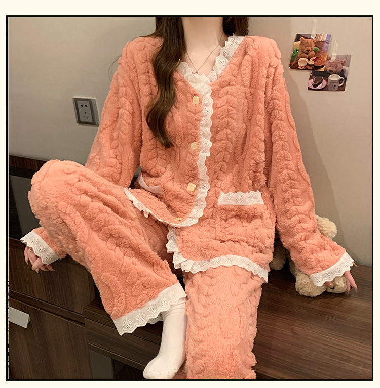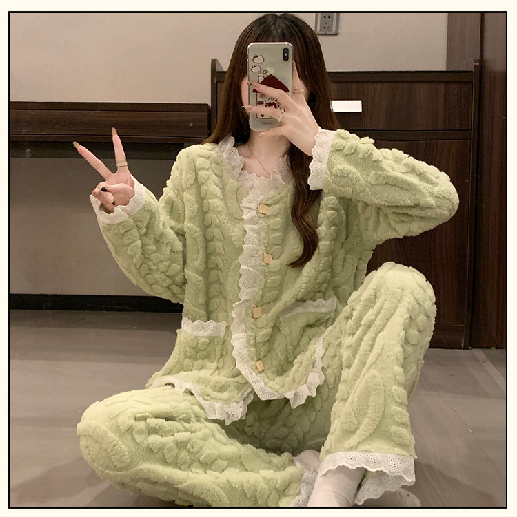 산호 양털 잠옷 여성의 가을과 겨울 새로운 한국 스타일 달콤한 샤넬 스타일 겨울 기모 두꺼운 따뜻한 집 옷 세트