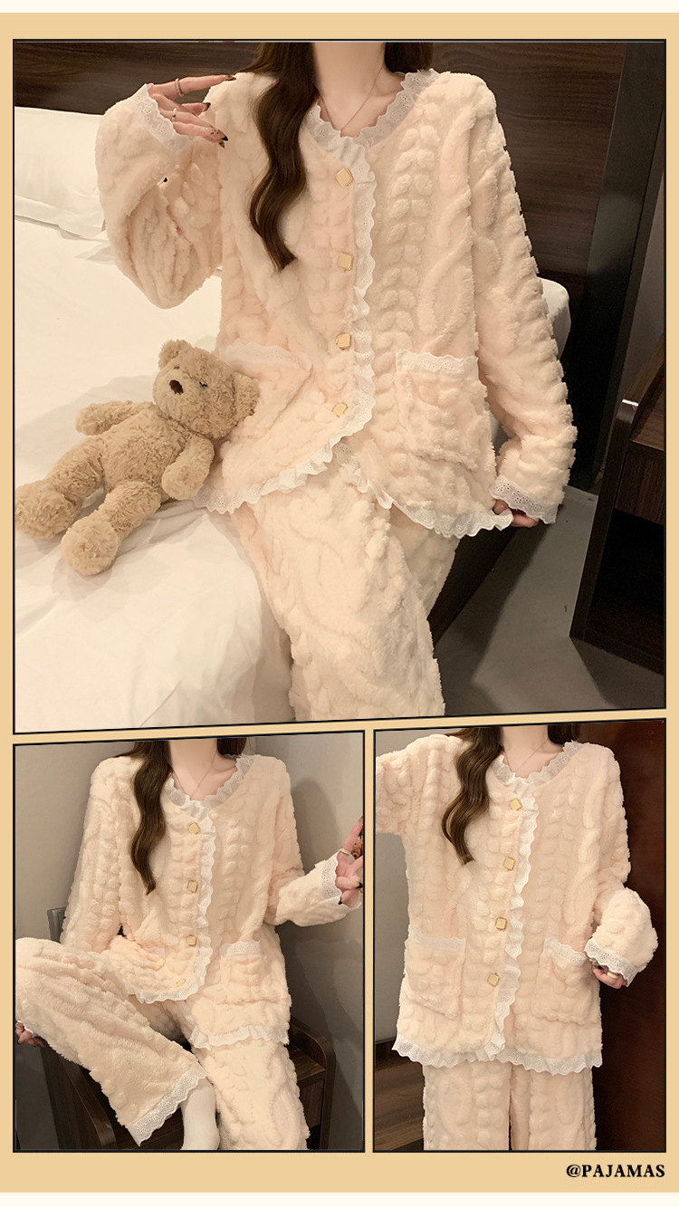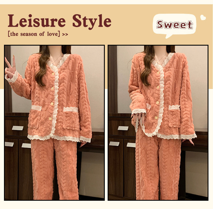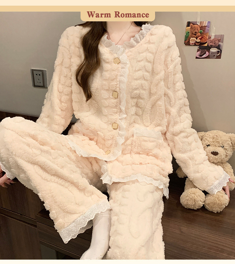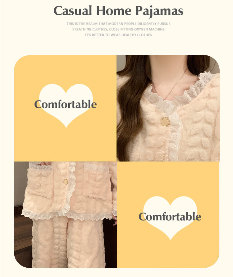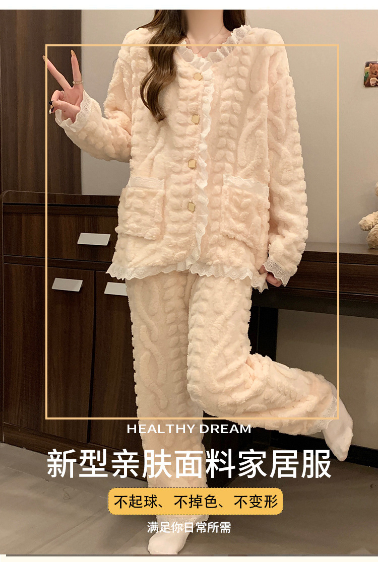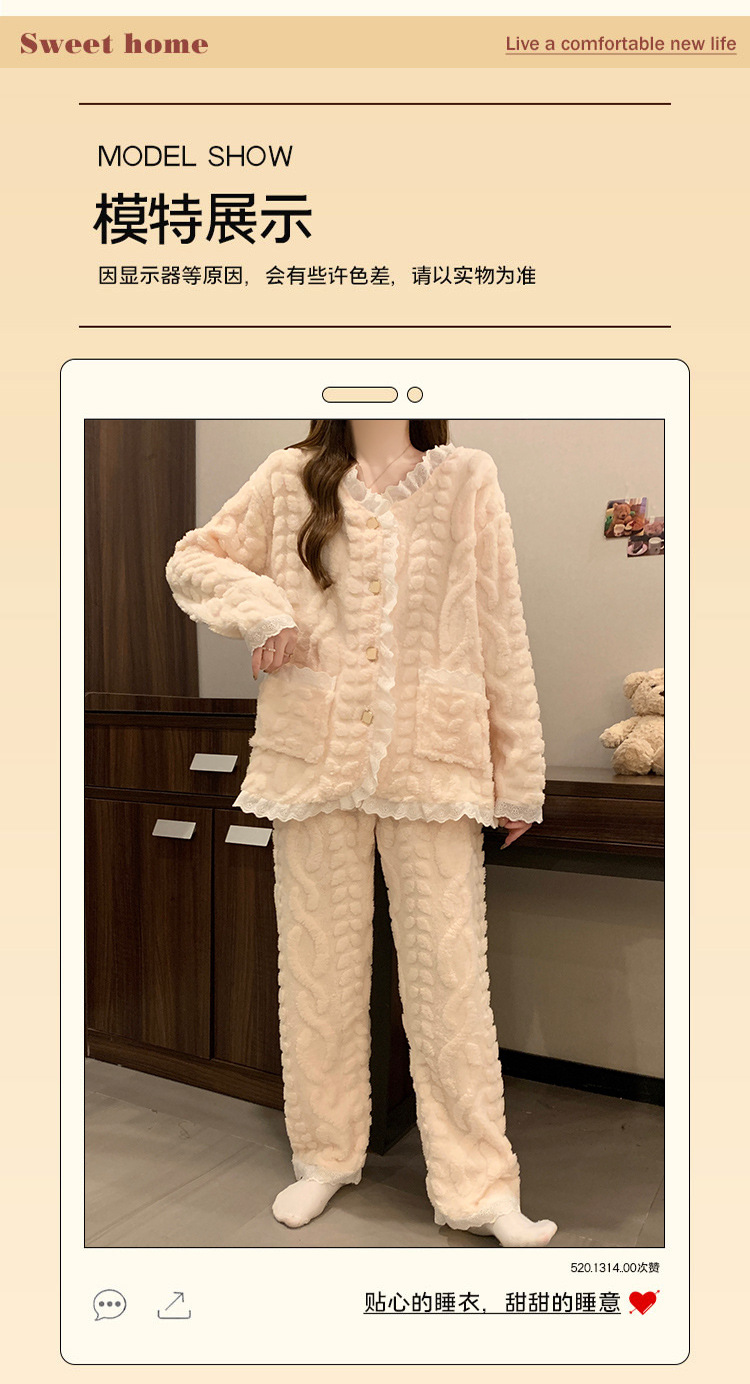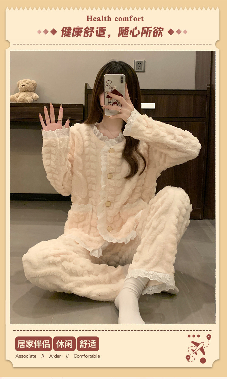 산호 양털 잠옷 여성의 가을과 겨울 새로운 한국 스타일 달콤한 샤넬 스타일 겨울 기모 두꺼운 따뜻한 집 옷 세트스토어 가기