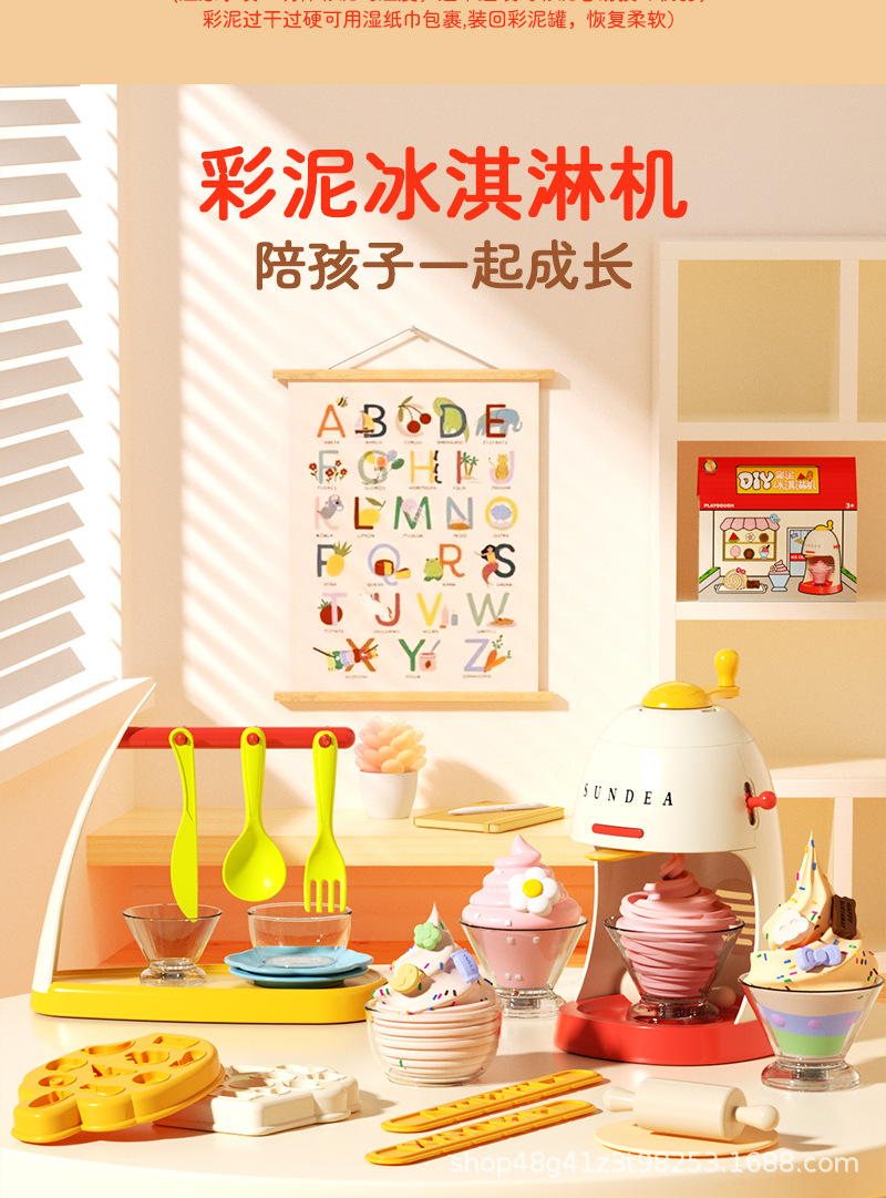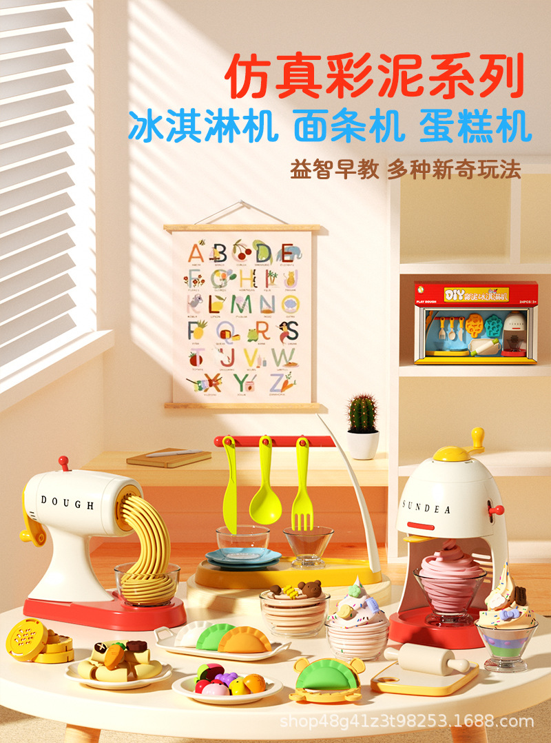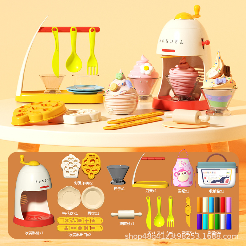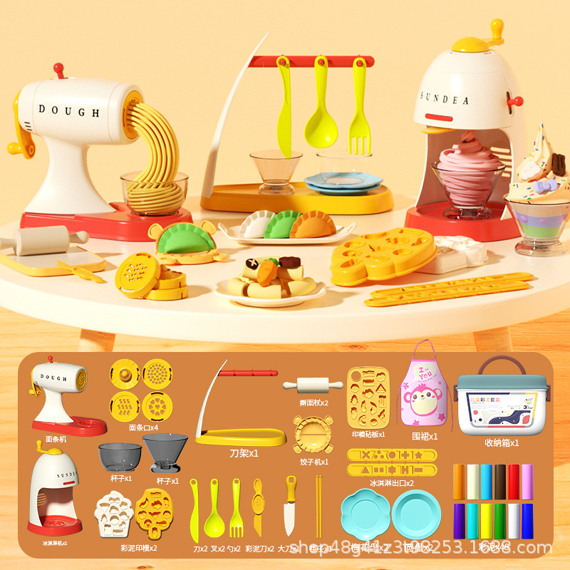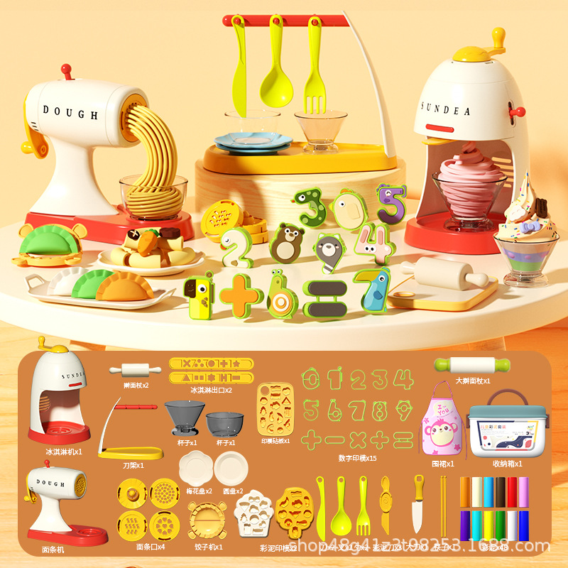 • 학습 놀이 세트⭐국수 기계 + 아이스크림 기계 + 고대 시 탱그램 + 주방 도구 랙 [진흙 48개] 보관함 + 앞치마 포함