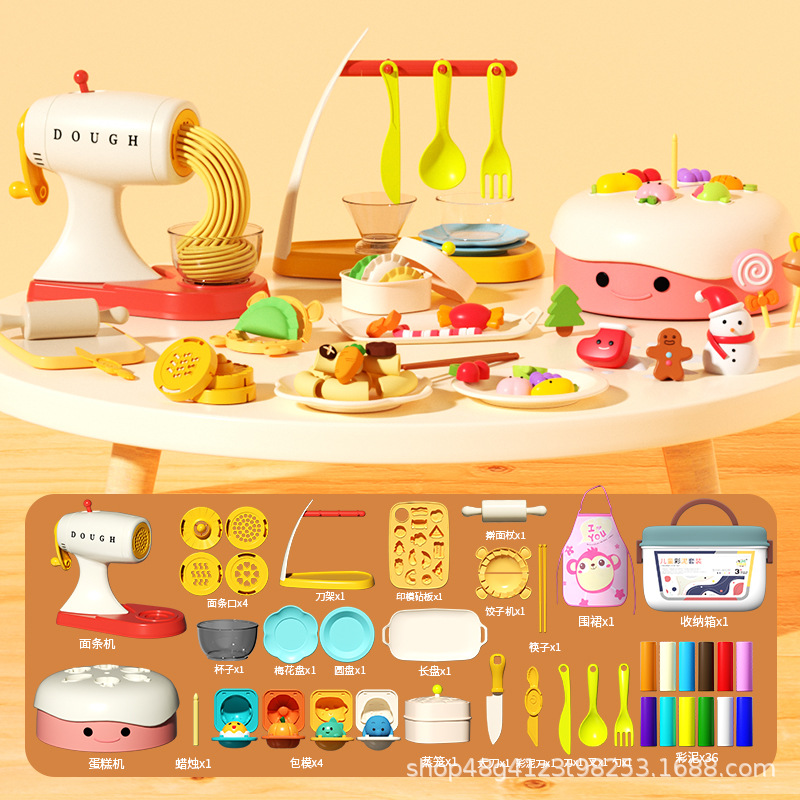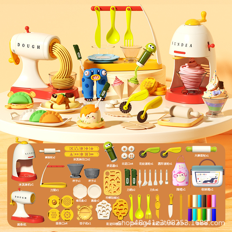 • 학습 놀이 세트⭐국수 기계 + 아이스크림 기계 + 수공구 + 주방 도구 랙 [진흙 48개] 보관함 + 앞치마 포함