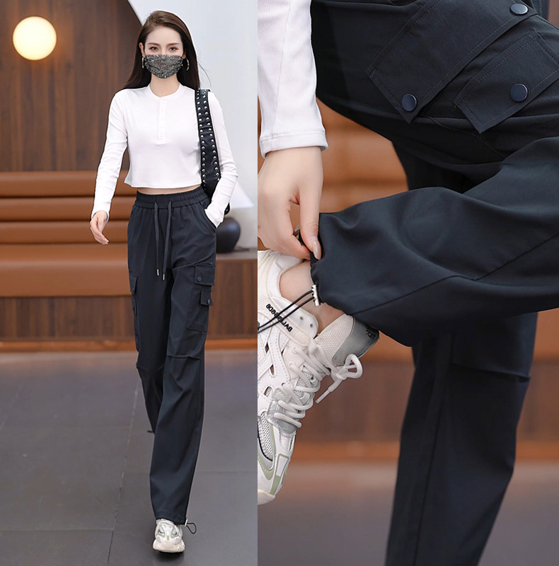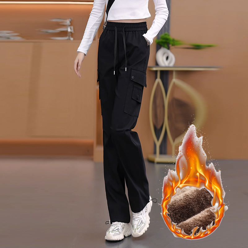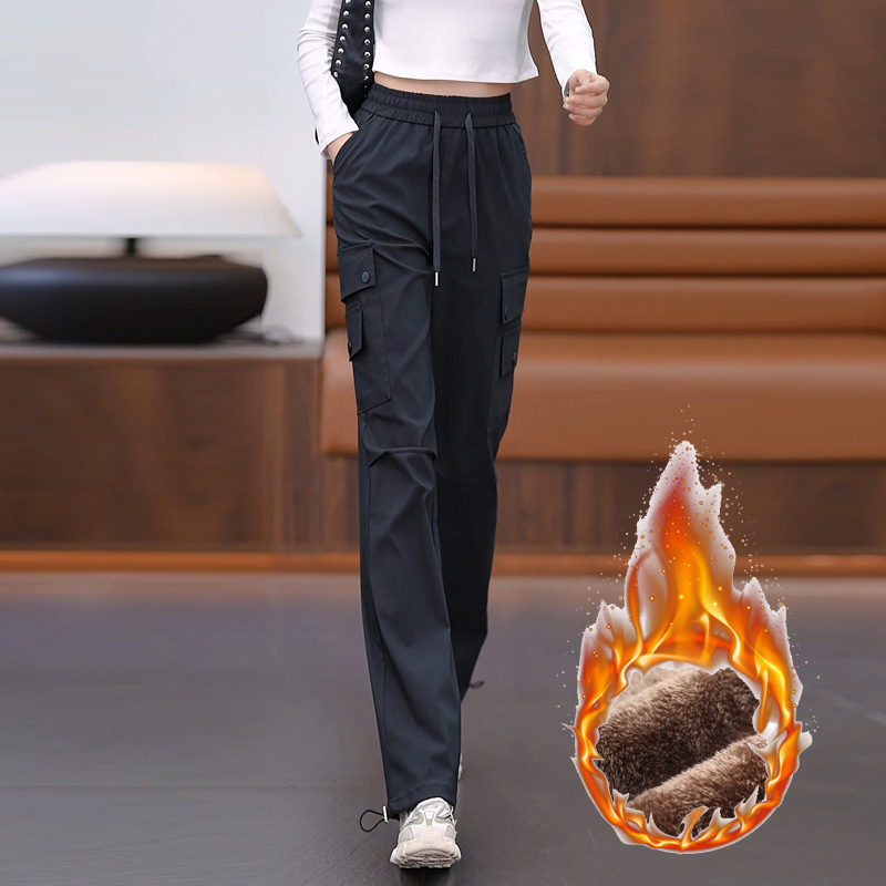 여성용 벨벳 그레이 작업복 2024 겨울 새로운 두꺼운 스트레이트 하이 웨이스트 루즈 드로스트링 아웃도어 어썰트 팬츠스토어 가기