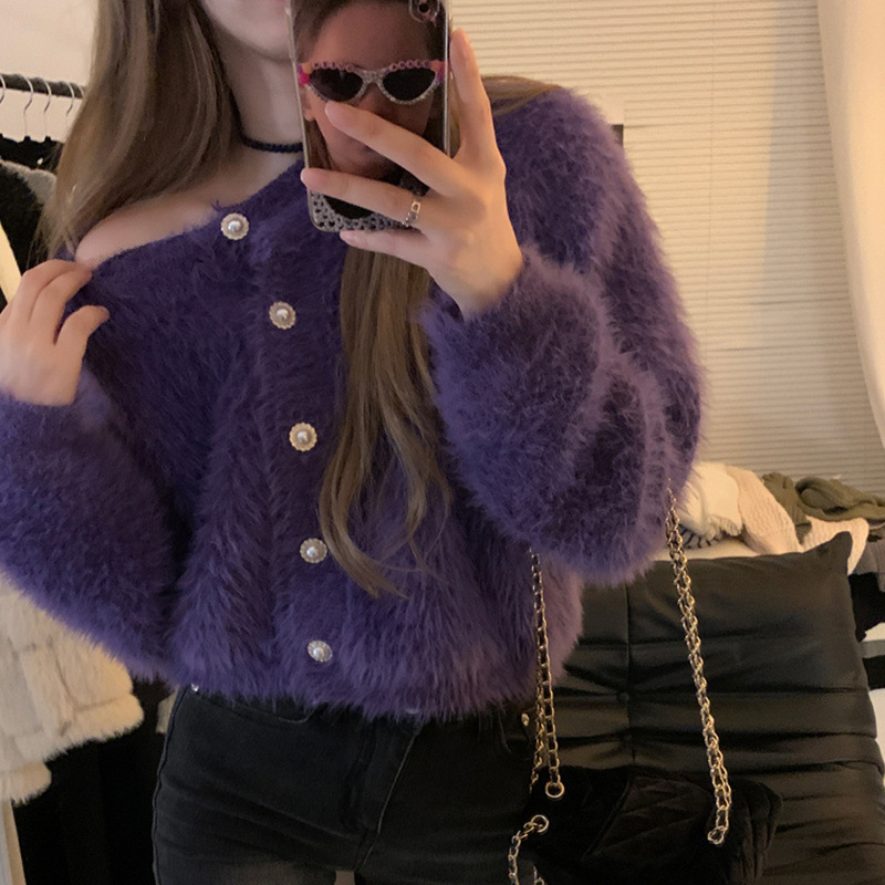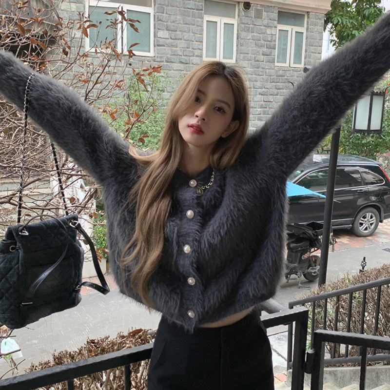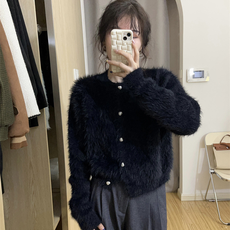 샤넬 스타일 블랙 울 모조 밍크 벨벳 니트 카디건 여성 짧은 양모 탑 느슨한 게으른 스웨터 재킷