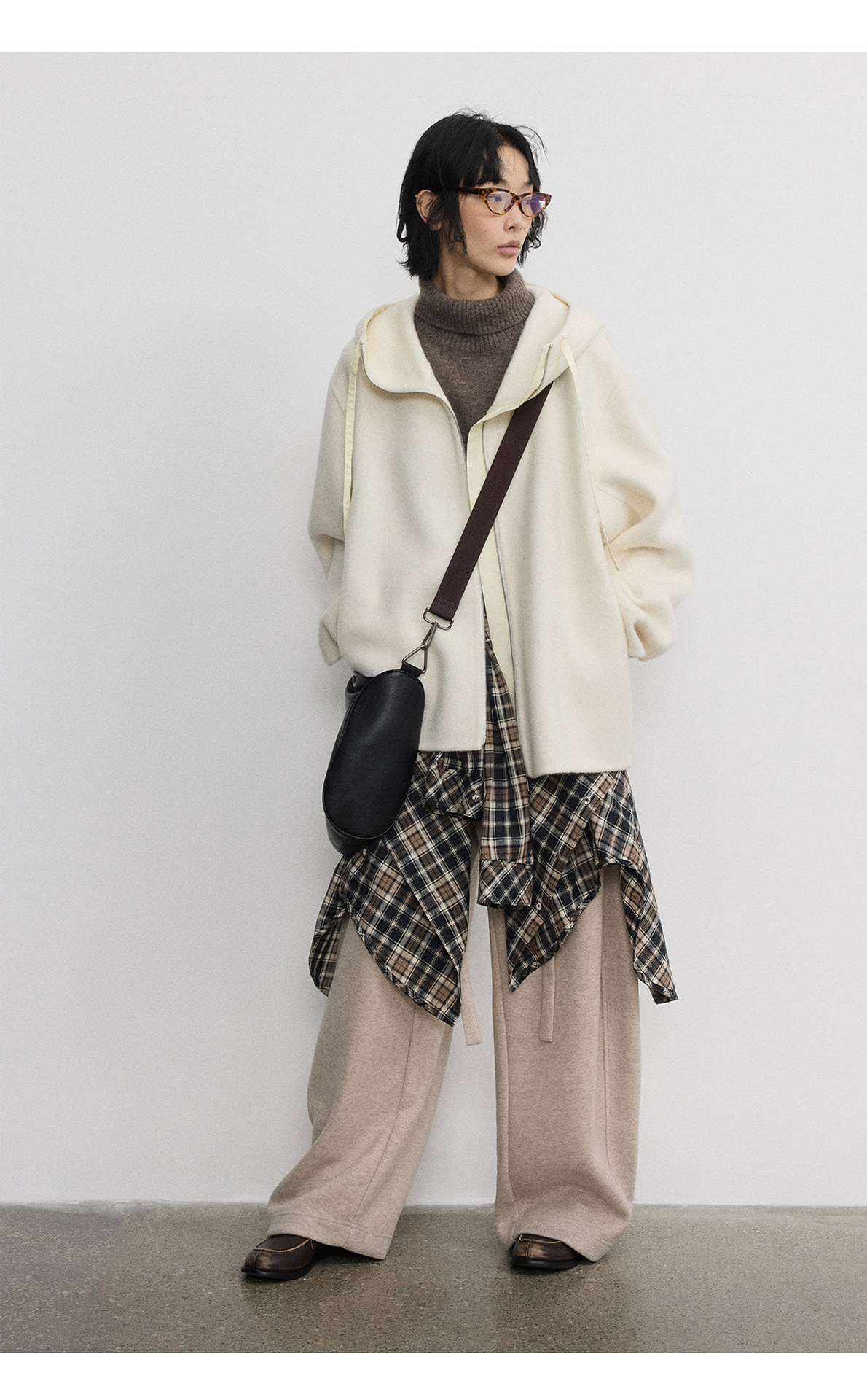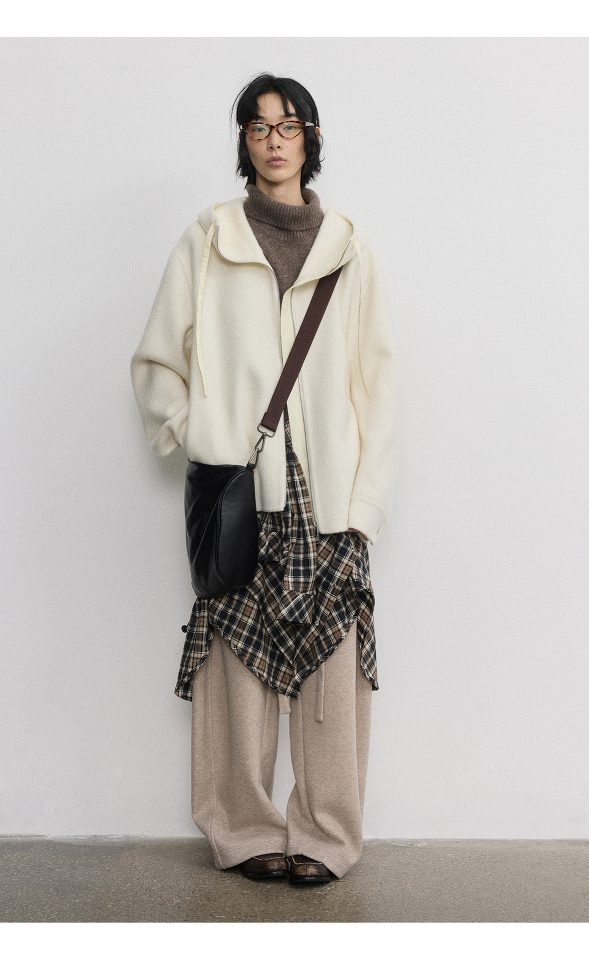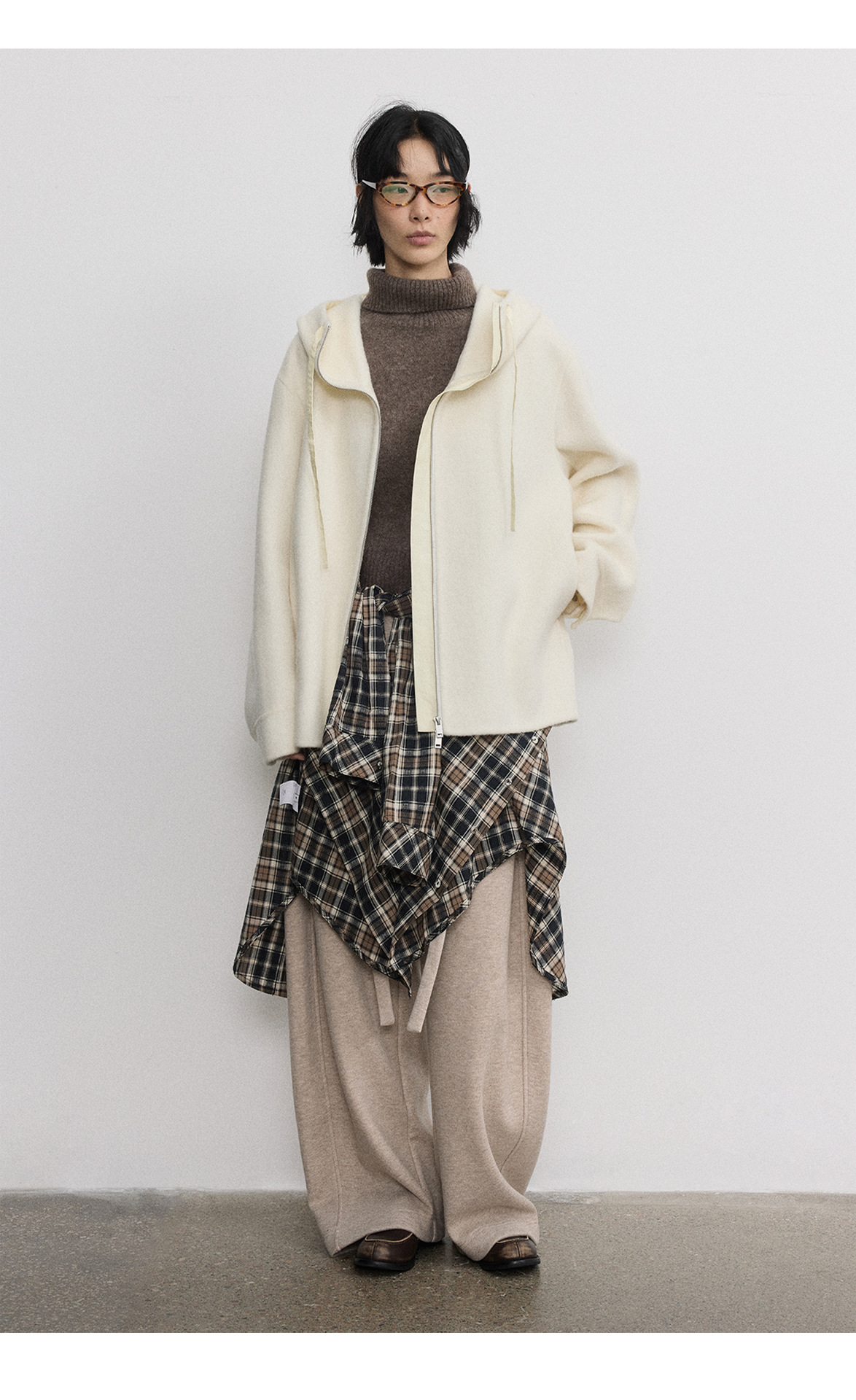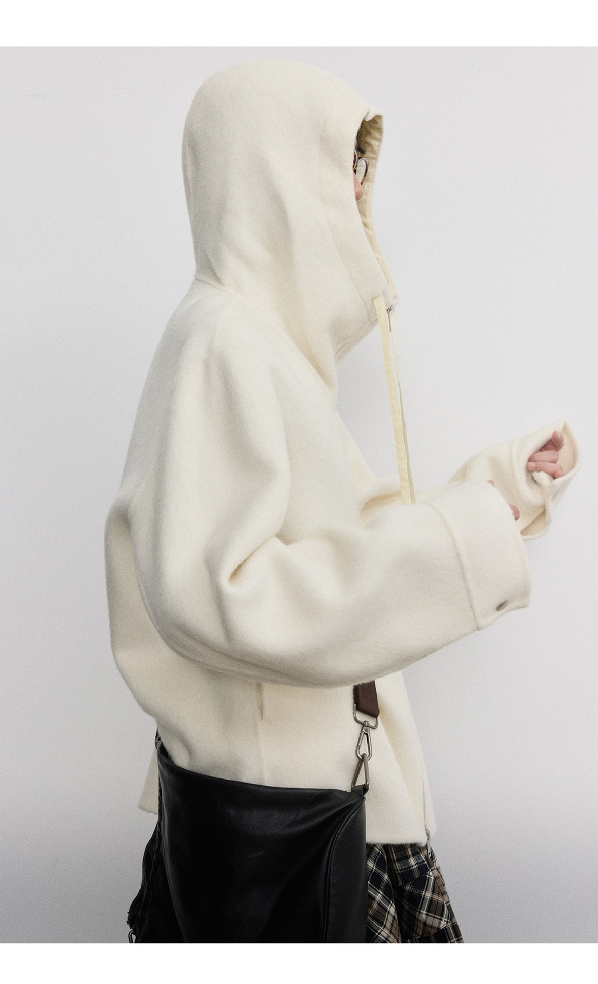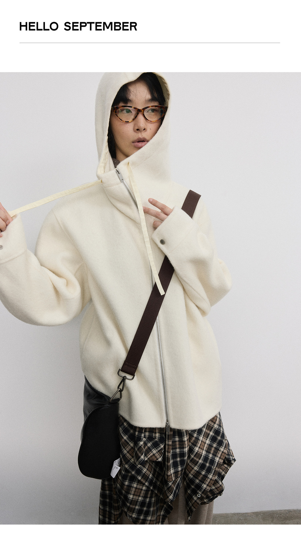 [시간] 새로운 모든 울 화이트 양면 트위드 조절 후드 스웨터 느슨한 지퍼 재킷 여성 V7550A