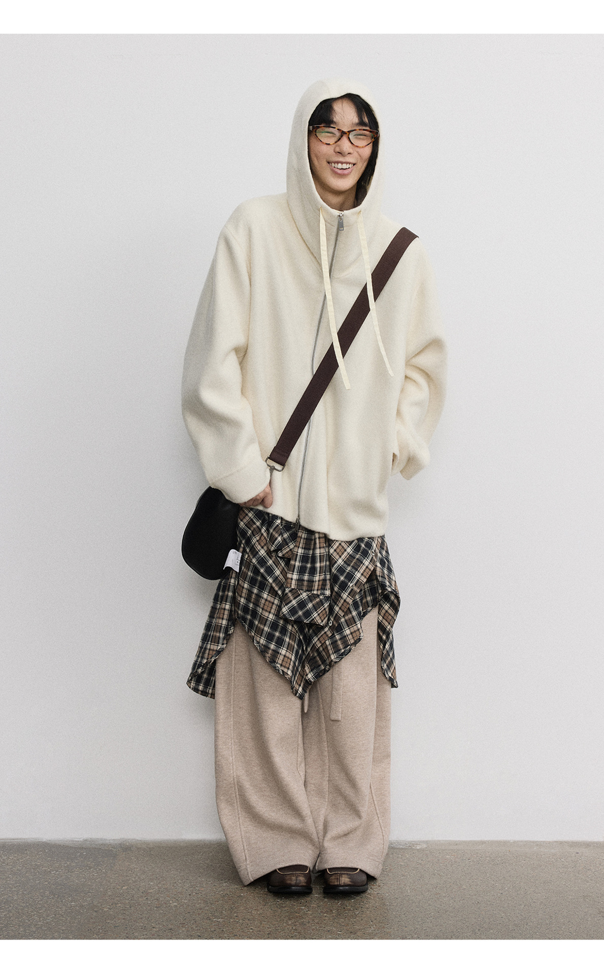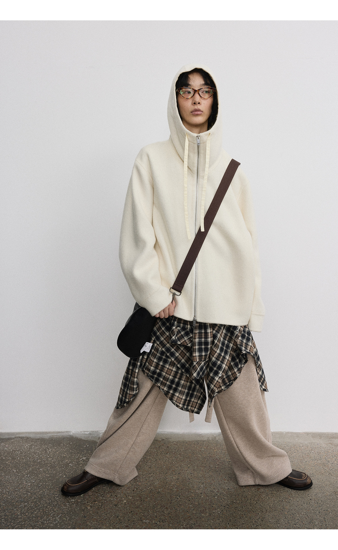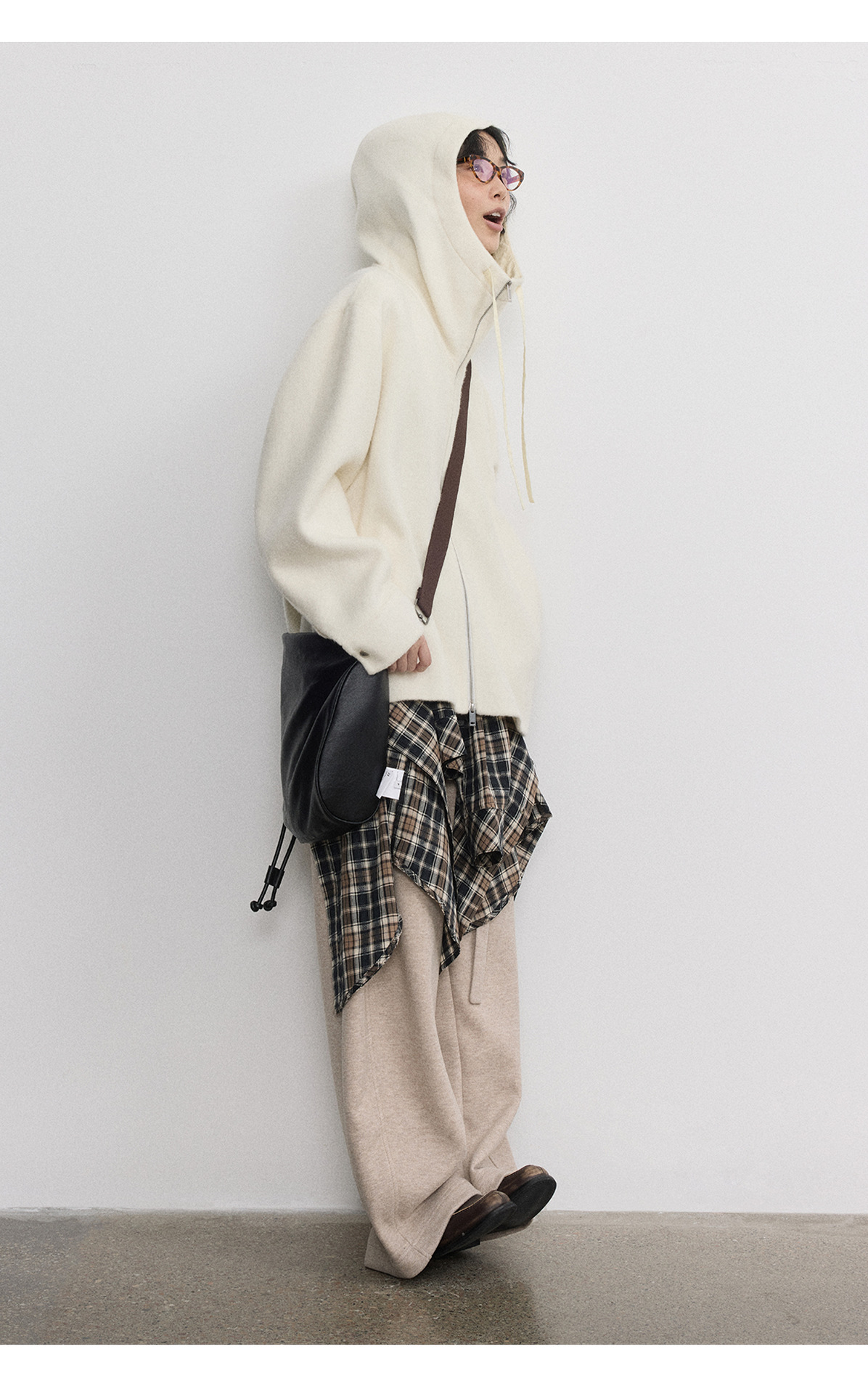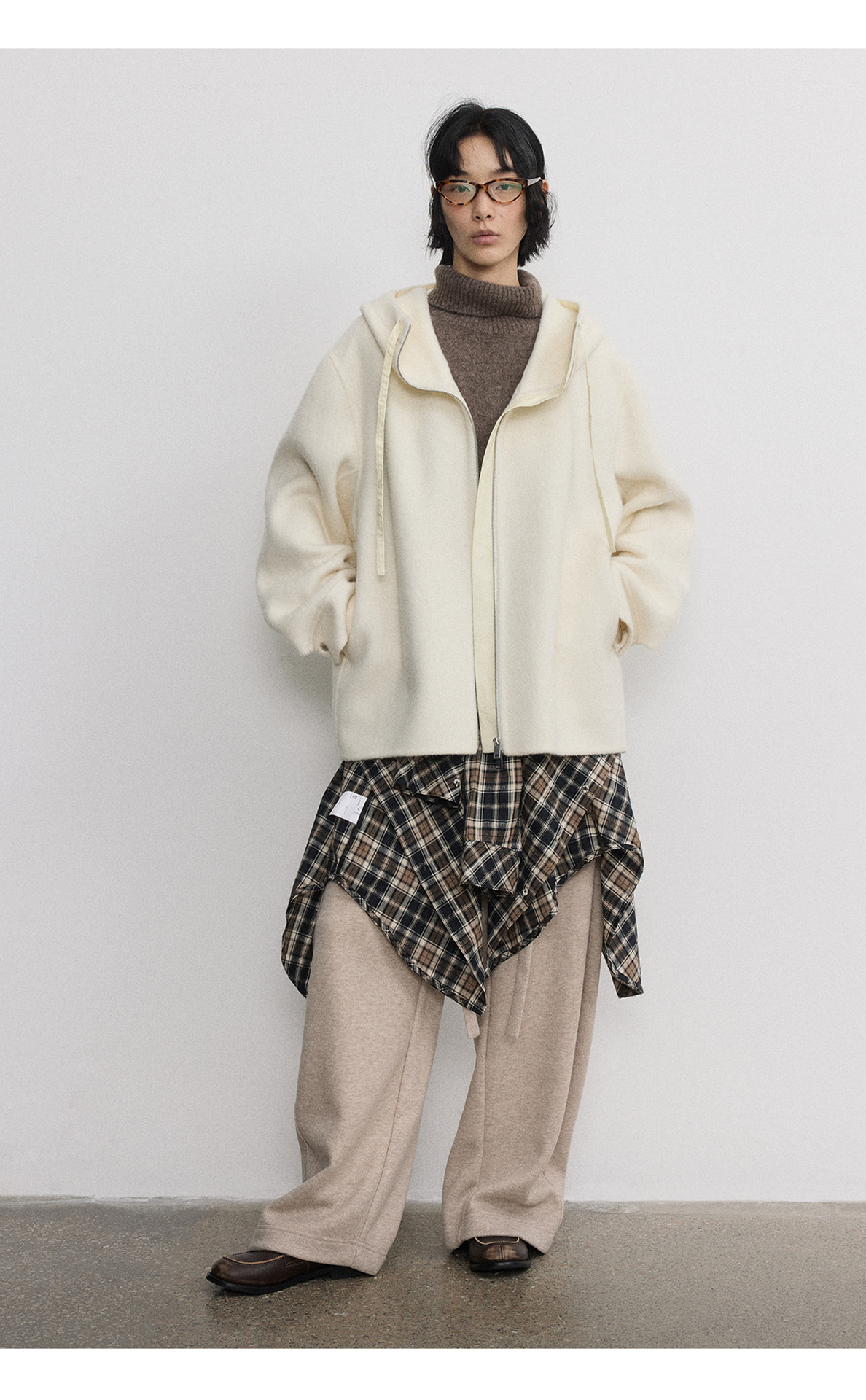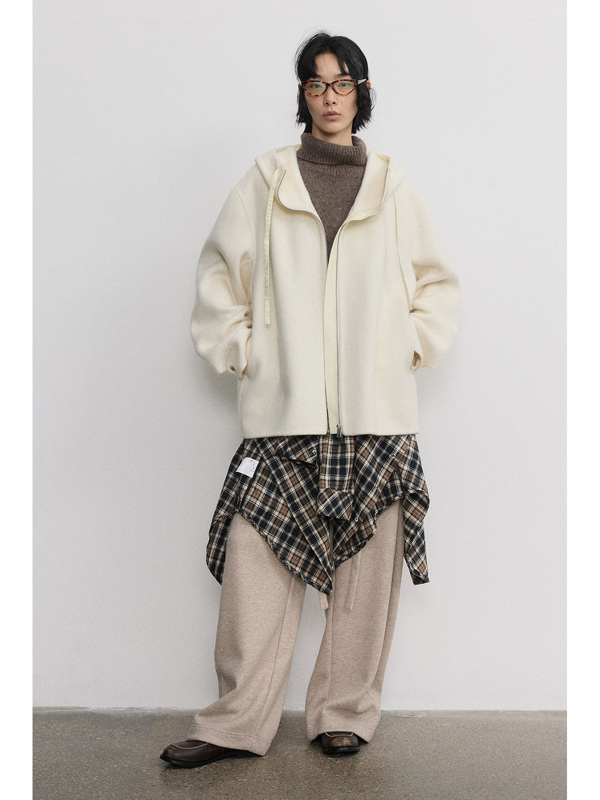 [시간] 새로운 모든 울 화이트 양면 트위드 조절 후드 스웨터 느슨한 지퍼 재킷 여성 V7550A