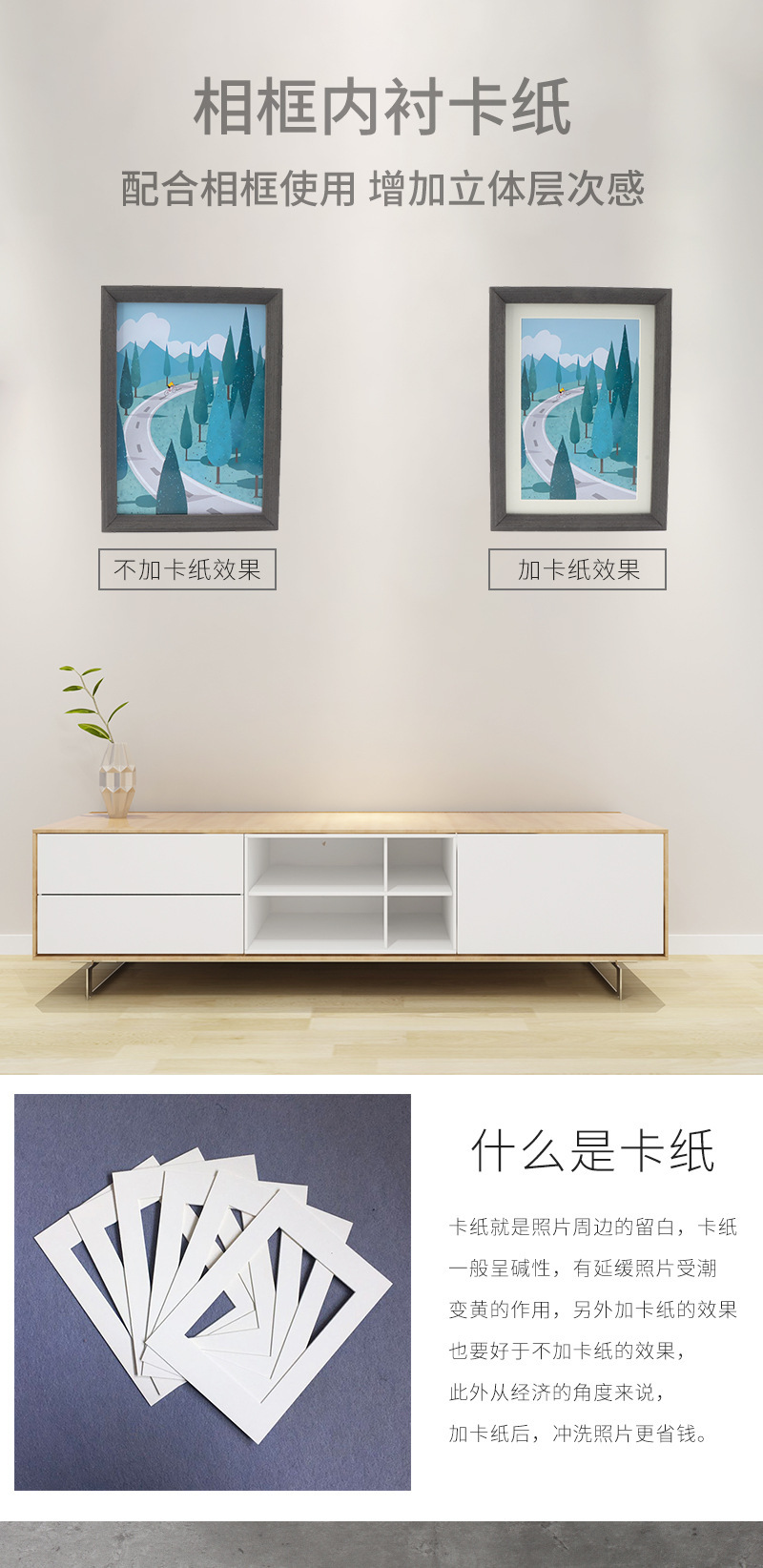 相框卡纸是相框的内衬纸,是相框的可选配件,简称卡纸或相框内衬卡纸。