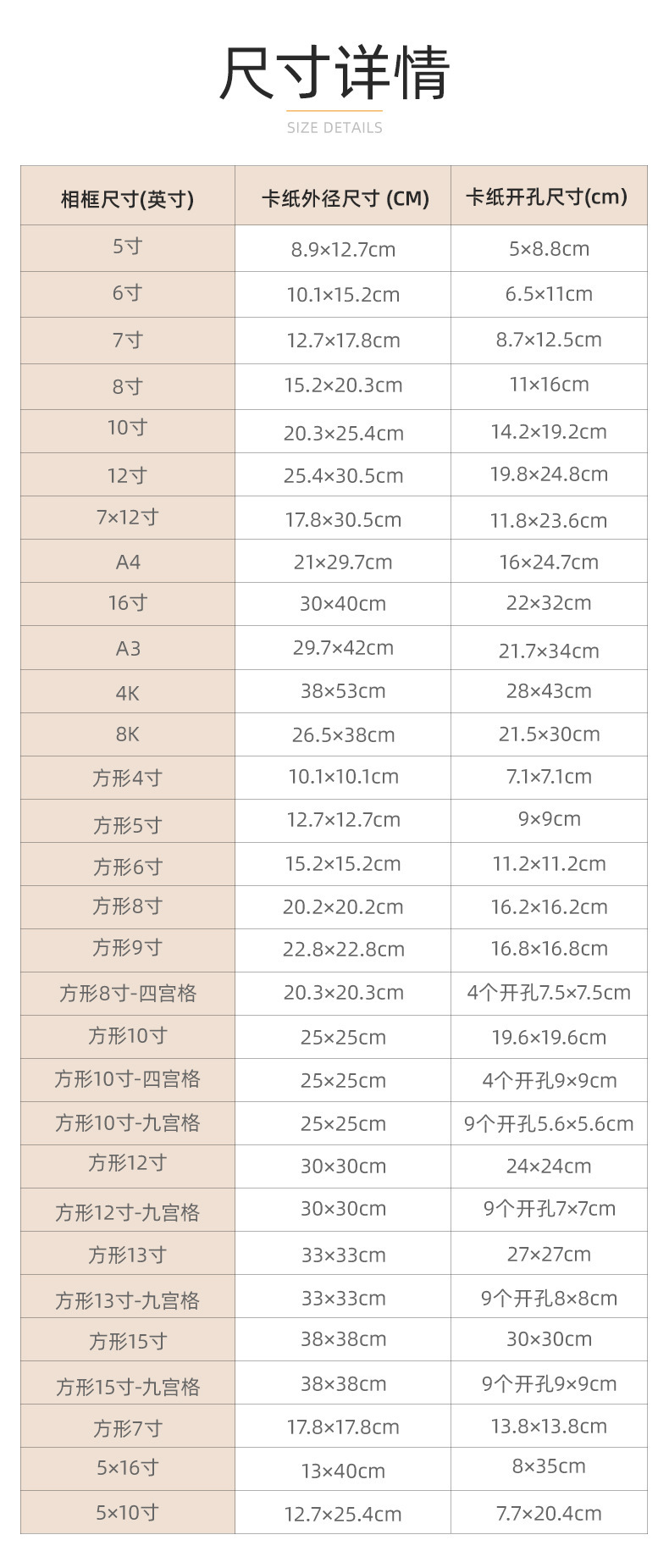 规 格:6寸及以上尺寸适用(6寸以下框较小,不适合加卡纸)。