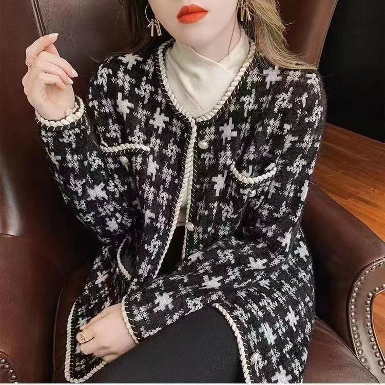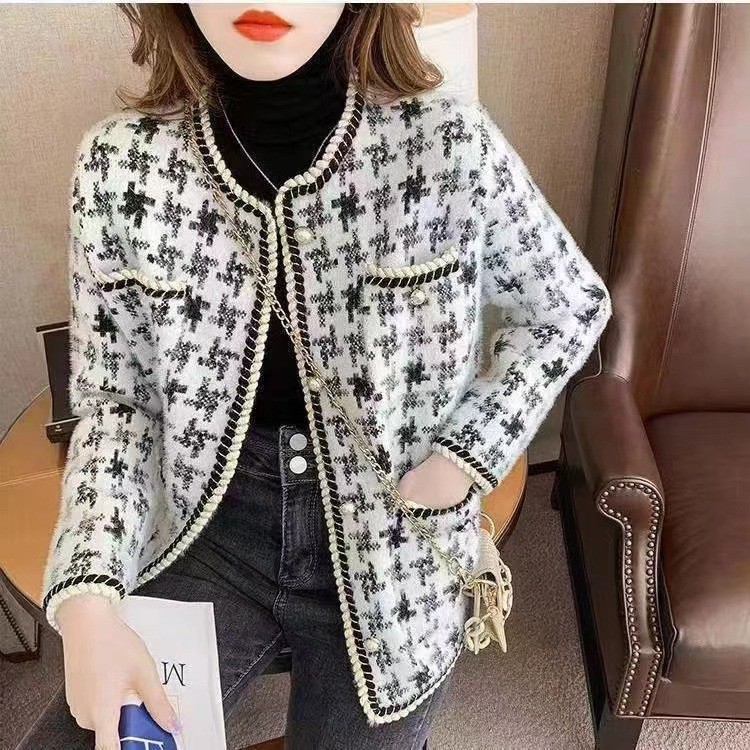 인터넷 축하 샤넬 스타일 카디건 코트 두꺼운 따뜻한 가을과 겨울 니트 스웨터 콜드 스타일 간단한 올 매치 모직 코트