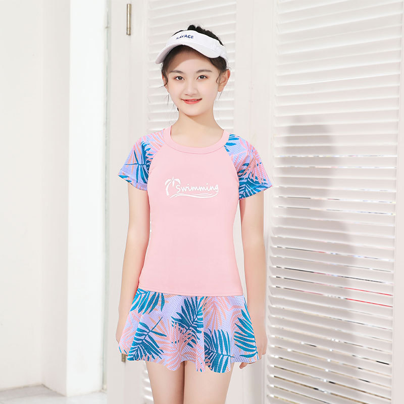 여자 수영복 스포츠 바느질 분할 짧은 소매 태양 보호 중형 및 대형 어린이 수영복 가슴 패드 어린이 빠른 건조 학생 수영복