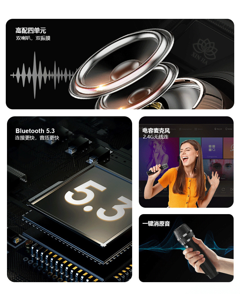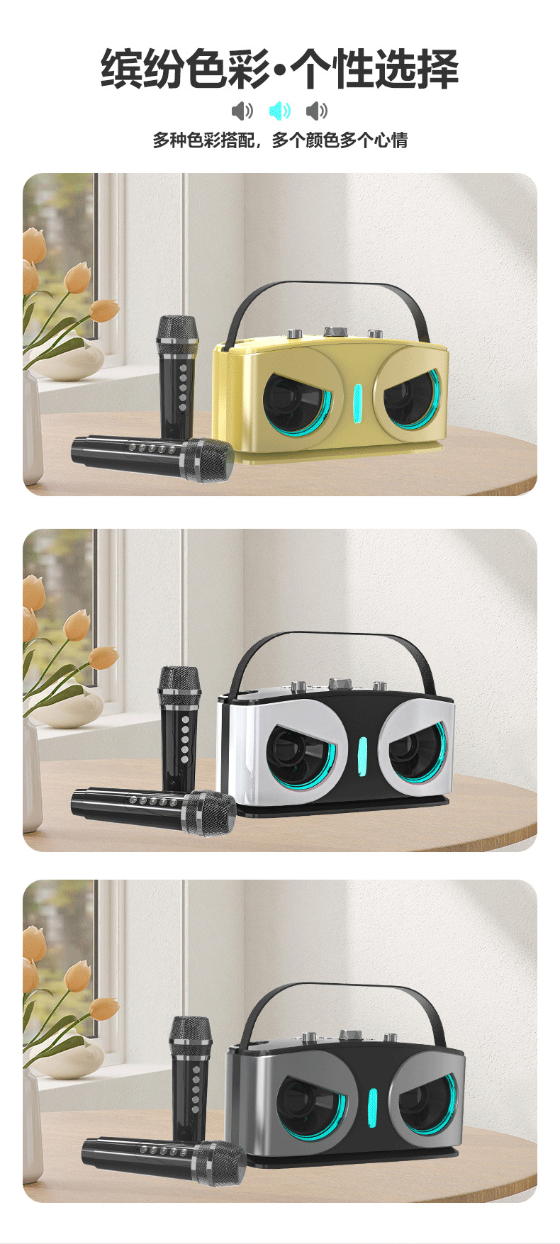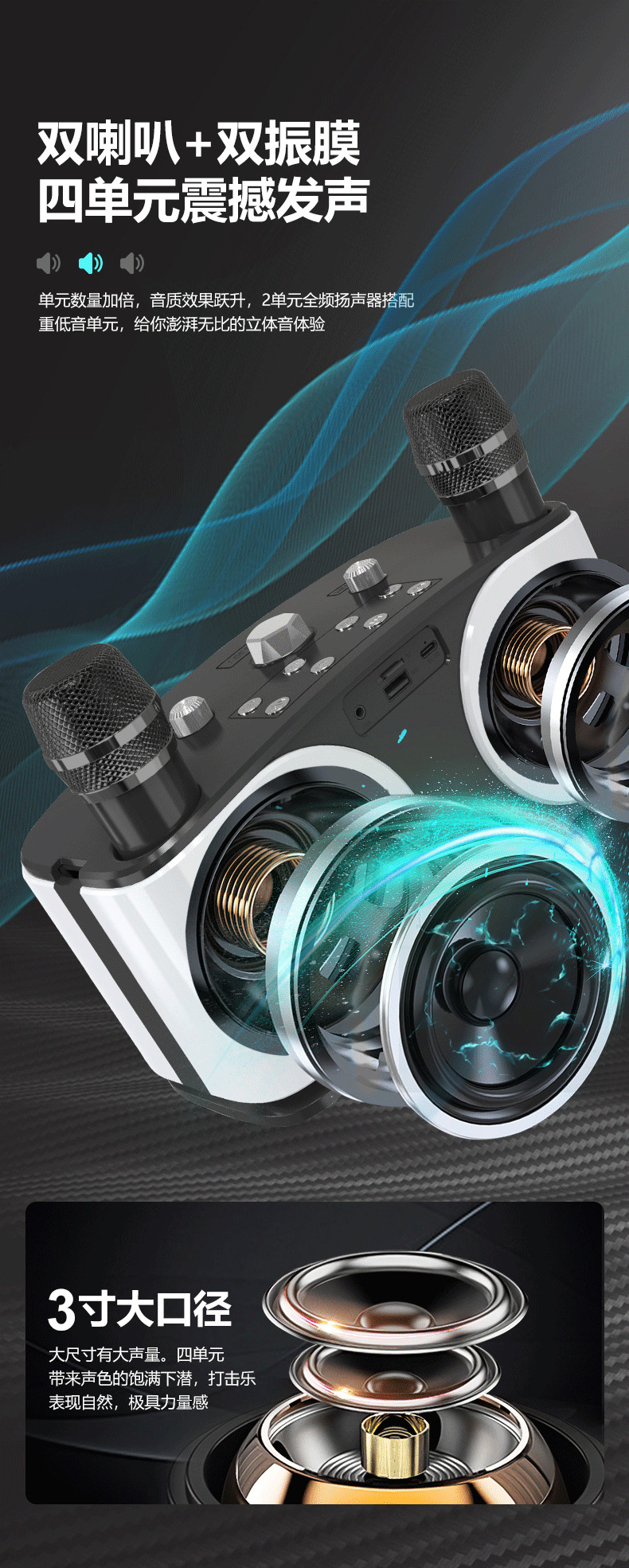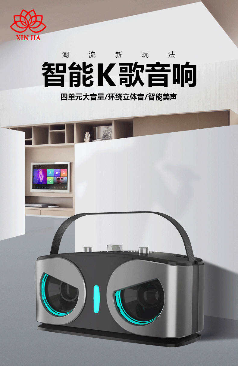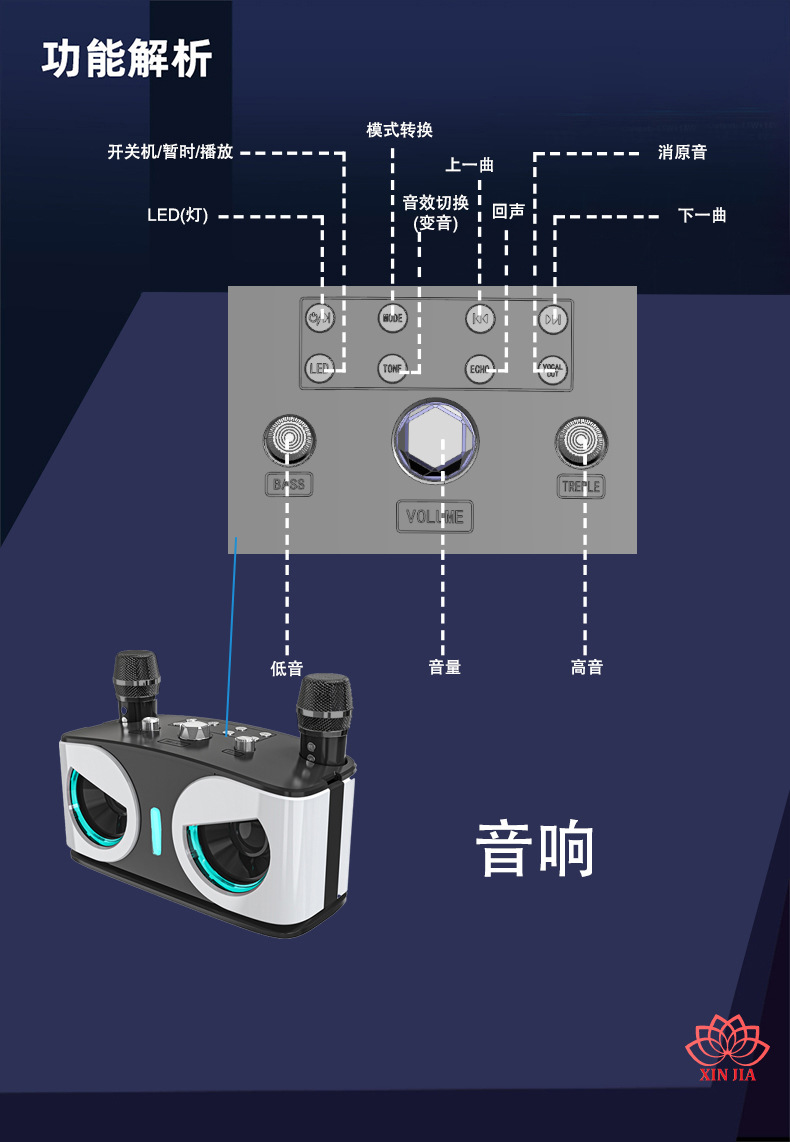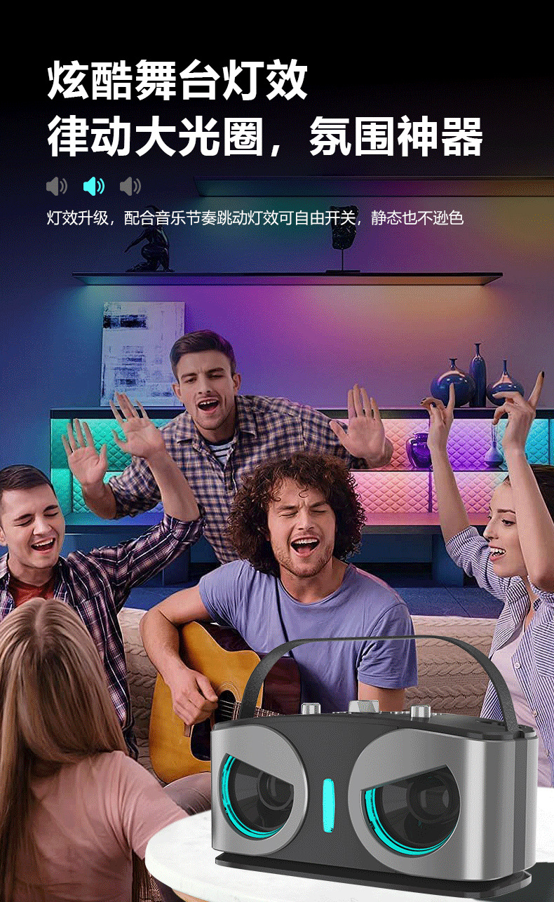 产品功能:蓝牙、TF卡、 USB 、AUX 、 K歌、 LED灯、 变音魔音、消原音