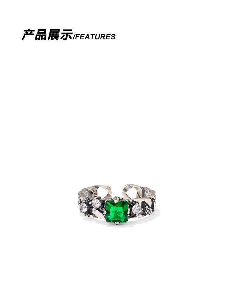 단 하나의 실버 앤티크 레트로 다이아몬드로 장식 된 그린 지르콘 링 남성과 여성을위한 힙합 패션 링 조정 가능한 오프닝스토어 가기