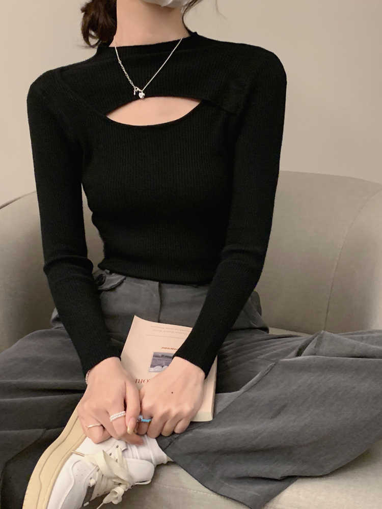 하프 터틀넥 할로우 슬림 핏 슬림 핏 긴팔 스웨터 탑 가을 및 겨울 블랙 스웨터 여성베이스 셔츠