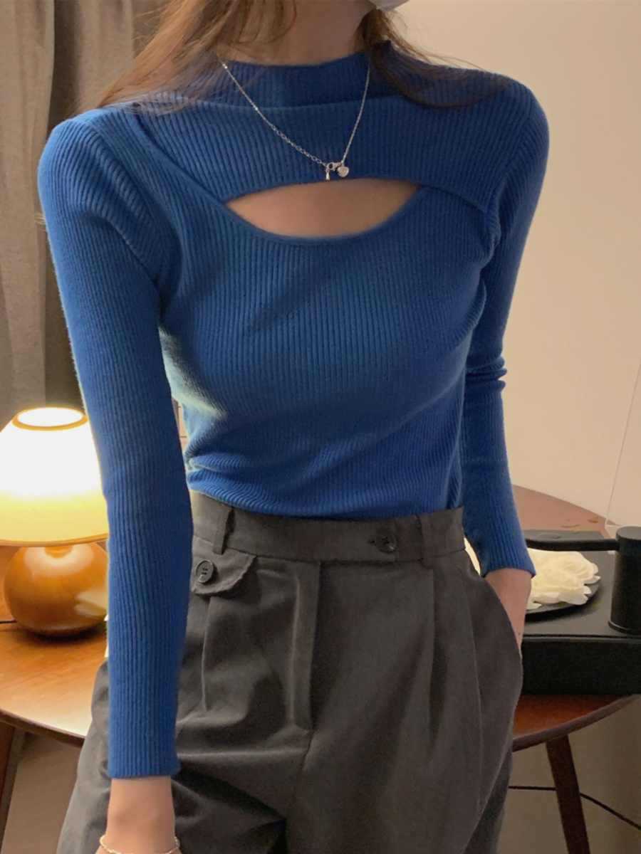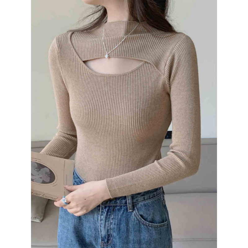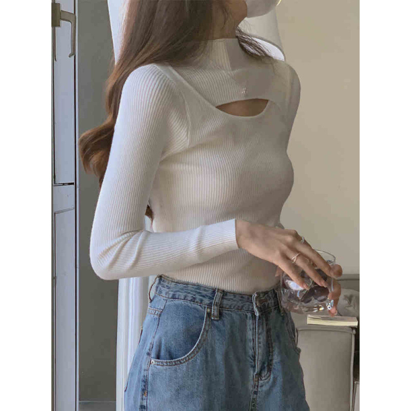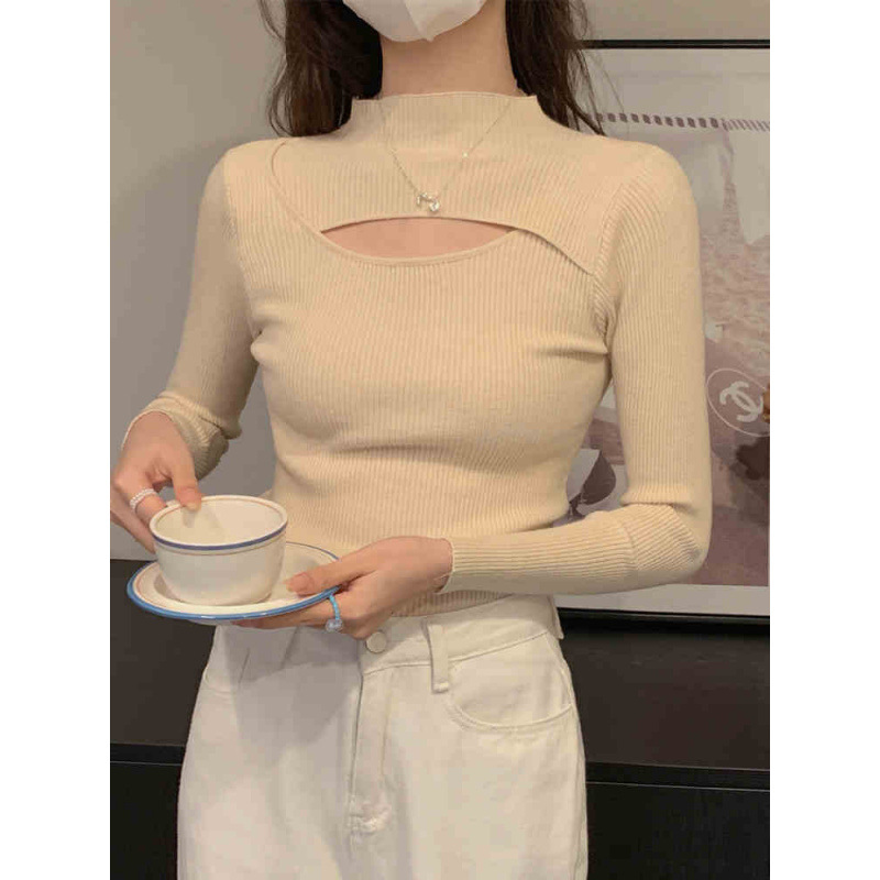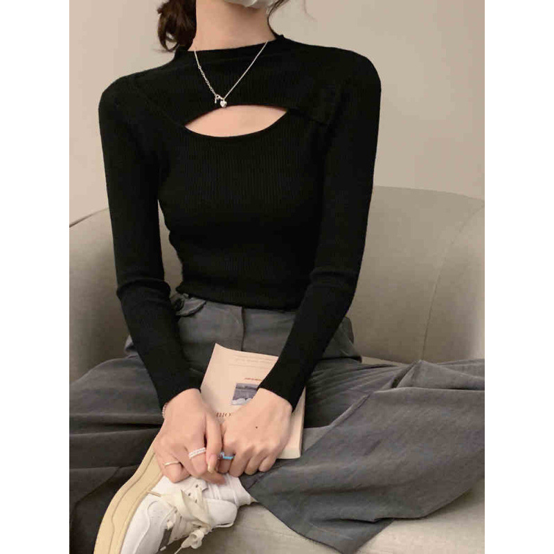하프 터틀넥 할로우 슬림 핏 슬림 핏 긴팔 스웨터 탑 가을 및 겨울 블랙 스웨터 여성베이스 셔츠스토어 가기