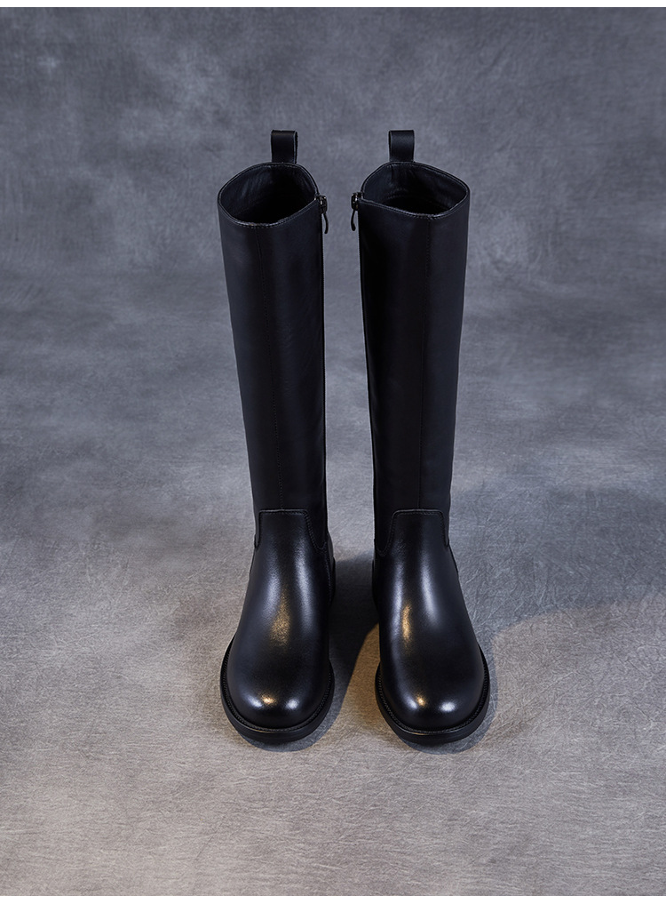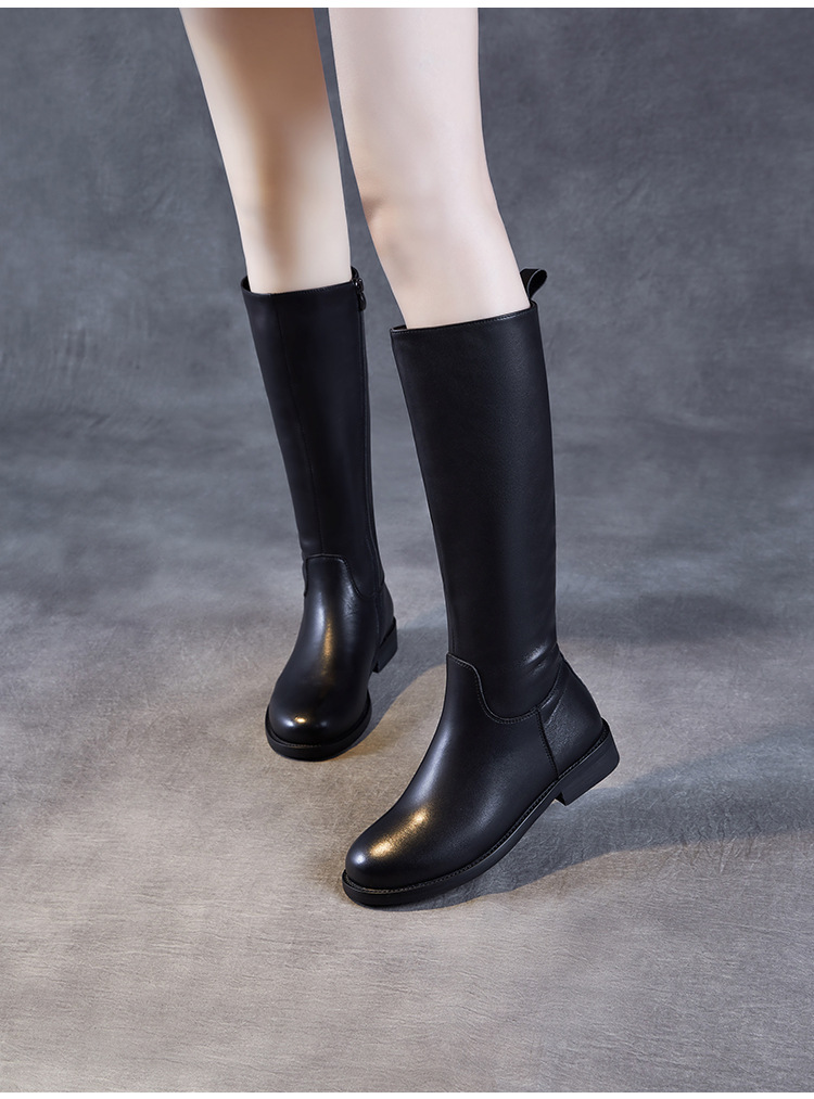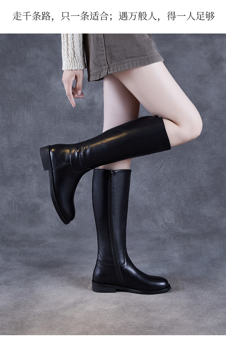 정품 가죽이지만 무릎 긴 부츠 여성의 2024 새로운 가을 및 겨울 옆 지퍼 슬리밍 플랫 롱 하이 기모 라이더 부츠