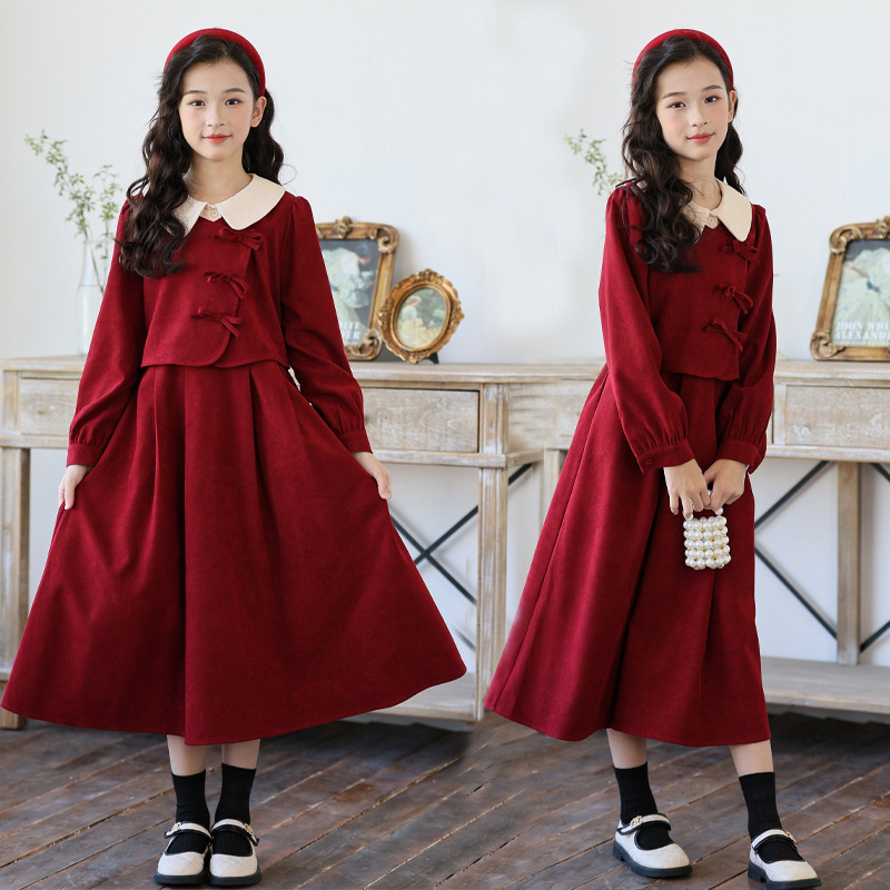 어린이 의류 소녀 붉은 원피스 2024 가을과 겨울 복고풍 허리 스커트 큰 어린이 대비 컬러 칼라 국가 스타일 새해 빨간 치마
