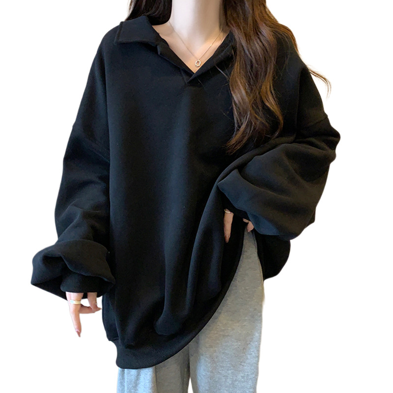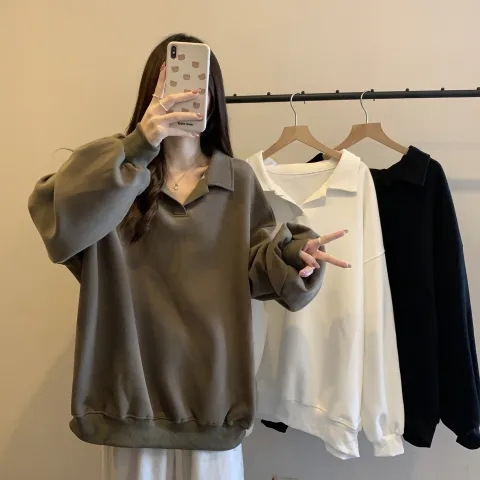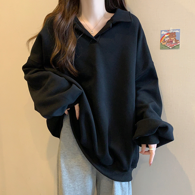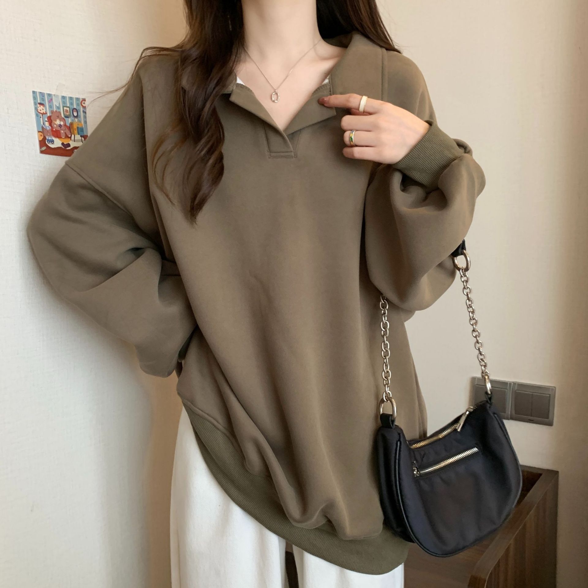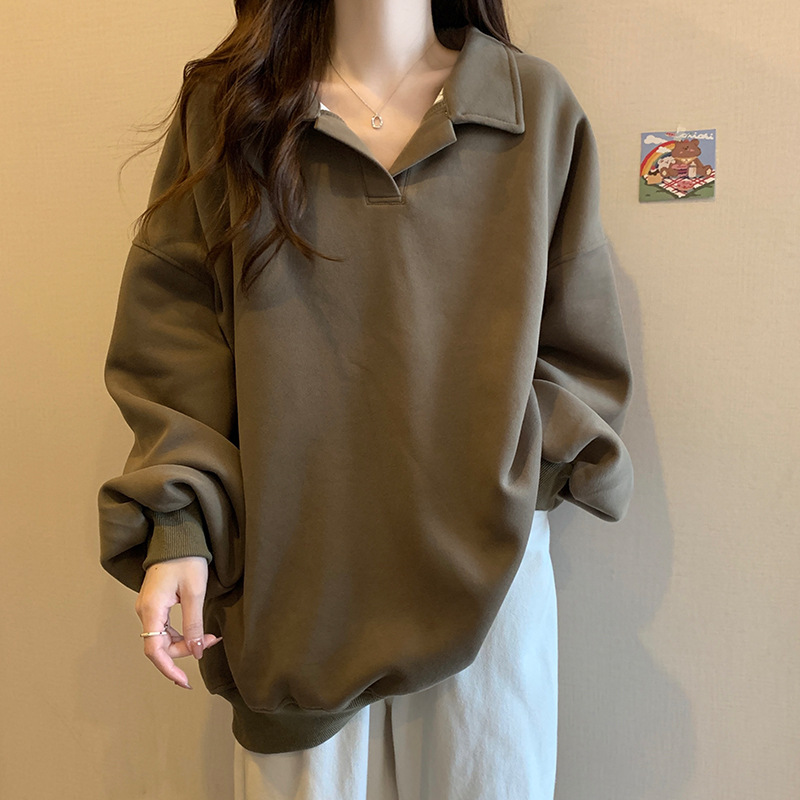 플러스 사이즈 여성용 배꼽 게으른 느슨한 긴소매 기지 셔츠 가을과 겨울 통통녀 슬리밍 폴로 칼라 프렌치 스웨터스토어 가기