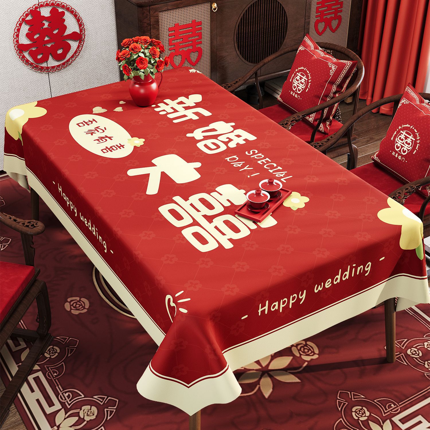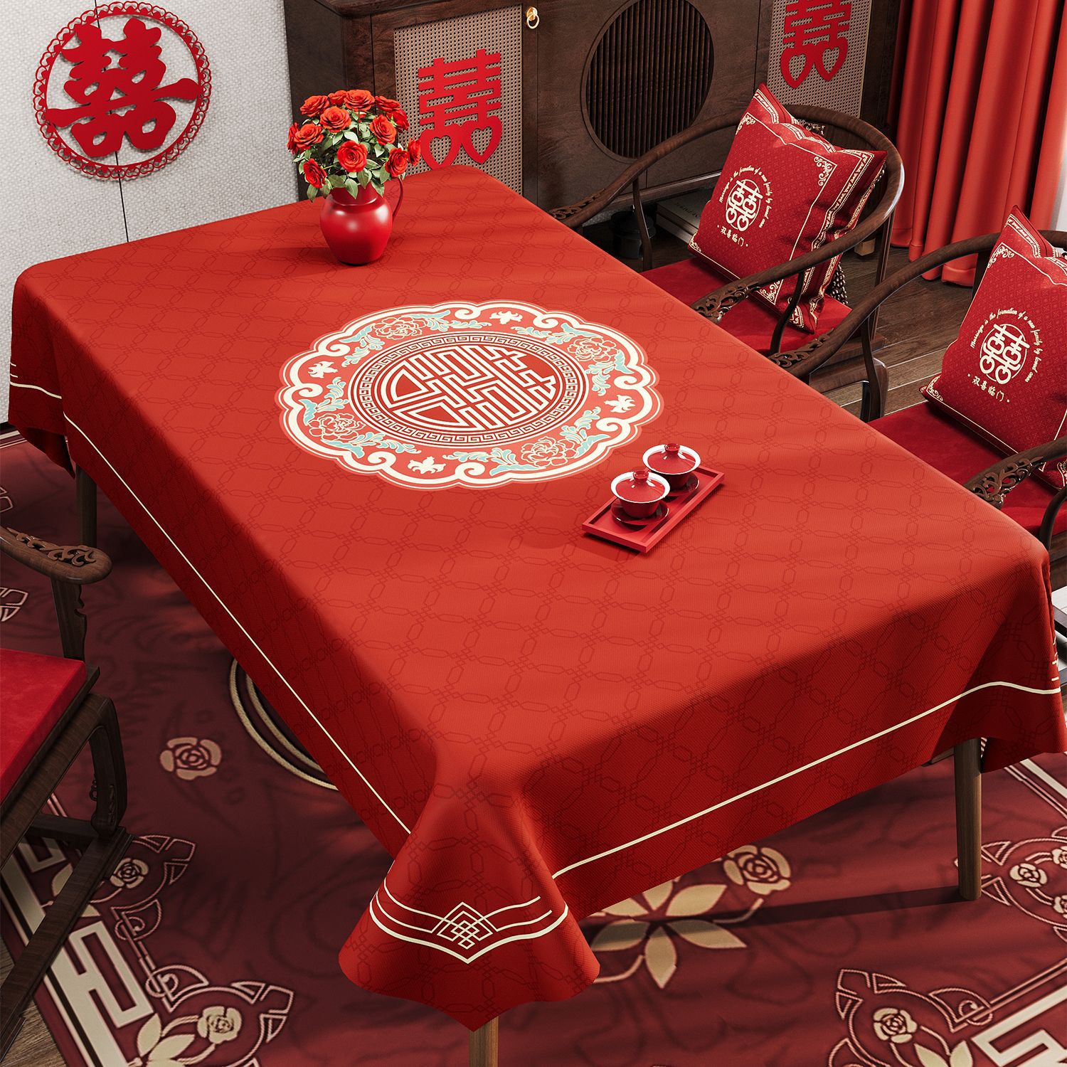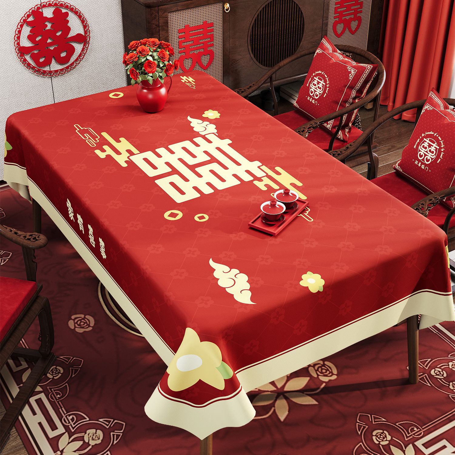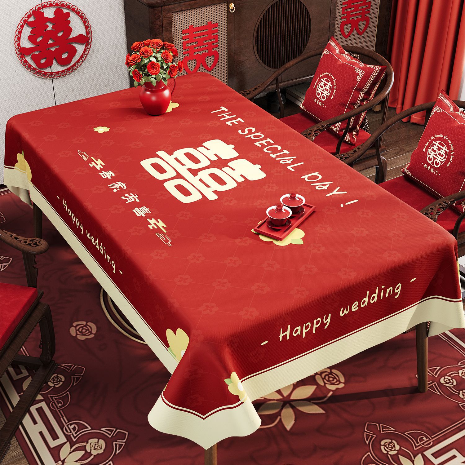 웨딩 레드 식탁보 오일 방지 방수 방수 워시프리 라이트 럭셔리 하이 엔드 센스 2024 새로운 식탁 용 식탁보 가정용 커피 테이블 테이블 테이블 테이블 테이블