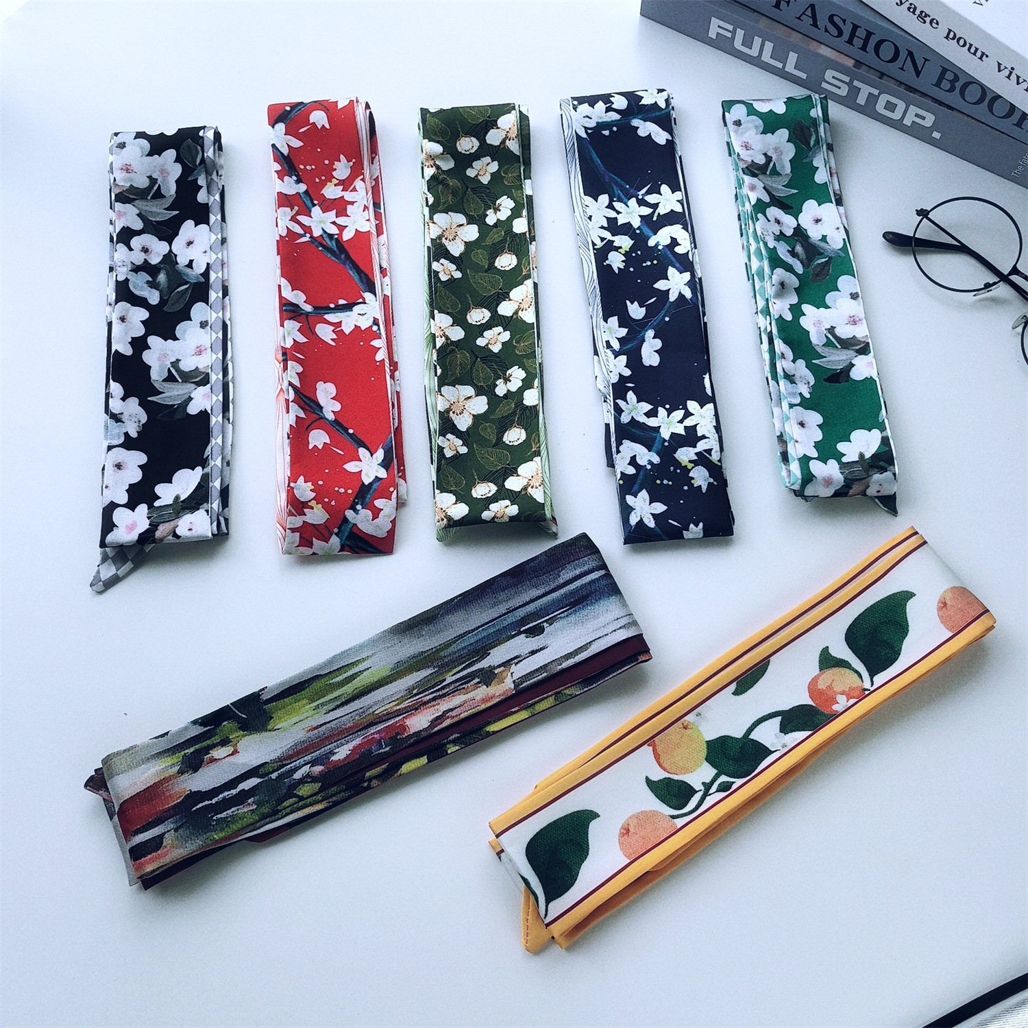 2024 새로운 한국 스타일 얇은 좁은 긴 스카프 꽃 인쇄 스카프 더블 레이어 발목 스카프 헤어 액세서리 넥타이 가방 국경 여성스토어 가기