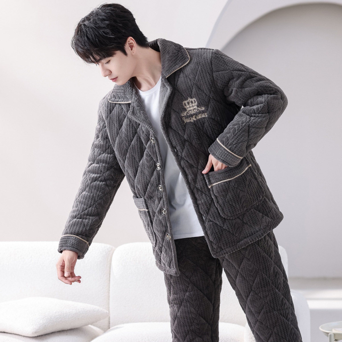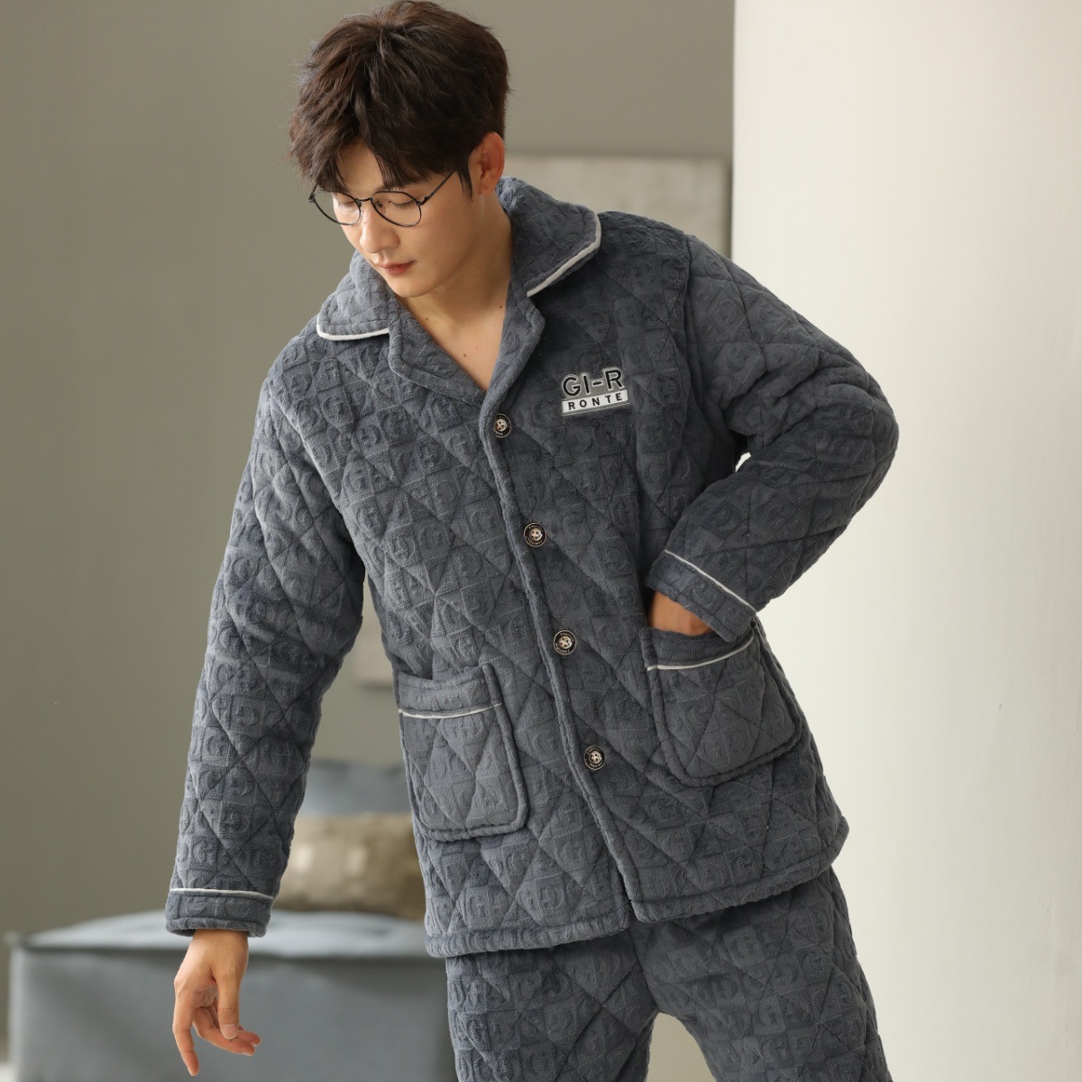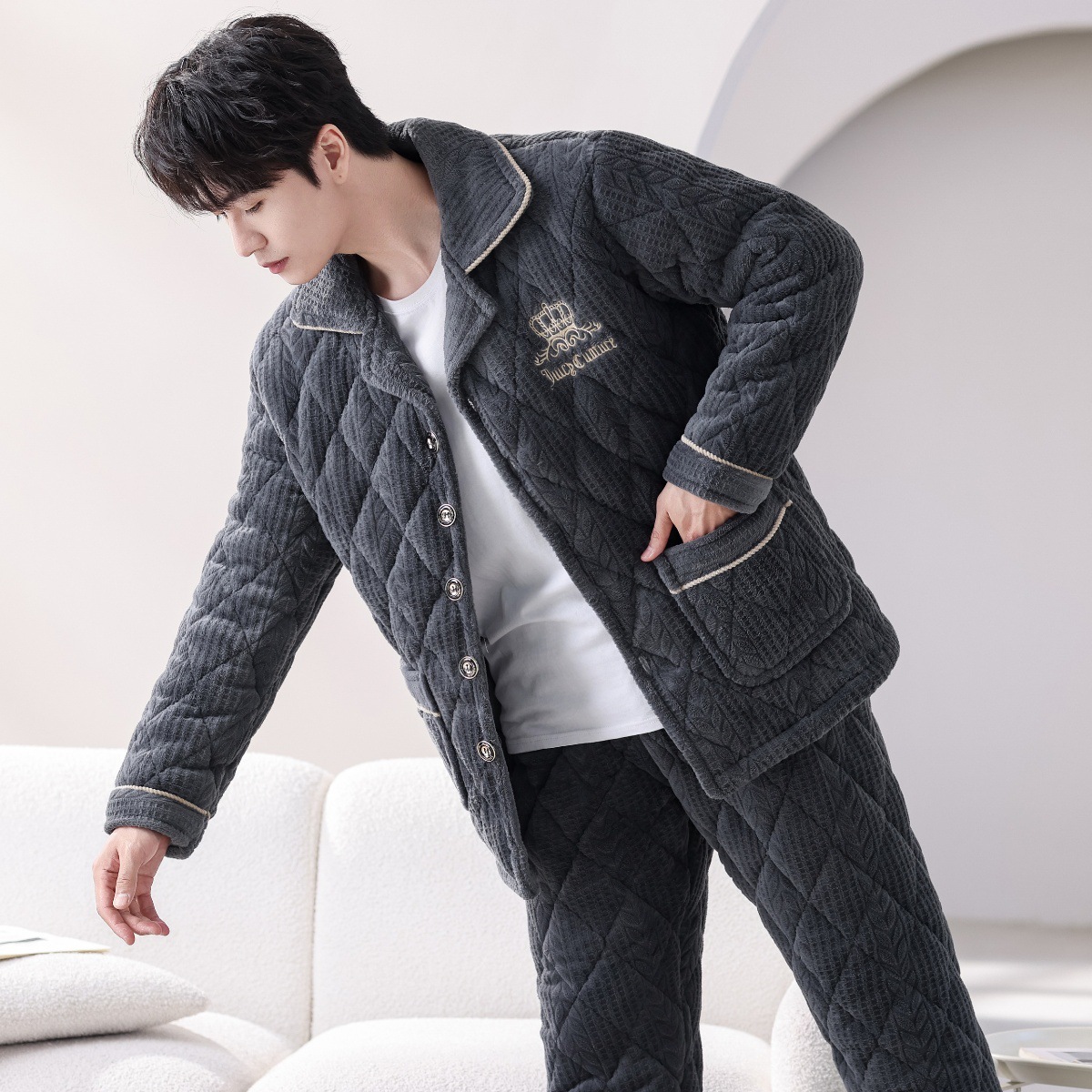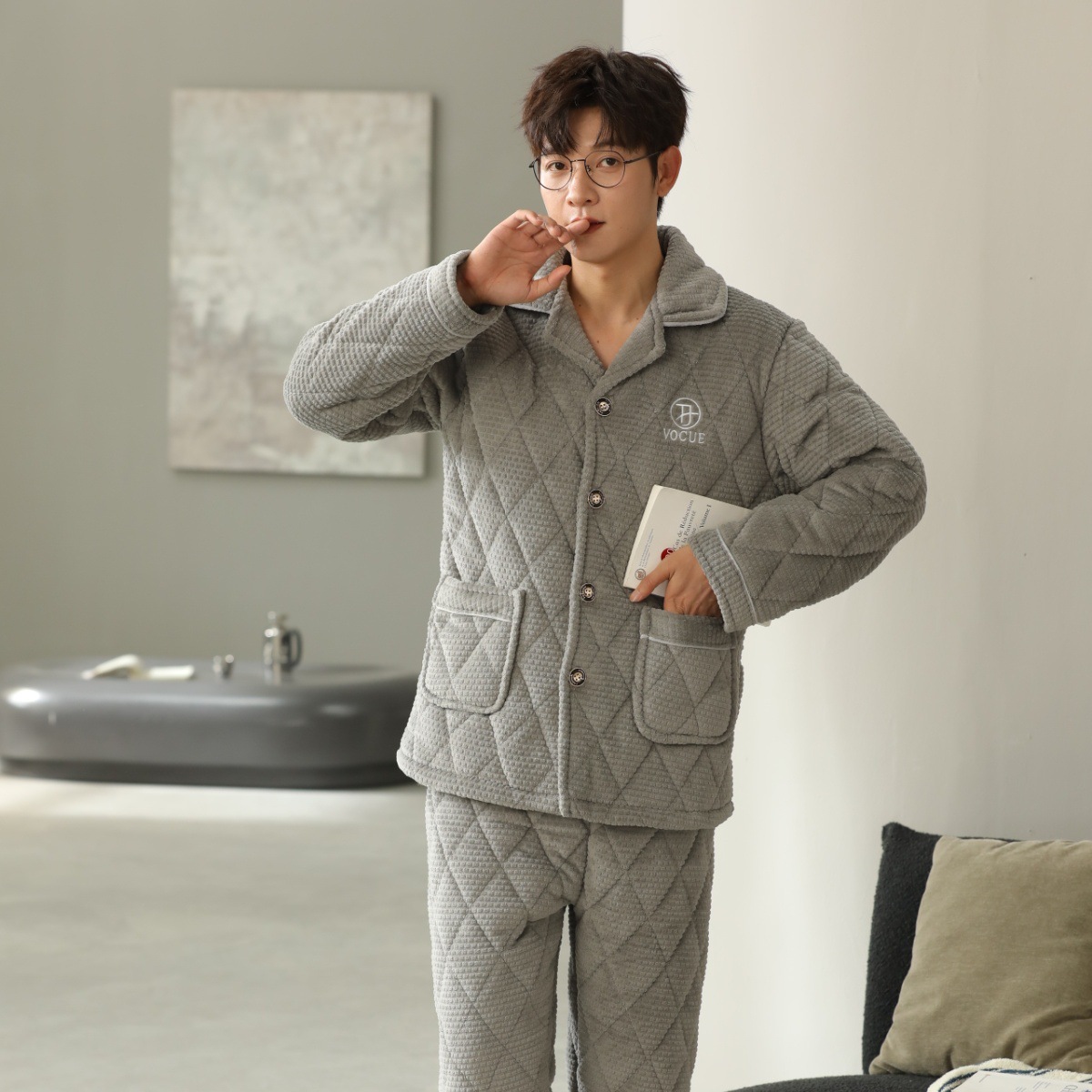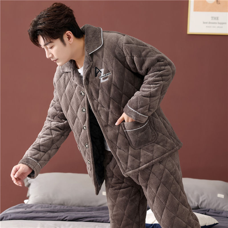 잠옷 남자 겨울 3 층 두꺼운 산호 양털 퀼트 따뜻한 기모 우유 양털 홈 옷 세트 가을과 겨울
