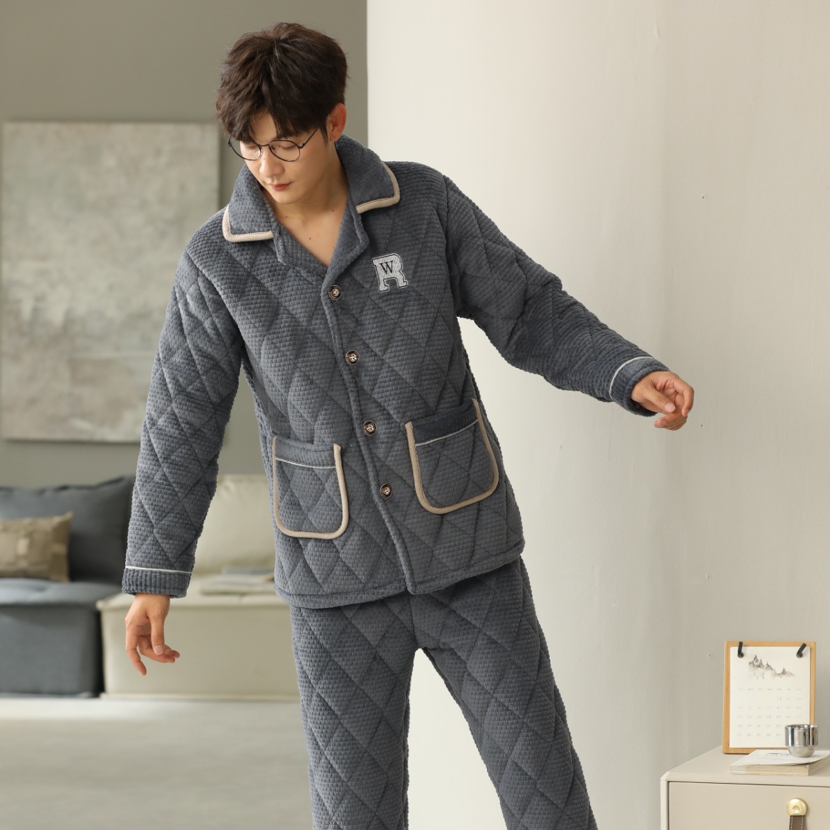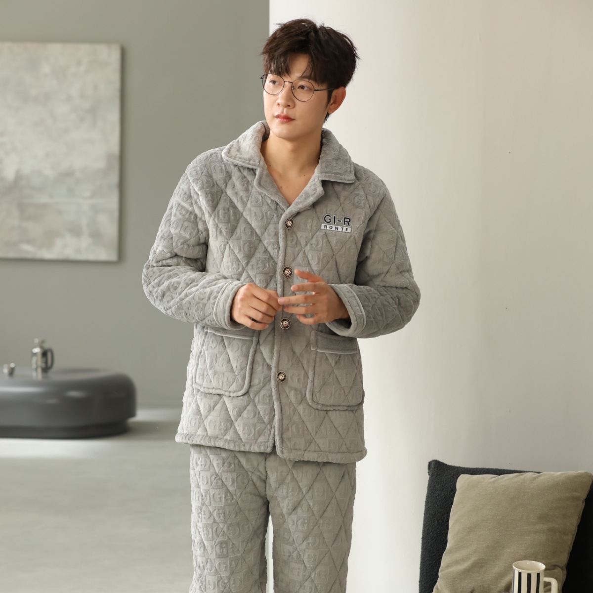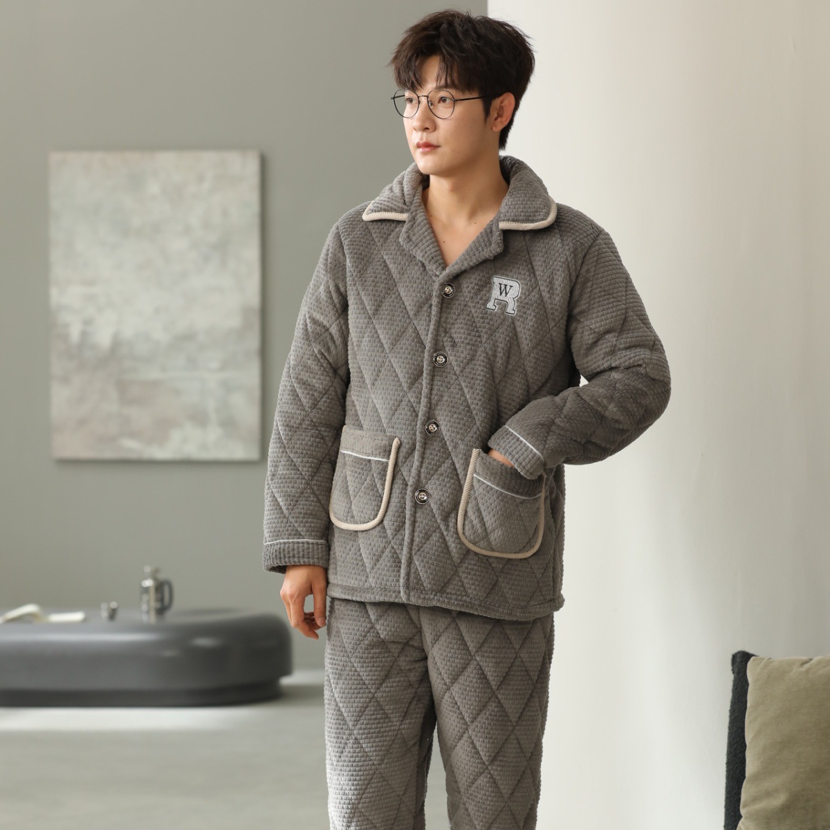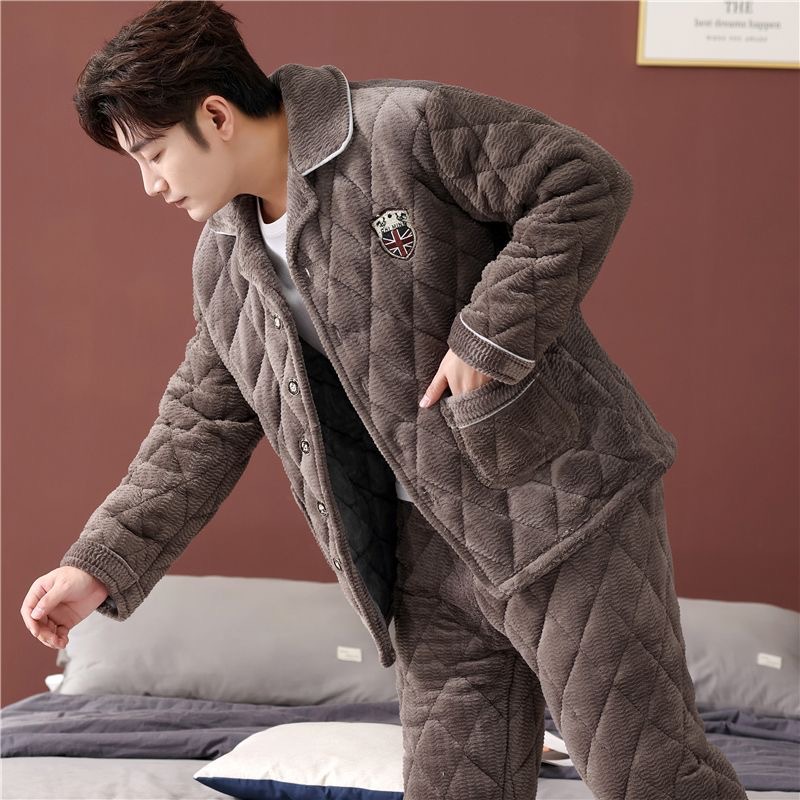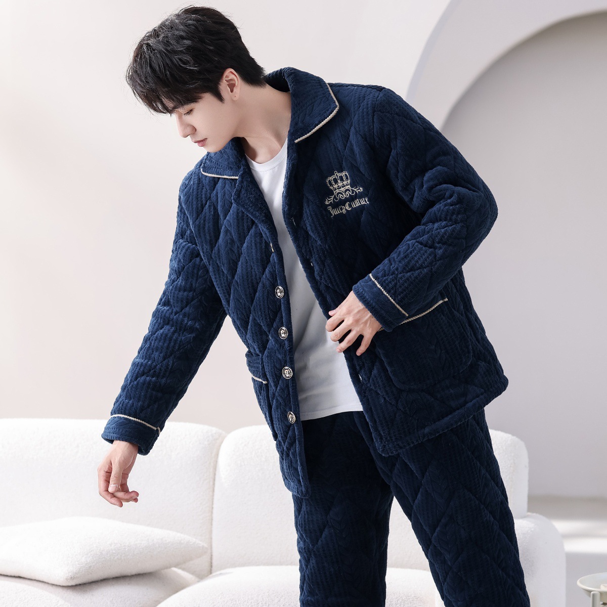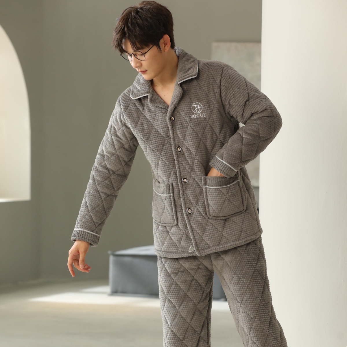 잠옷 남자 겨울 3 층 두꺼운 산호 양털 퀼트 따뜻한 기모 우유 양털 홈 옷 세트 가을과 겨울