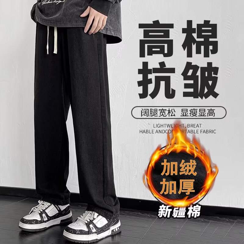 두꺼운 청바지 남자의 2024 단색 가을과 겨울 느슨한 스트레이트 넓은 다리 캐주얼 겨울 기모 바지 남자의 봄