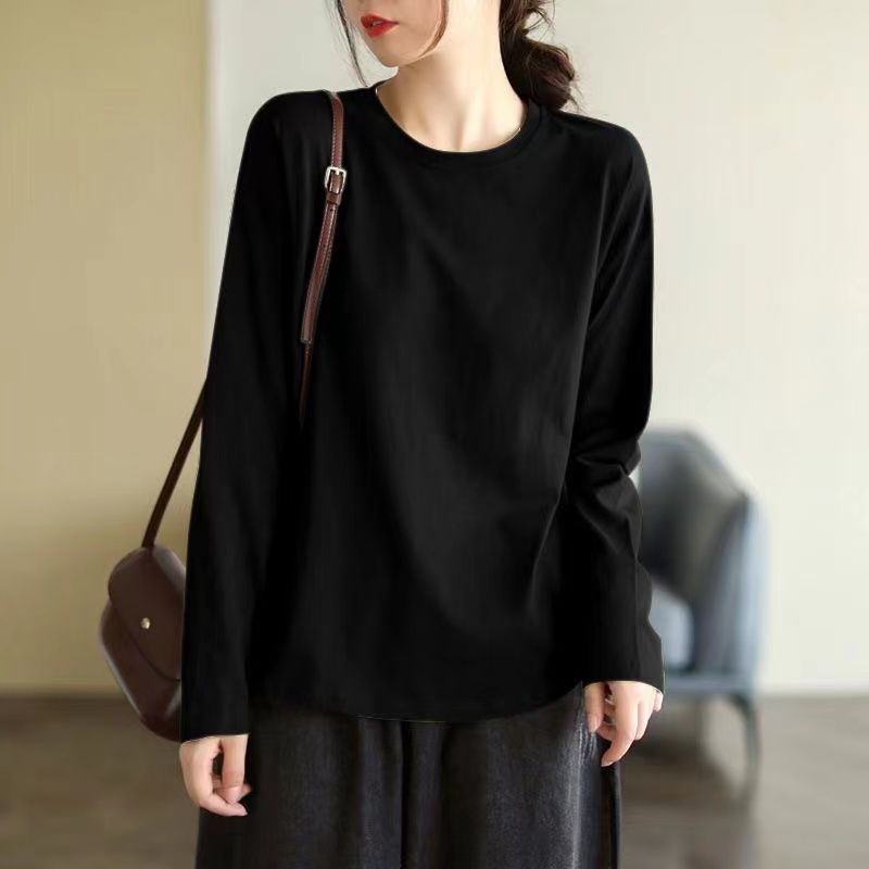 면 긴 소매 티셔츠 여성의 2024 가을 새로운 느슨한 플러스 사이즈 중간 길이의 둥근 목 단색 심플 탑