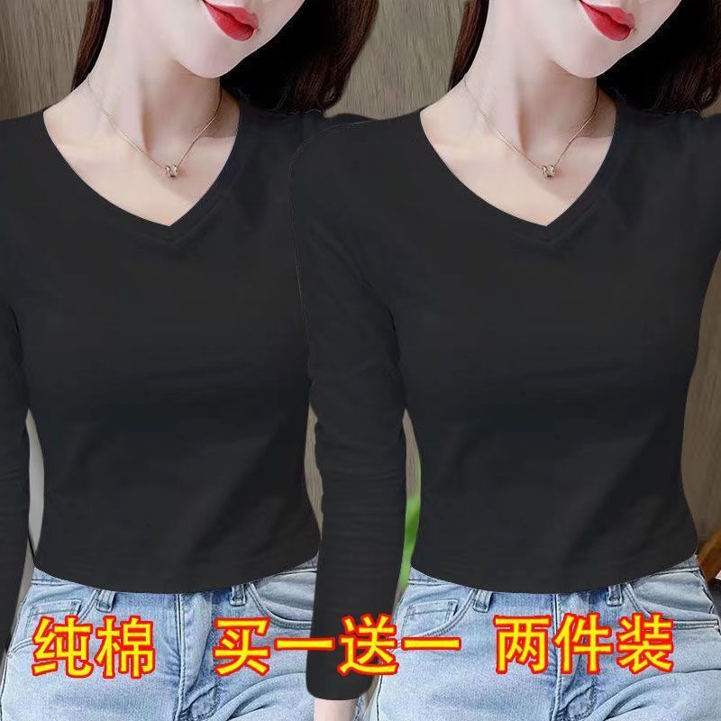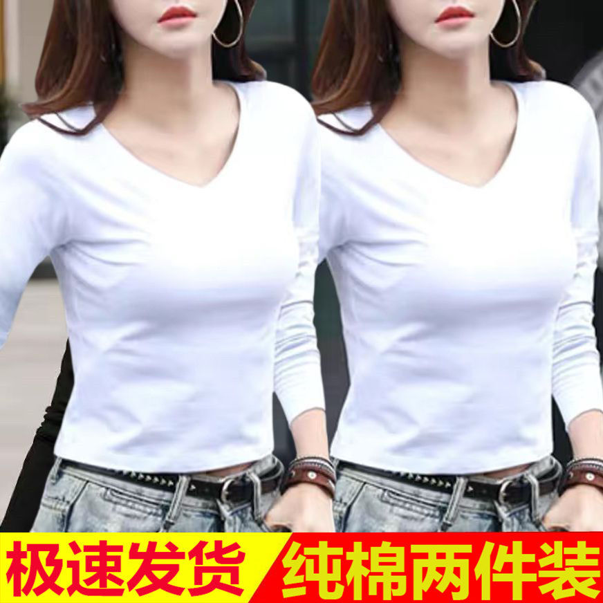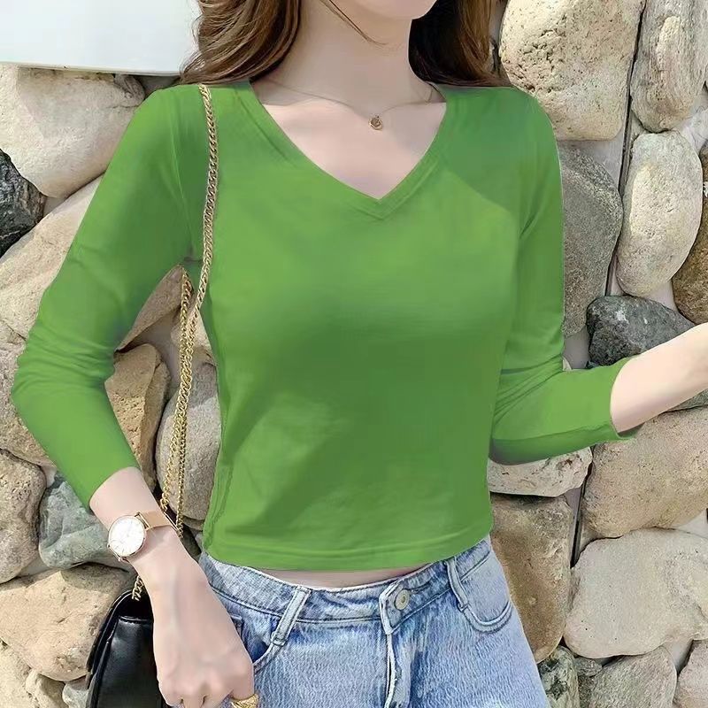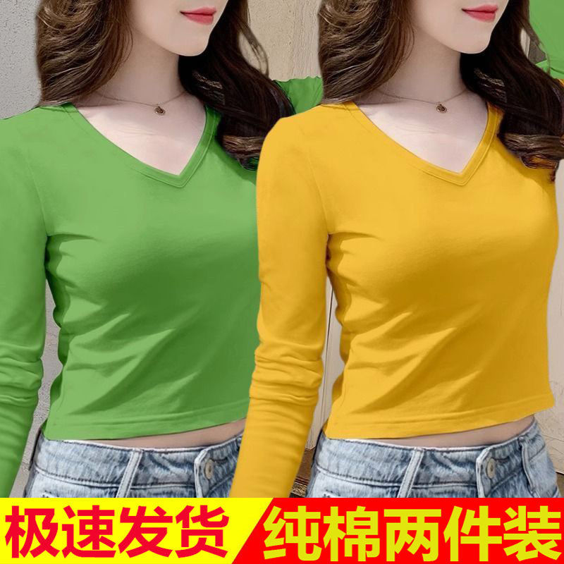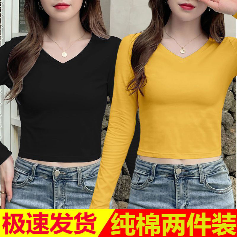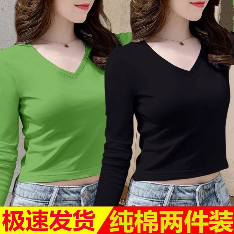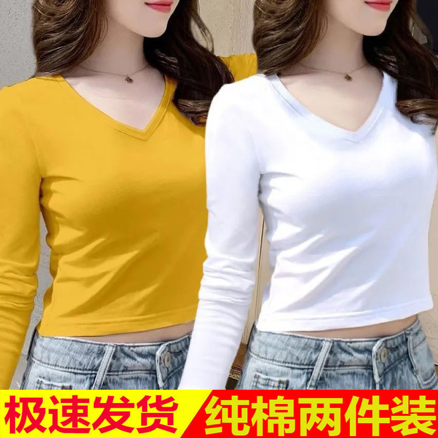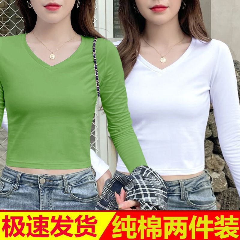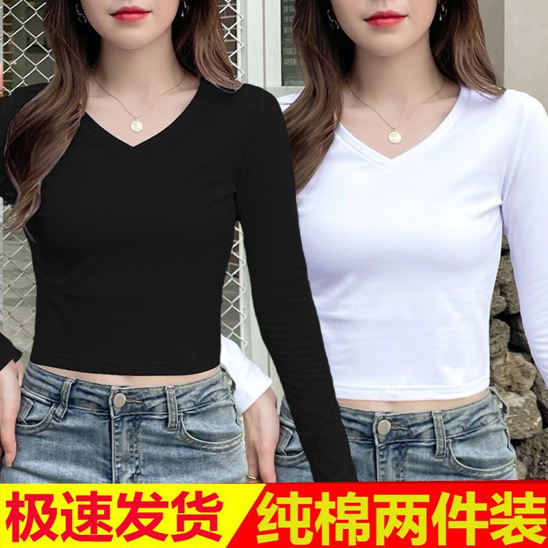 퓨어 코튼 긴팔 티셔츠 여자 2024 가을 겨울 새로운 올매치 쇼트 하이 웨이스트 V 넥 솔리드 컬러 탑 인 트렌디스토어 가기