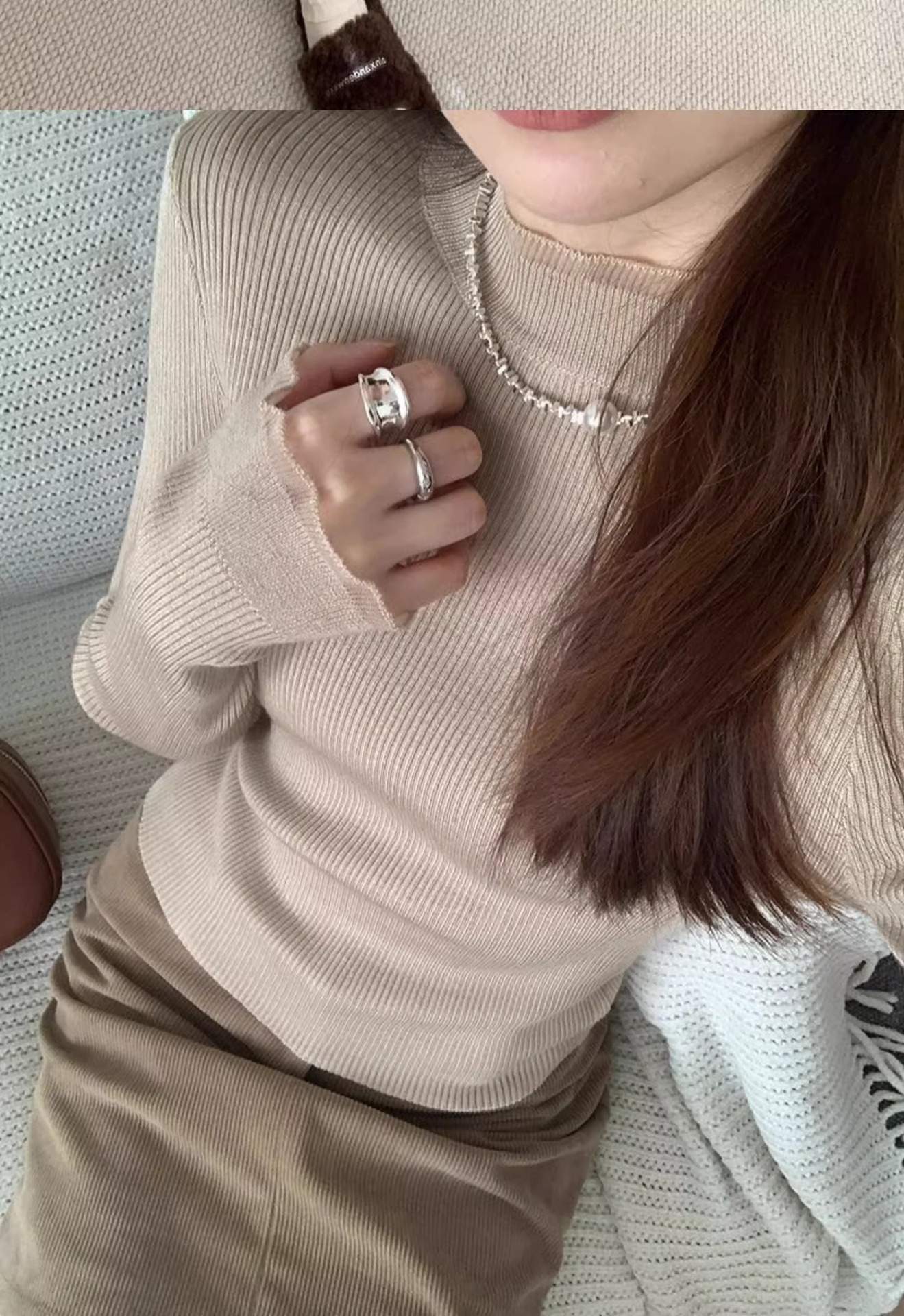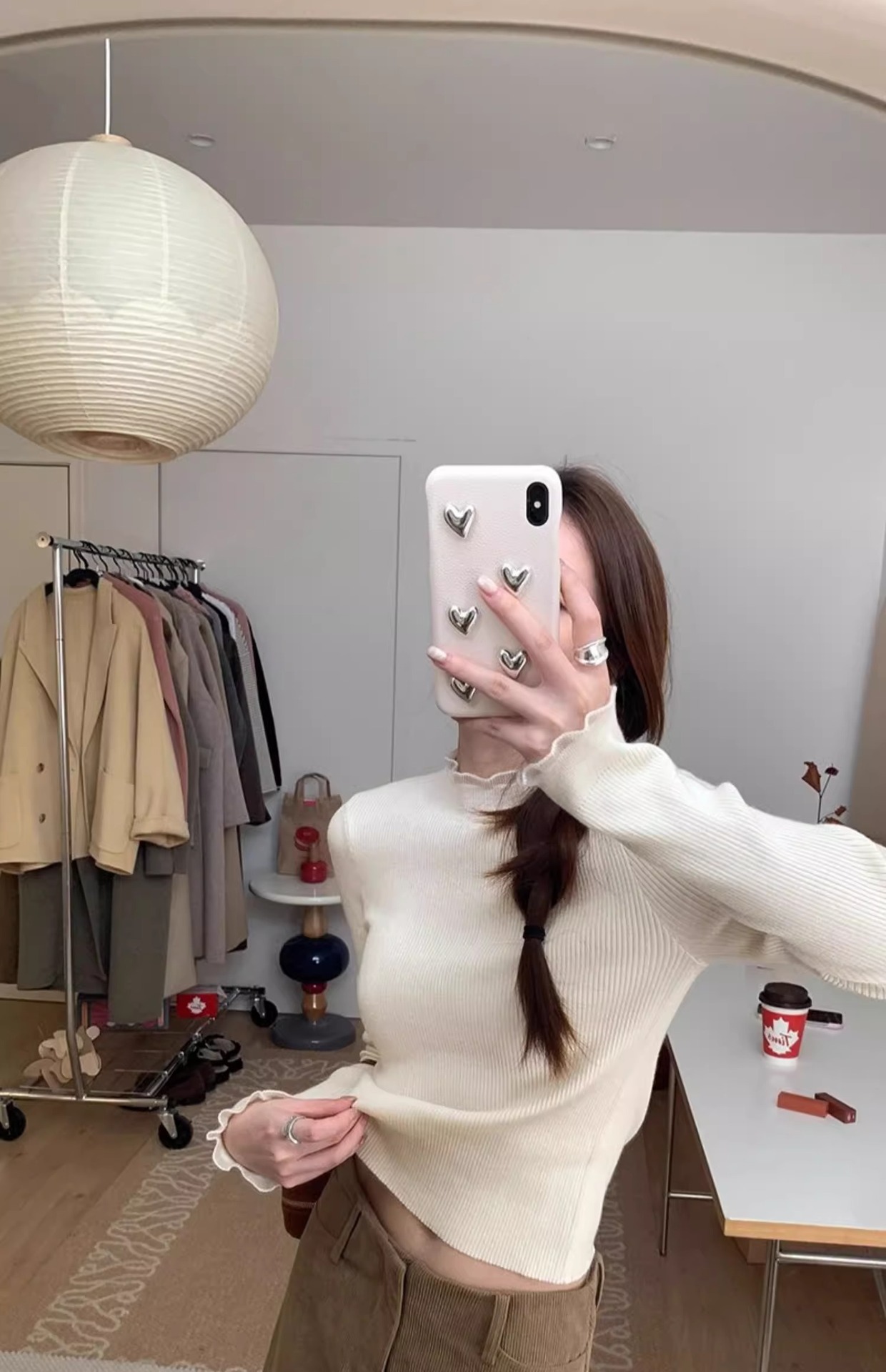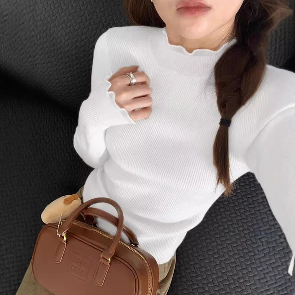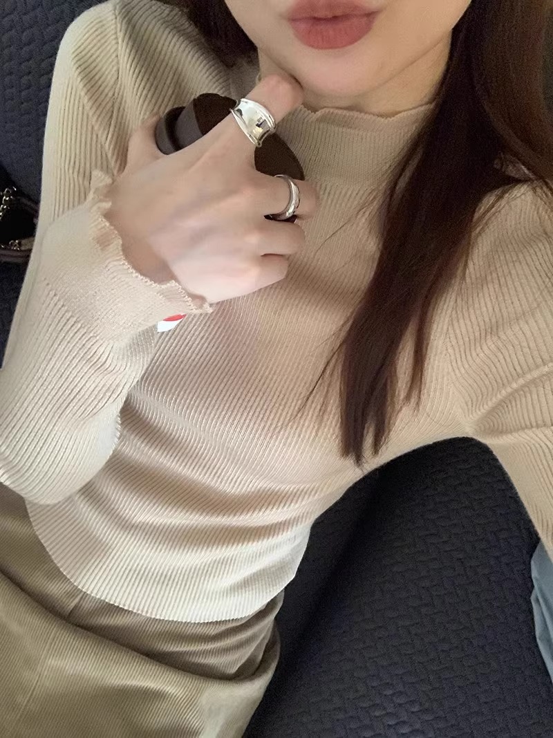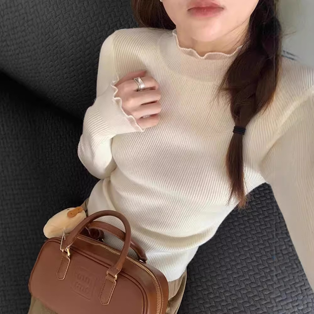 6016#半高领毛衣打底衫女秋冬新款高级感内搭长袖针织木耳边上衣