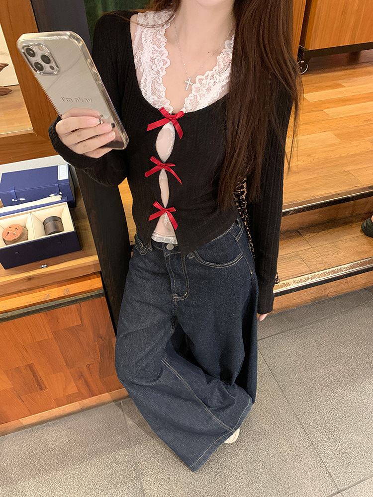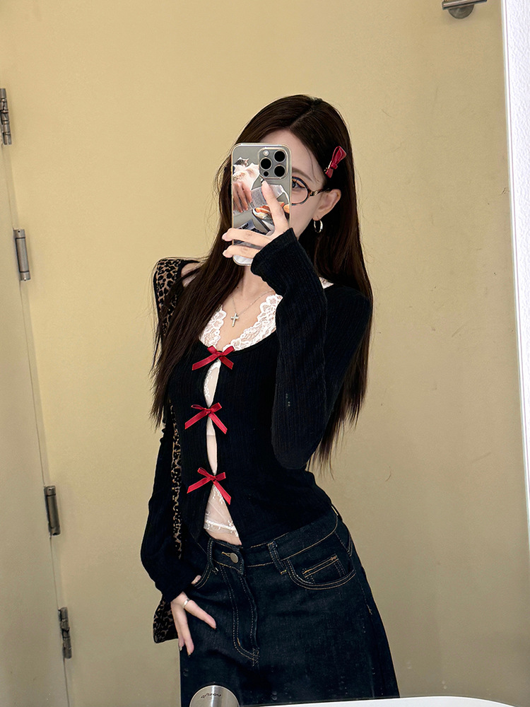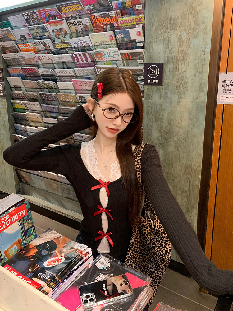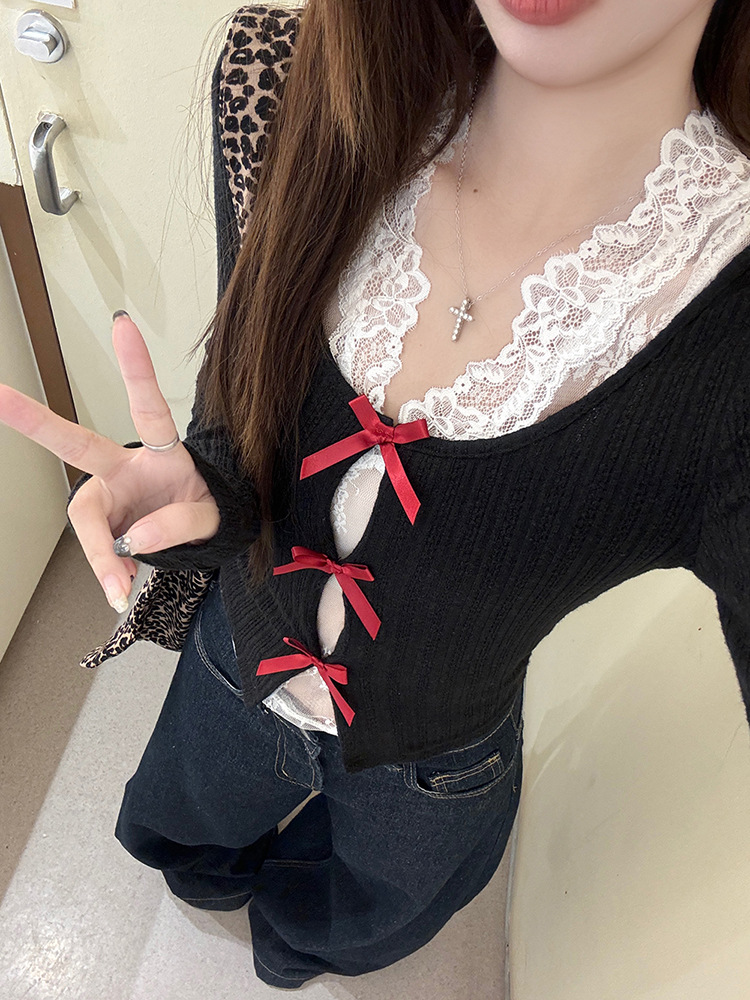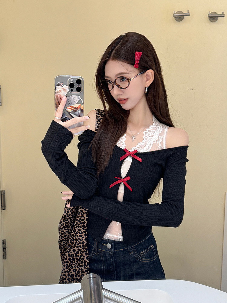달콤하고 매운 중공 티셔츠 여성용 초가을 새로운 슬림 핏 슬리밍 디자인 센스 스택 짧은 긴팔 탑