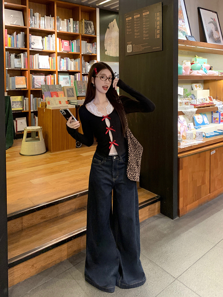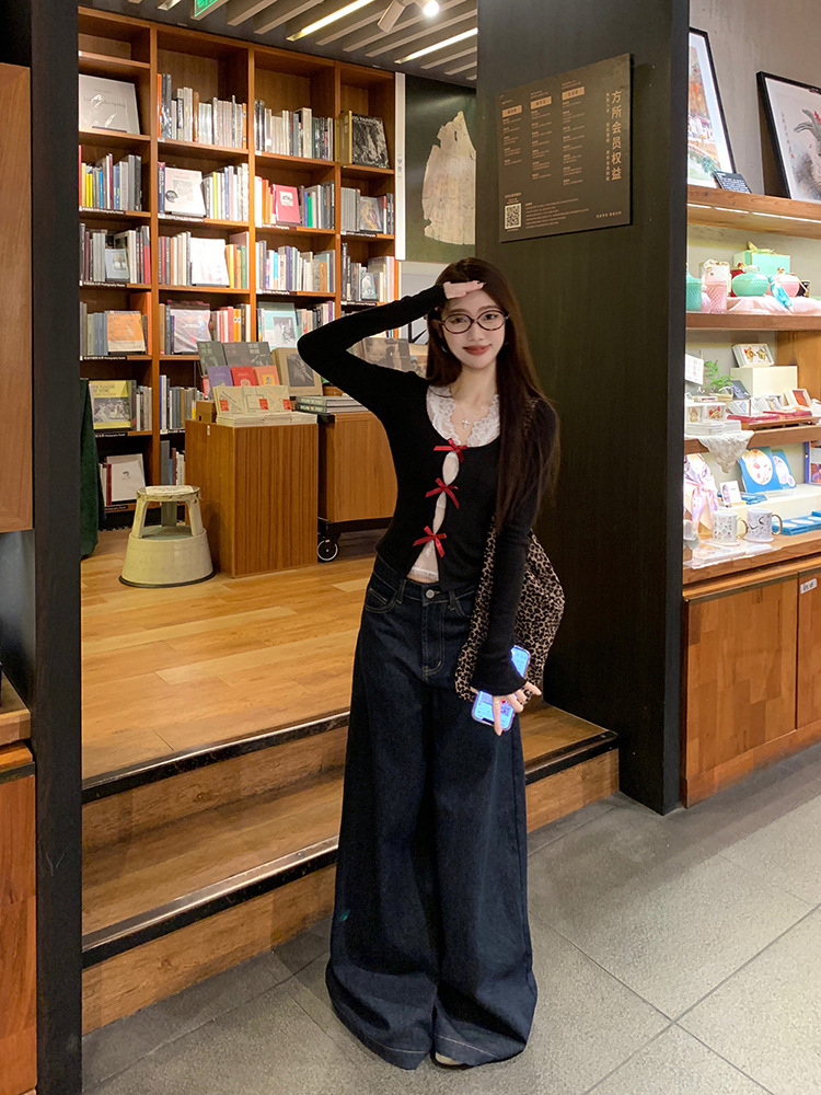 달콤하고 매운 중공 티셔츠 여성용 초가을 새로운 슬림 핏 슬리밍 디자인 센스 스택 짧은 긴팔 탑스토어 가기