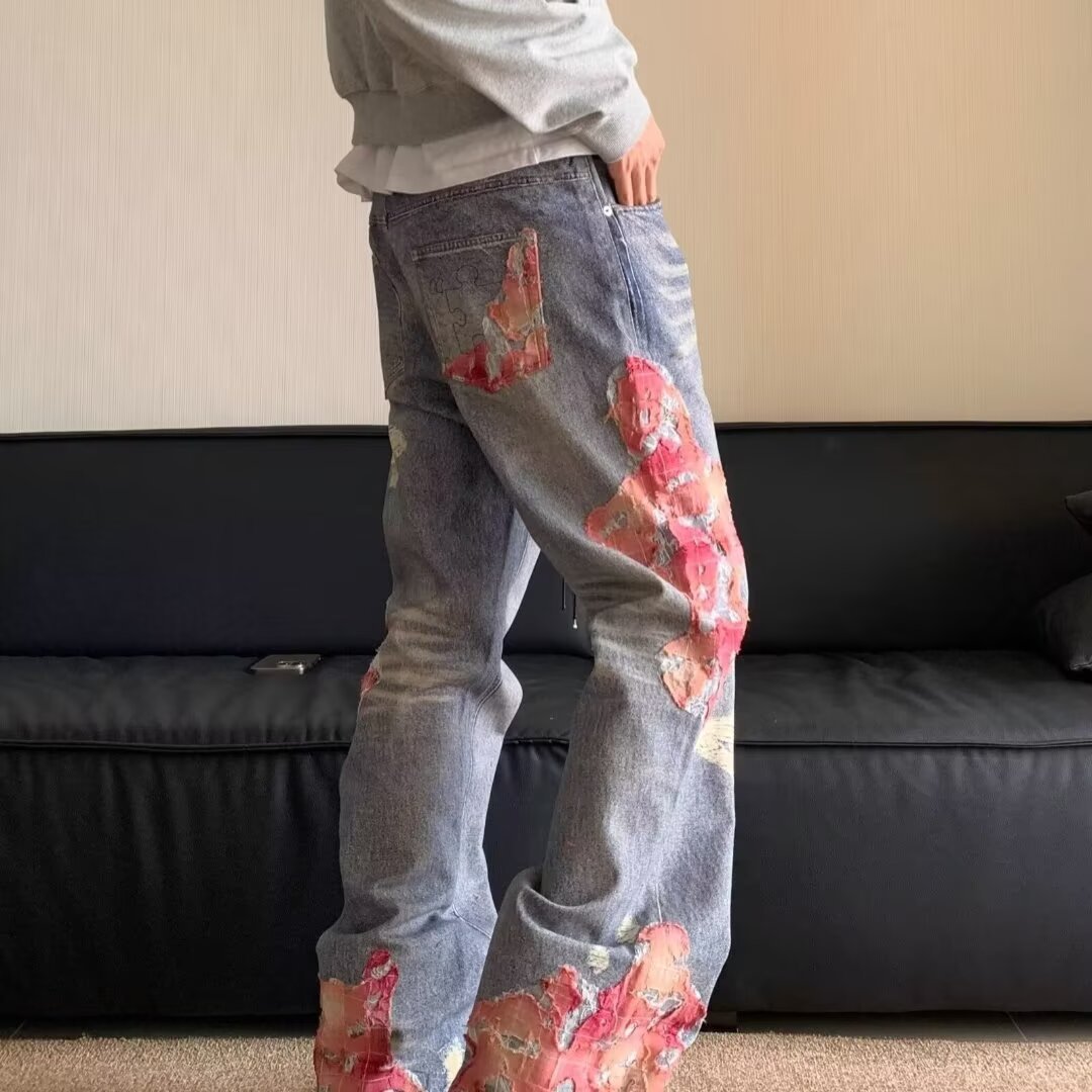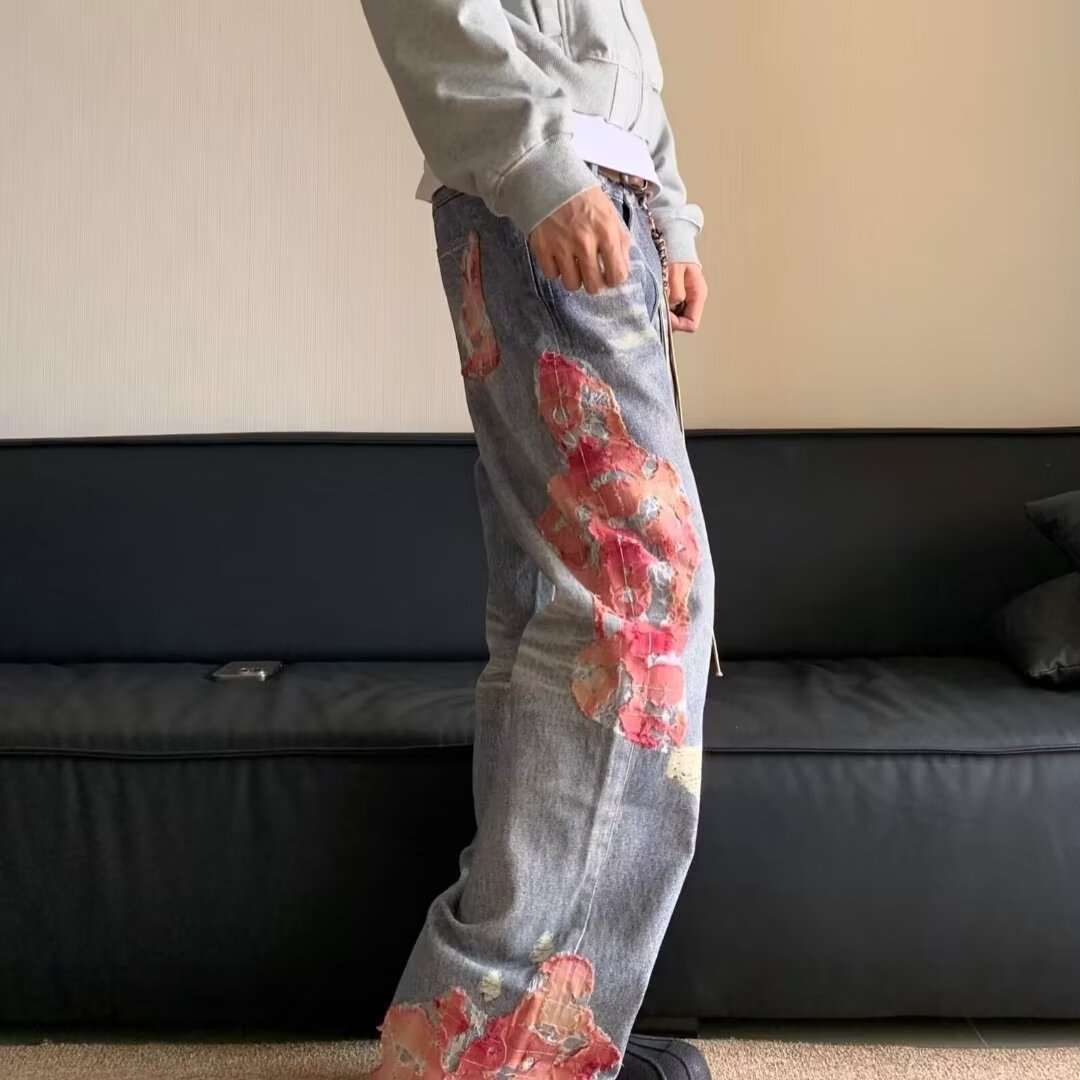 국경을 넘나 드는 유럽과 미국의 하이 스트리트 봄과 가을 일몰 레이스 프린트 청바지 남성 아메리칸 스트리트 느슨한 바느질 걸레 바지스토어 가기