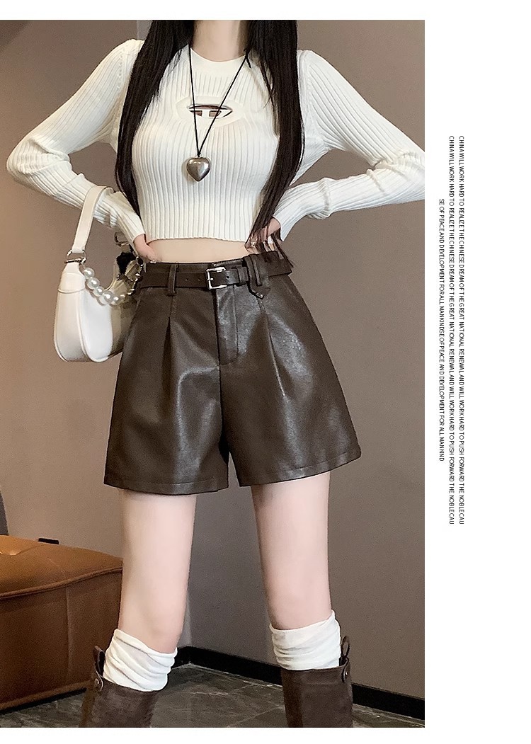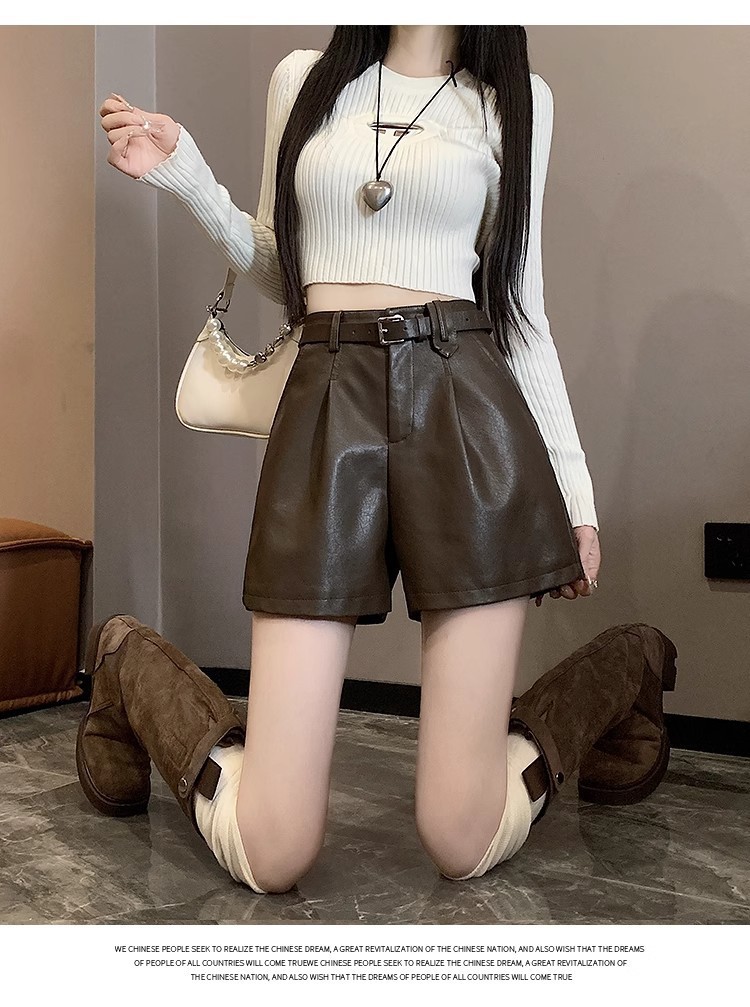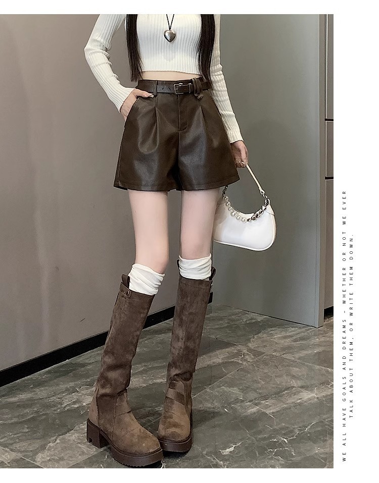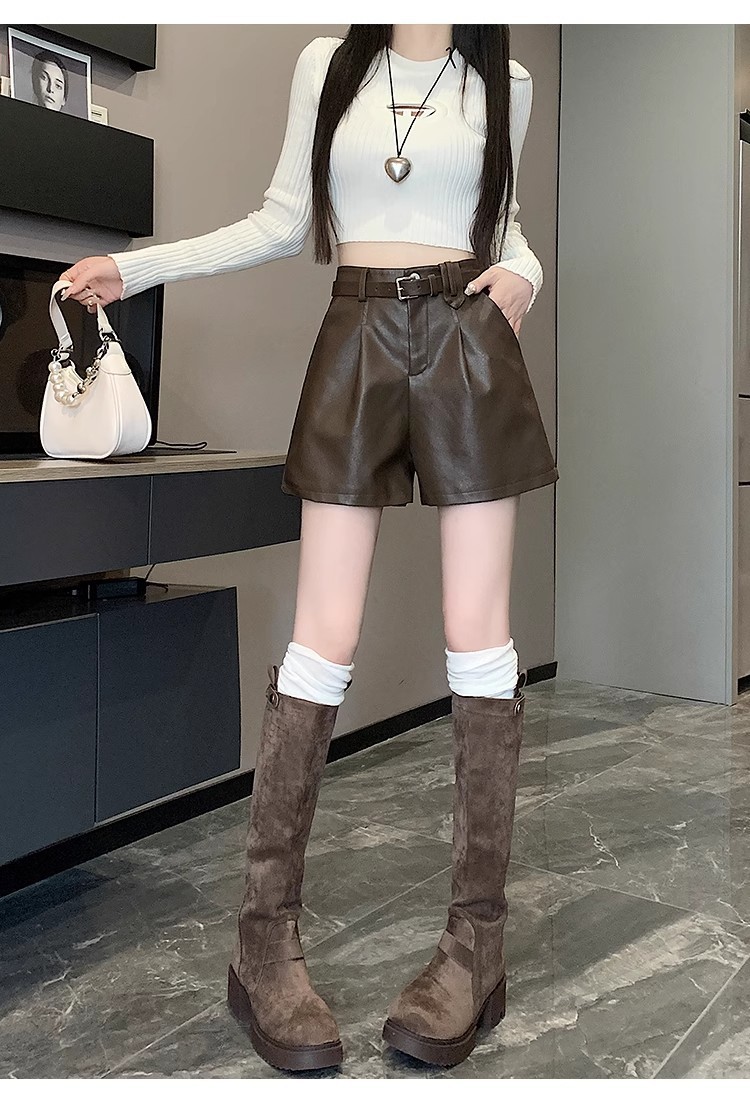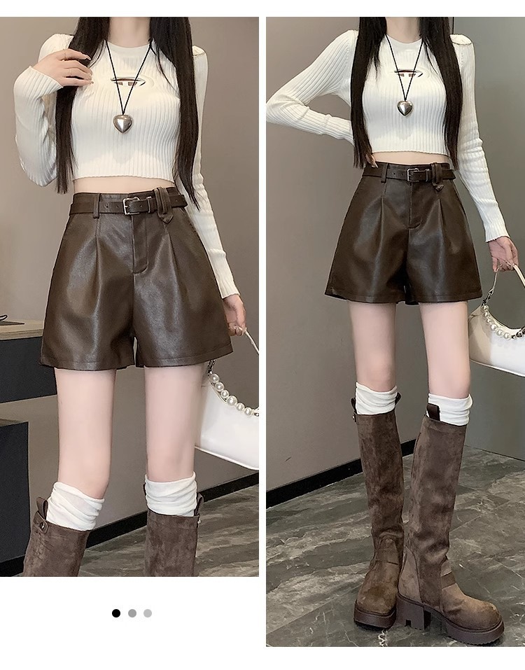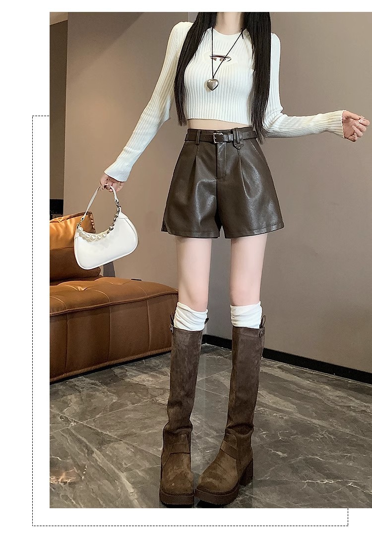PU 가죽 높은 허리 반바지 여성의 가을과 겨울 2024 새로운 넓은 다리 A-모양의 캐주얼 슬리밍 블랙 루즈베이스 부츠 바지스토어 가기