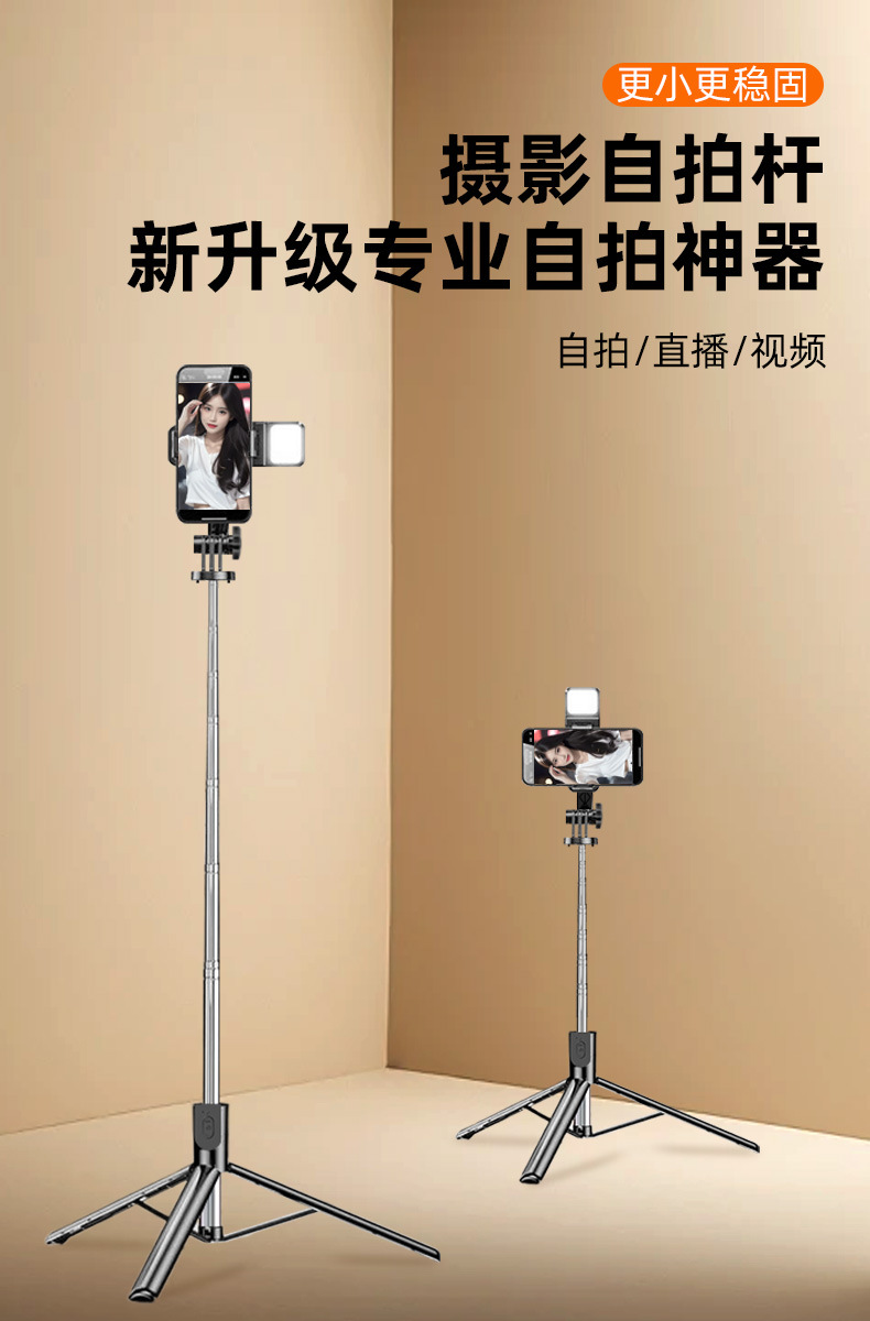 휴대 전화 라이브 여행 셀카 무선 블루투스 텔레스코픽 조명 통합 삼각대 연장 핸드 헬드 셀카 스틱