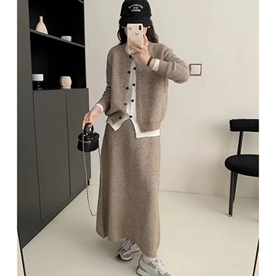 게으른 스타일 가짜 투피스 니트 세트 여성 가을 및 겨울 새로운 한국식 느슨한 크루 넥 스웨터 스커트 투피스 세트