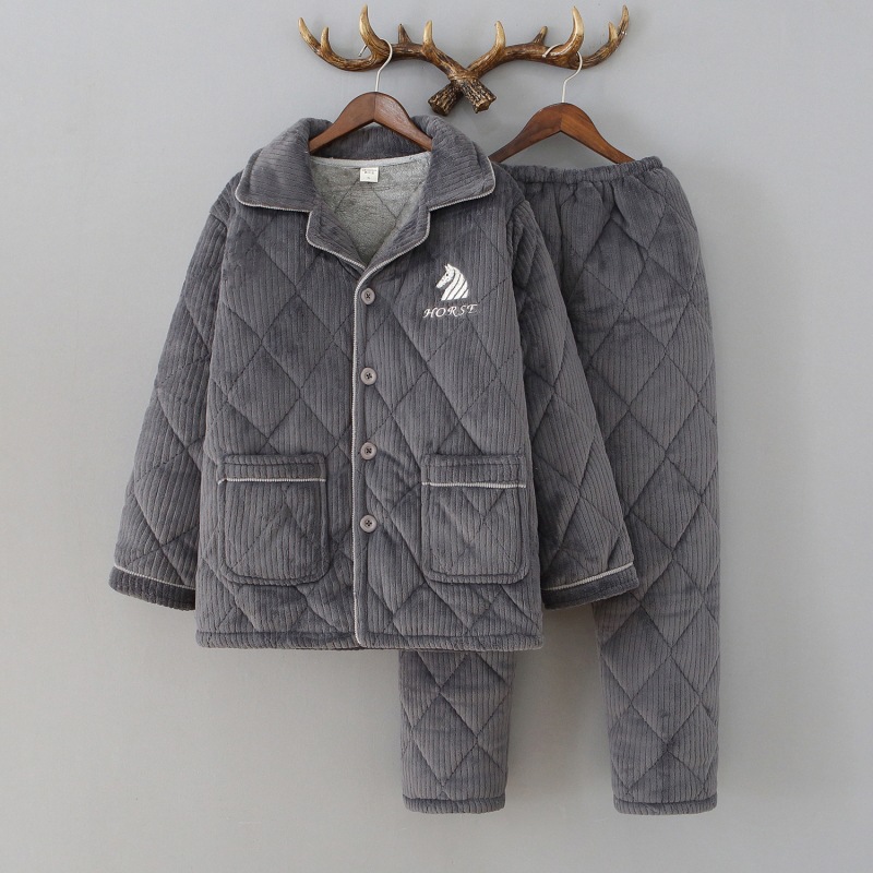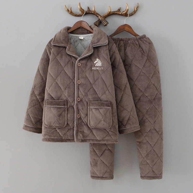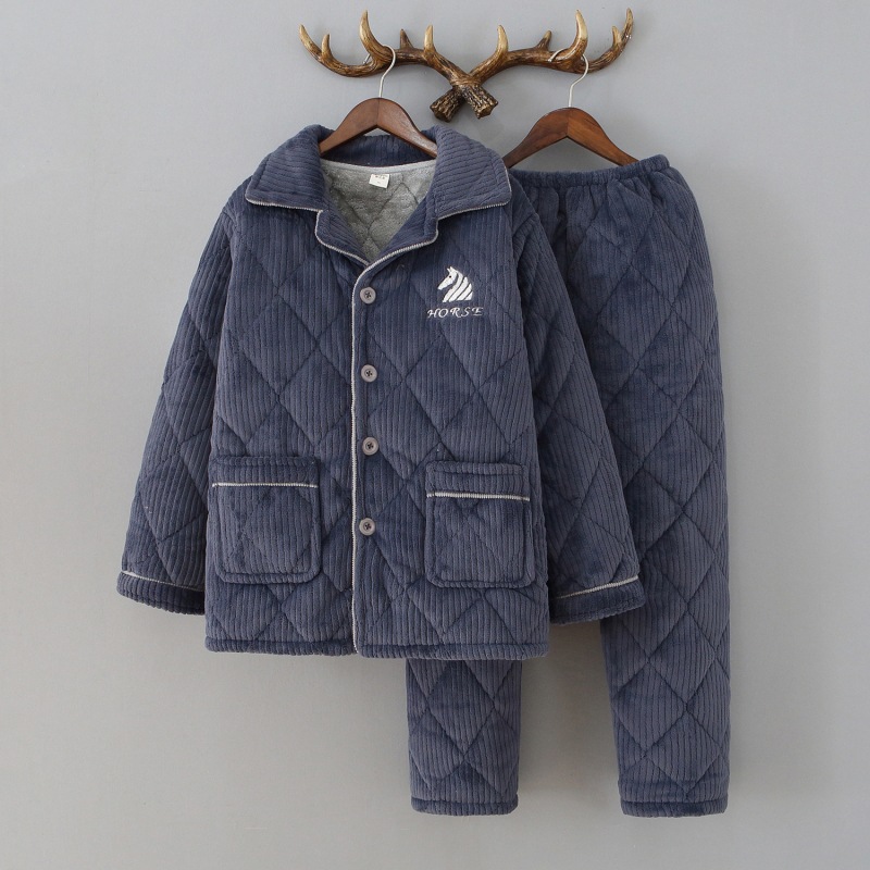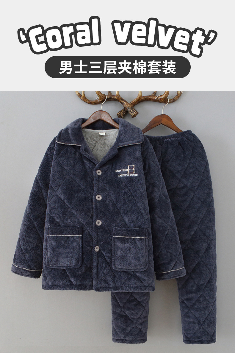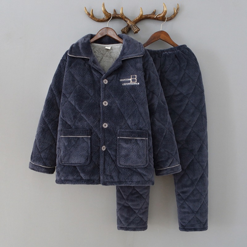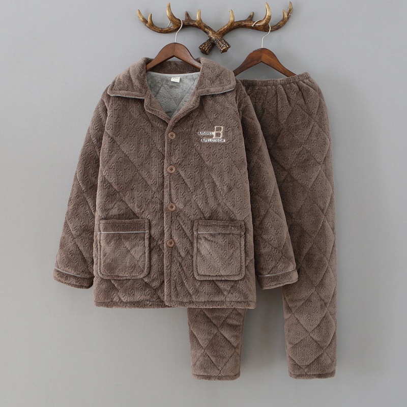 젊고 중년의 겨울 3 층 퀼트 두꺼운 남자 플란넬 파자마 산호 양털 플러스 사이즈 따뜻한 가정 옷 세트