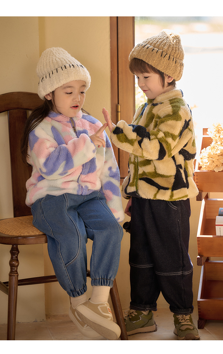 Mianhuatang 아동복 어린이 두꺼운 니트 벨벳 재킷 2024 새로운 스타일 따뜻한 만화 캐주얼 어린이 탑