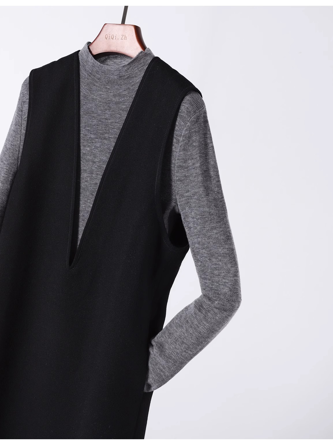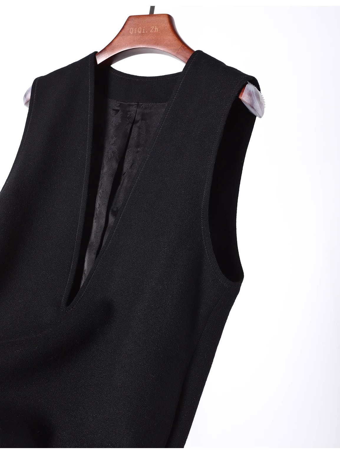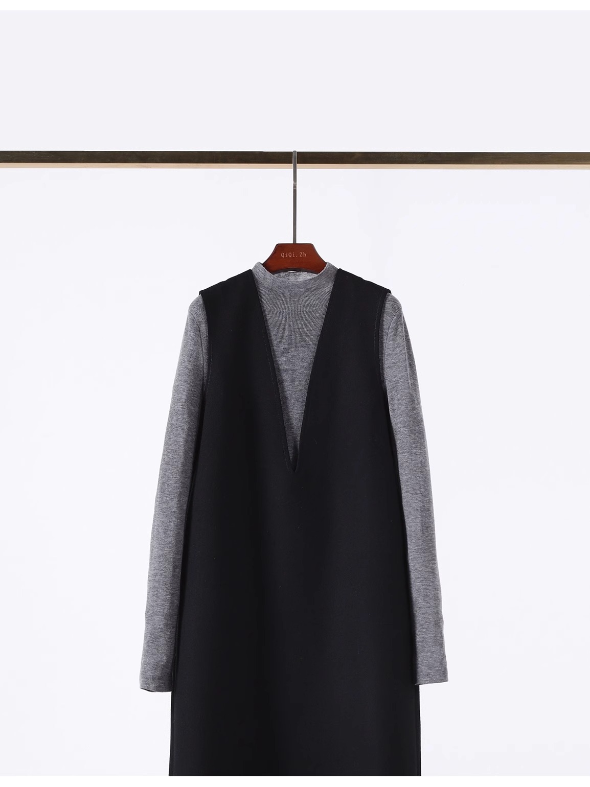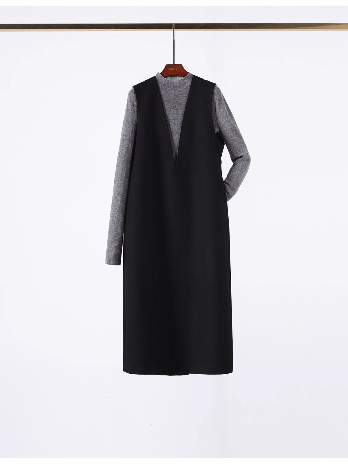 클래식하고 영원한 스타일의 딥 브이넥 워스티드 울 크레이프 다용도 롱 베스트 드레스