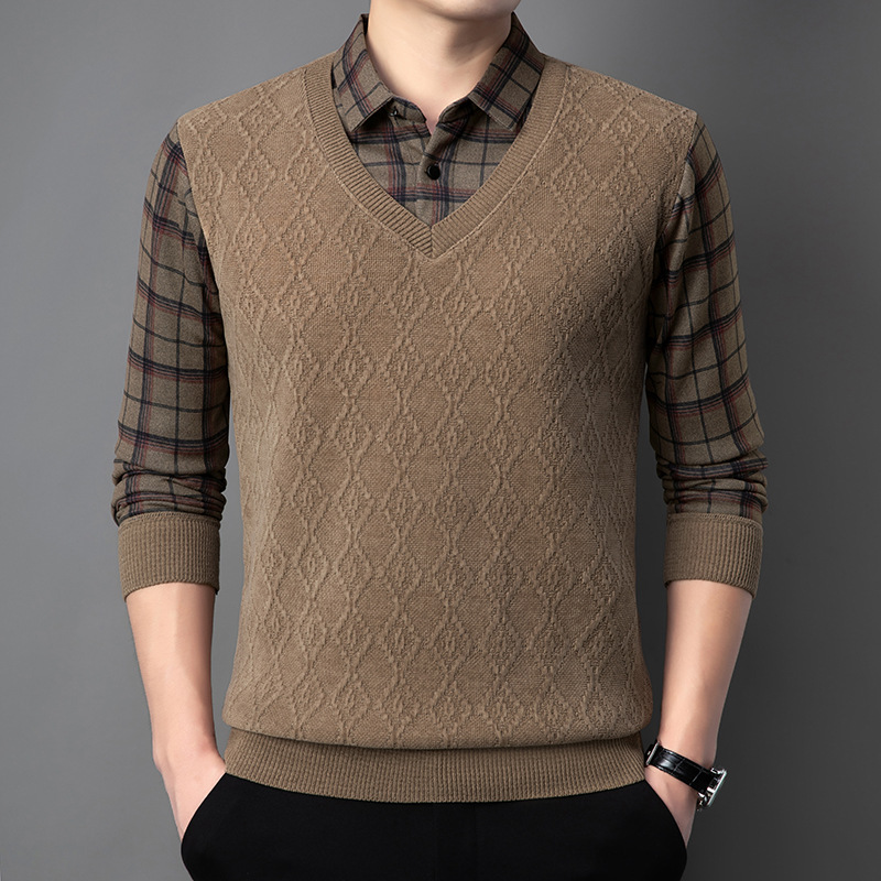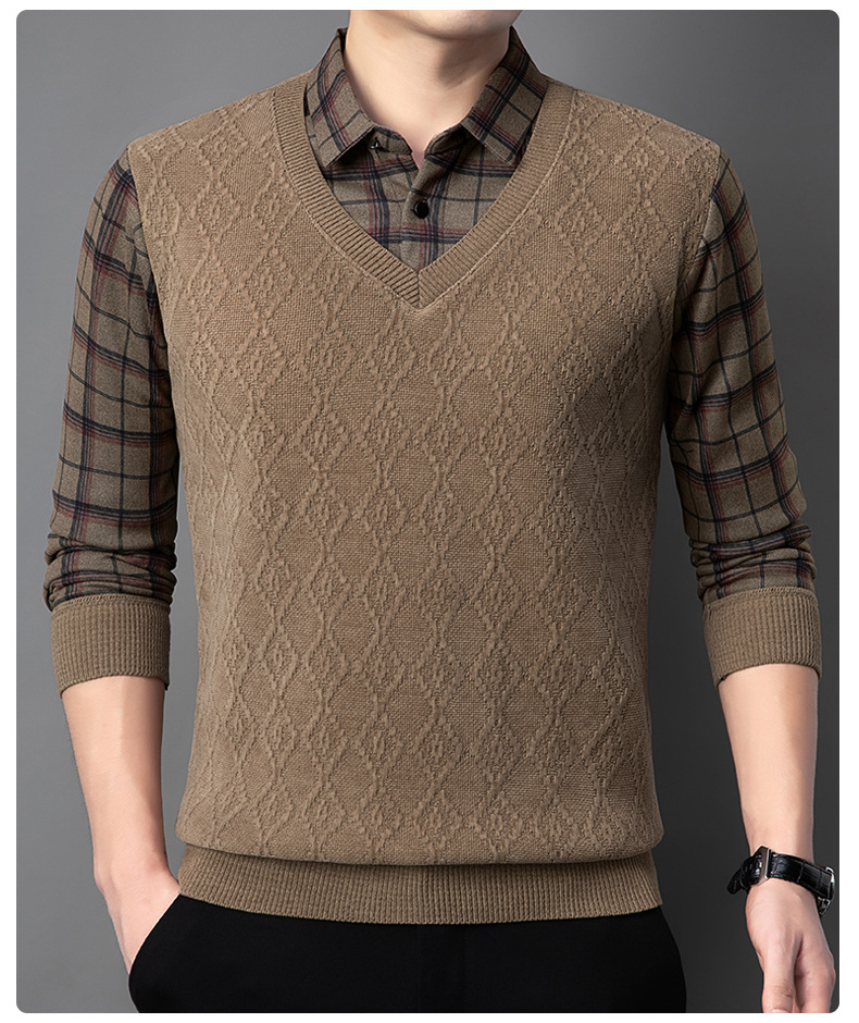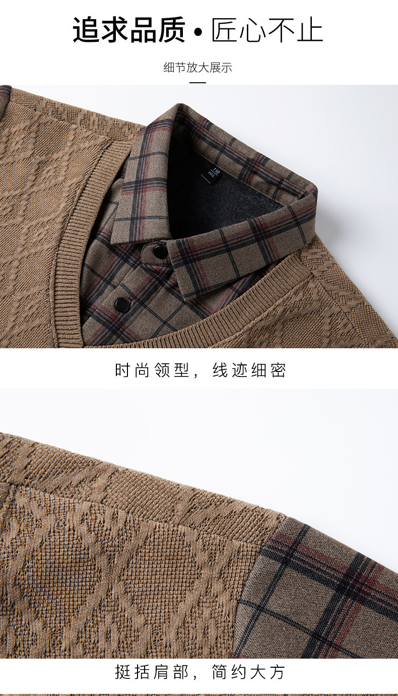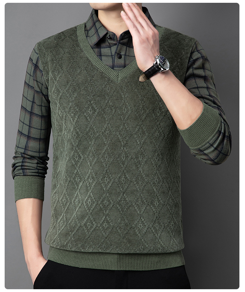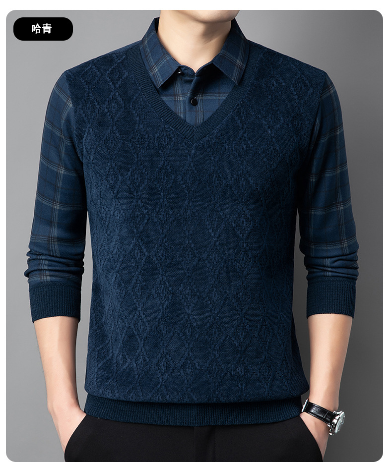 새로운 가을과 겨울 남자의 가짜 2 조각 격자 무늬 셔츠 기모 두꺼운 옷깃 따뜻한 자카드 니트 아빠 옷