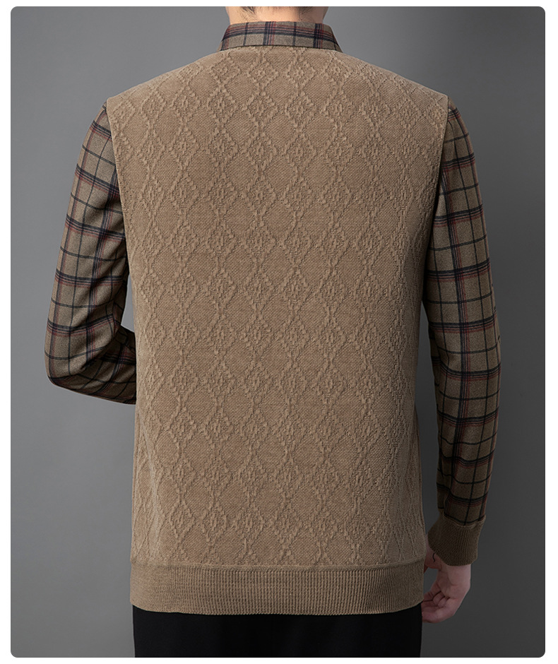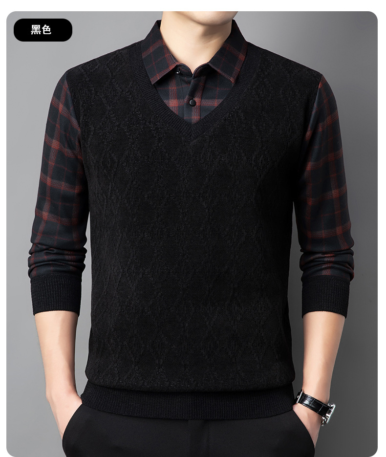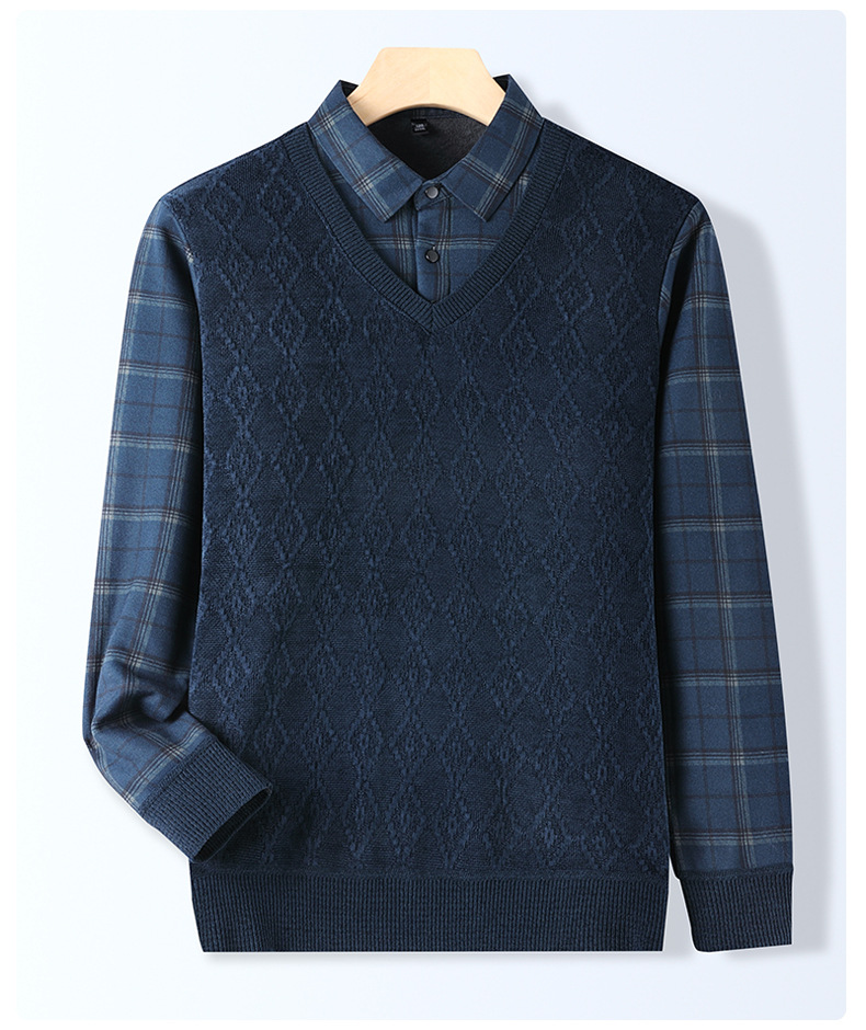 새로운 가을과 겨울 남자의 가짜 2 조각 격자 무늬 셔츠 기모 두꺼운 옷깃 따뜻한 자카드 니트 아빠 옷스토어 가기