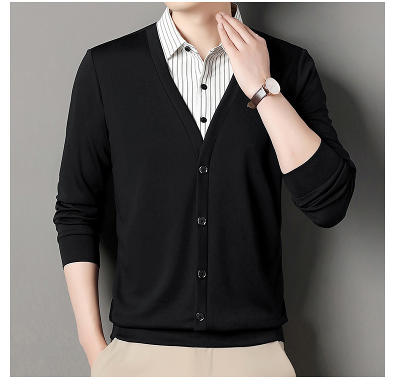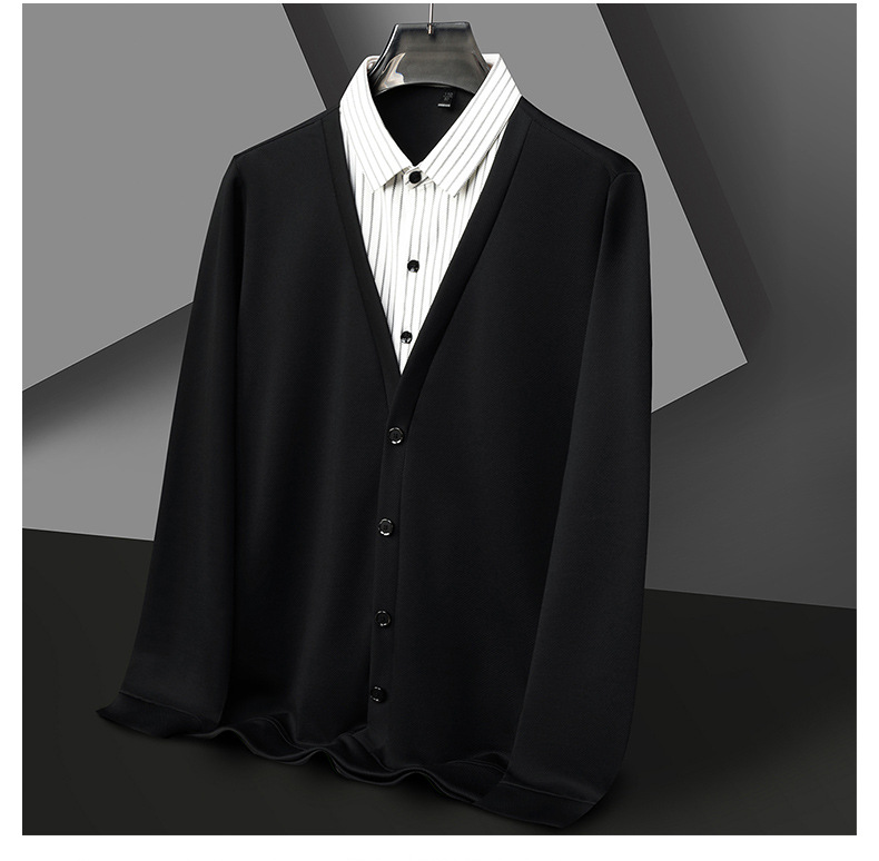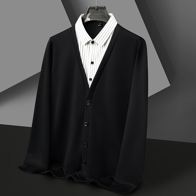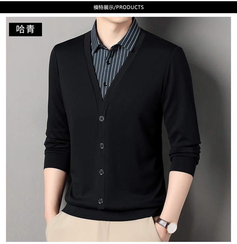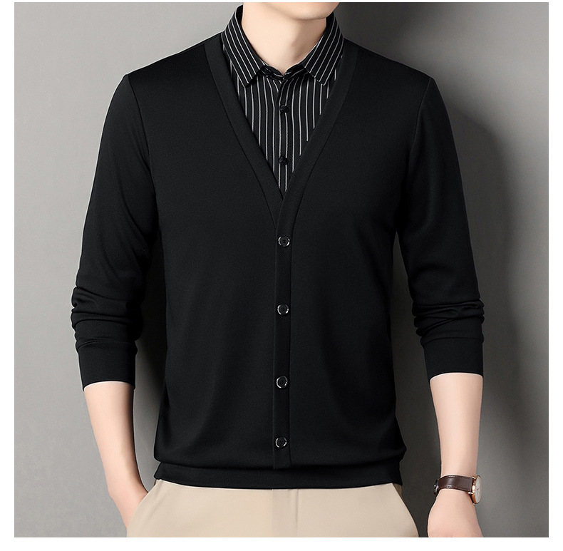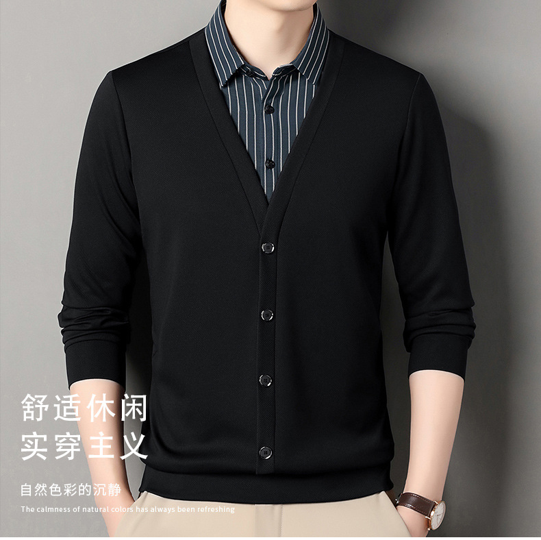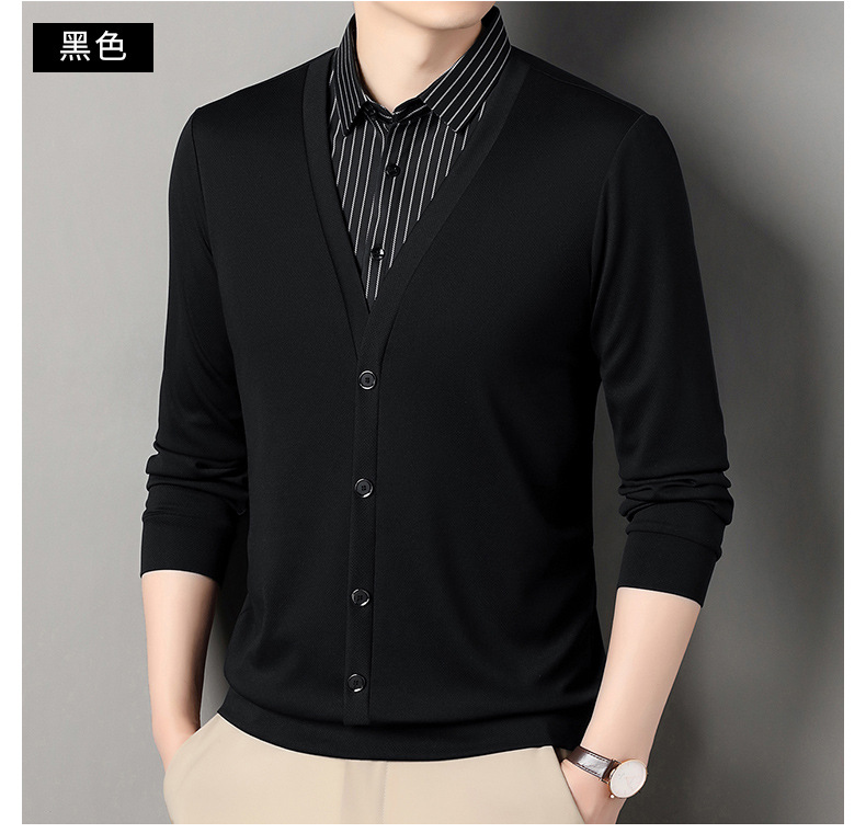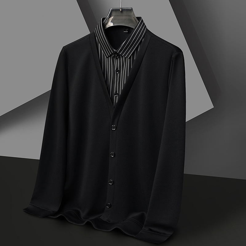 남자 봄과 가을 V-넥 싱글 브레스트 페이크 투피스 스트라이프 셔츠 바느질 패션 캐주얼 올 매치 긴팔 중년 탑스토어 가기