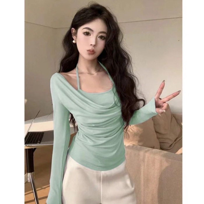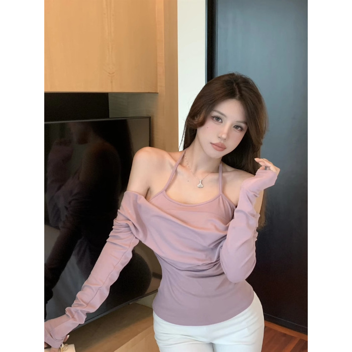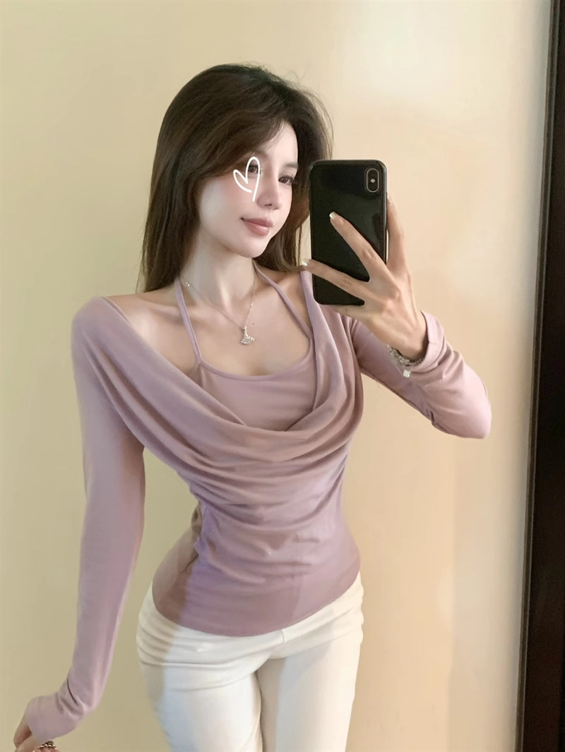 가짜 투피스 바느질 긴팔 티셔츠 여성용 가을 슬림 핏 슬리밍 디자인 센스 우아한 짧은 내부 탑스토어 가기