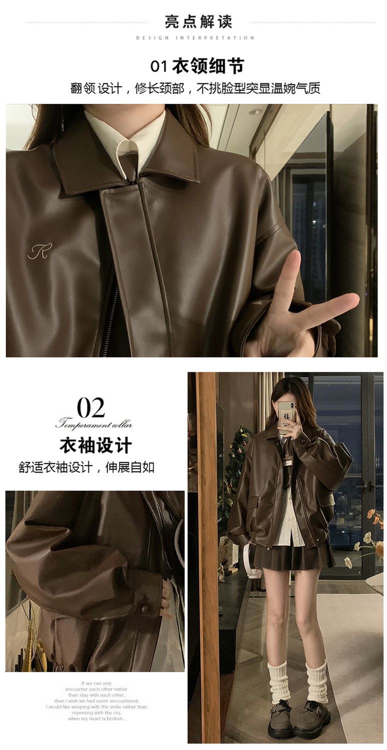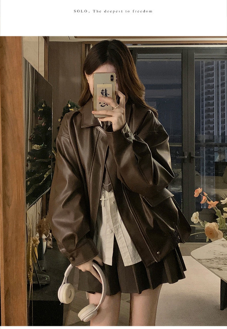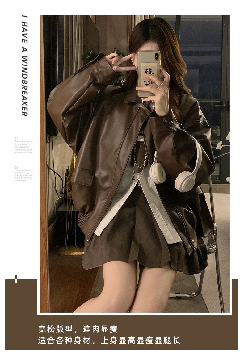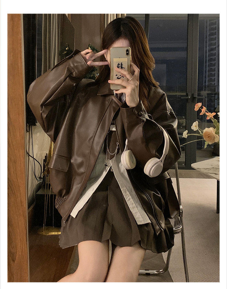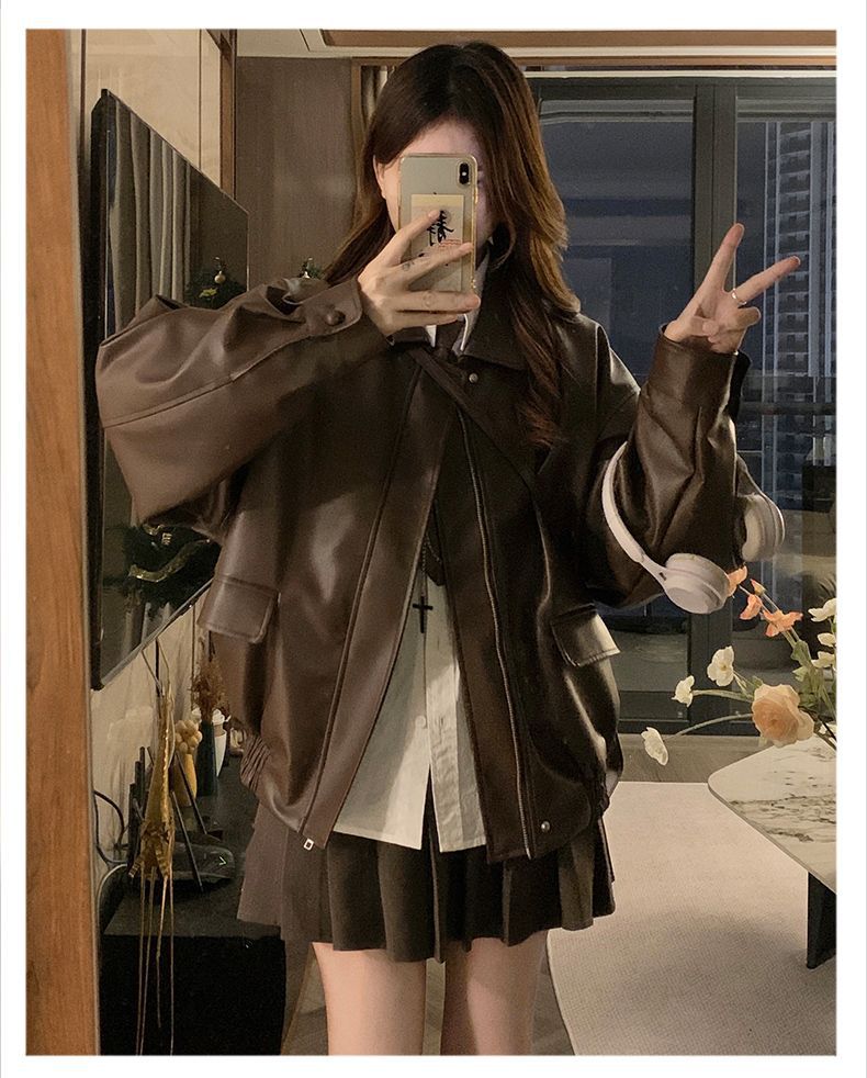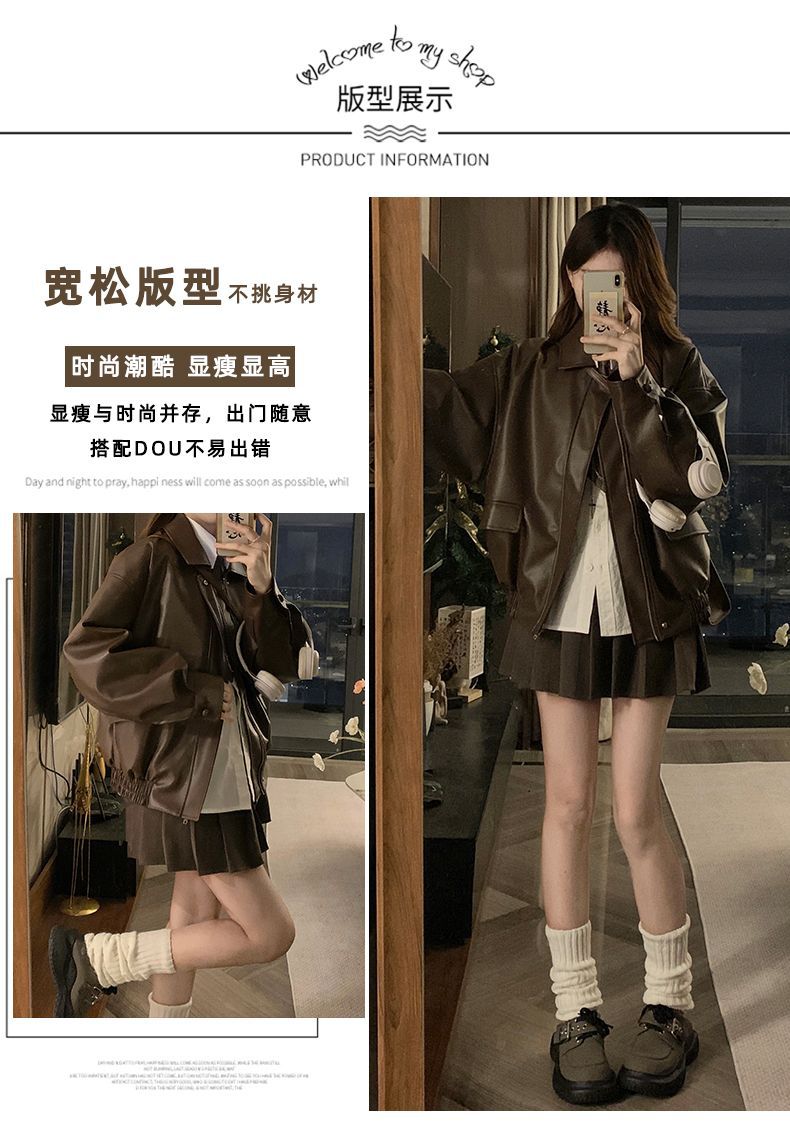 여학생을위한 Ancora 레드 가죽 짧은 재킷 2025 봄, 가을 새로운 미국 복고풍 야구 유니폼 가죽 자켓 탑스토어 가기