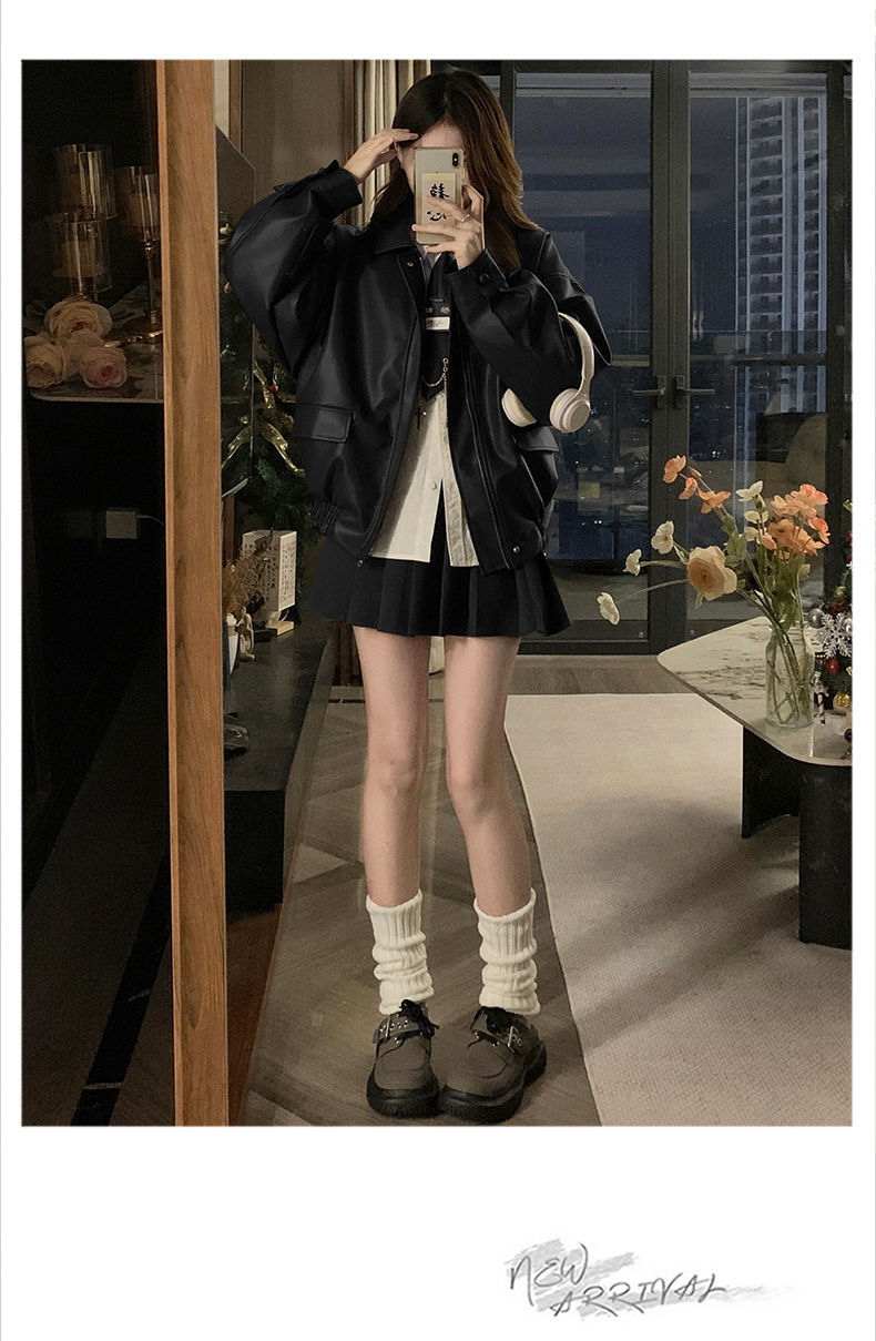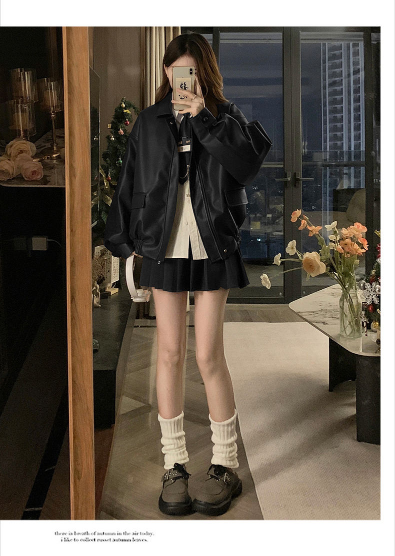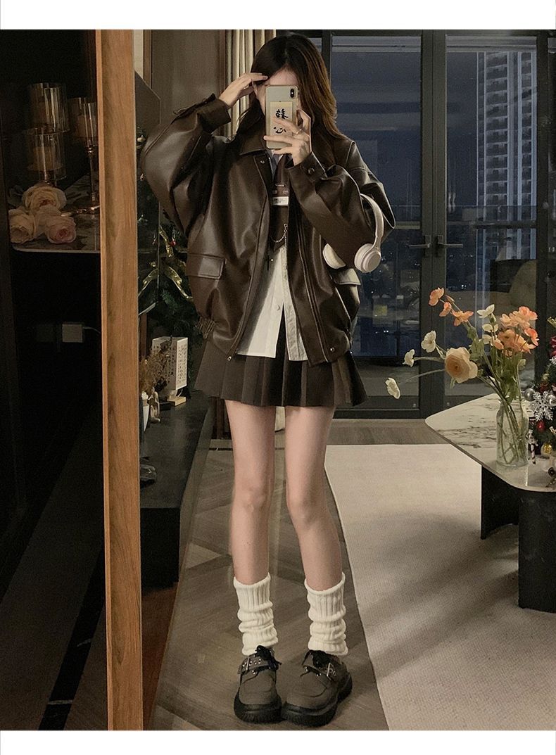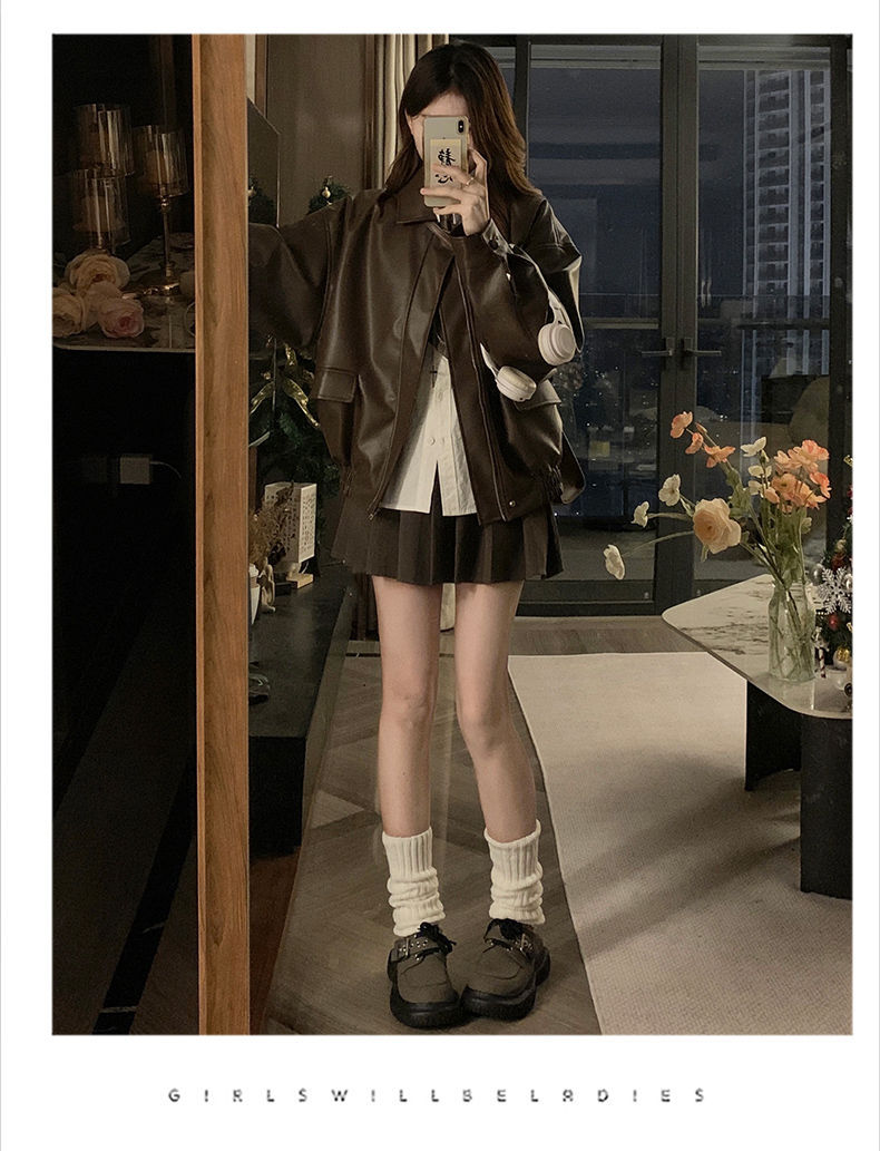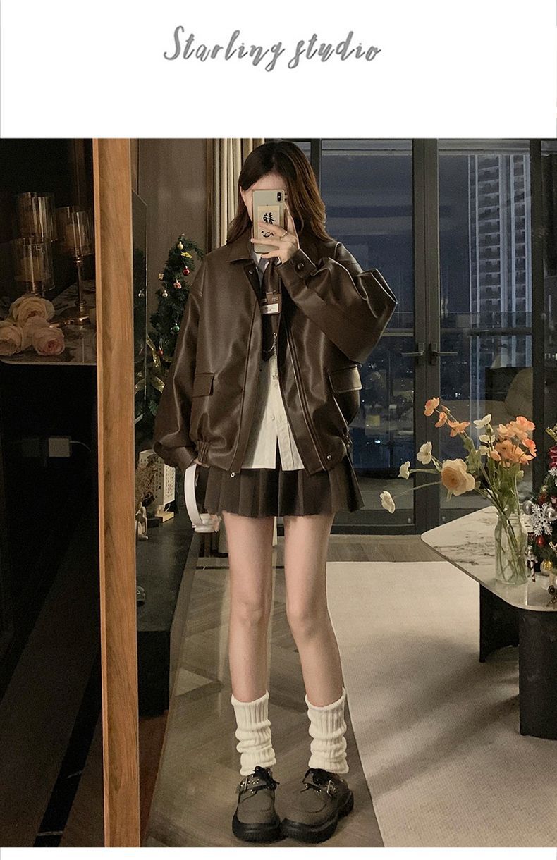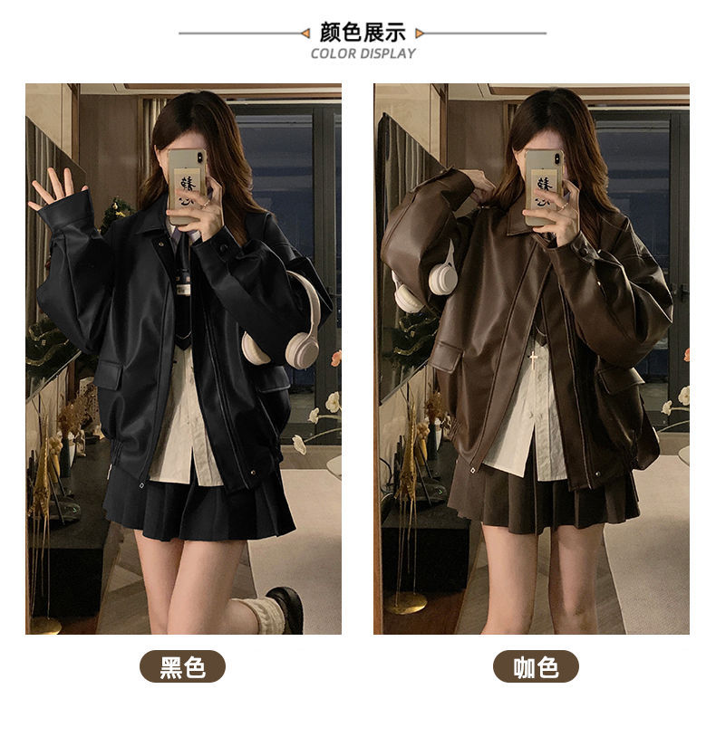 여학생을위한 Ancora 레드 가죽 짧은 재킷 2025 봄, 가을 새로운 미국 복고풍 야구 유니폼 가죽 자켓 탑스토어 가기