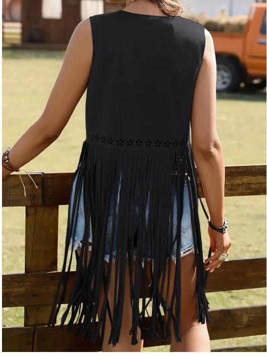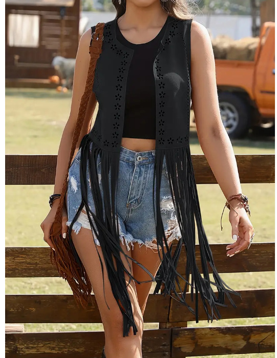 유럽풍 히피 스타일 구멍 장식 프린지 민소매 조끼 여성용 슬릿 프린지 재킷