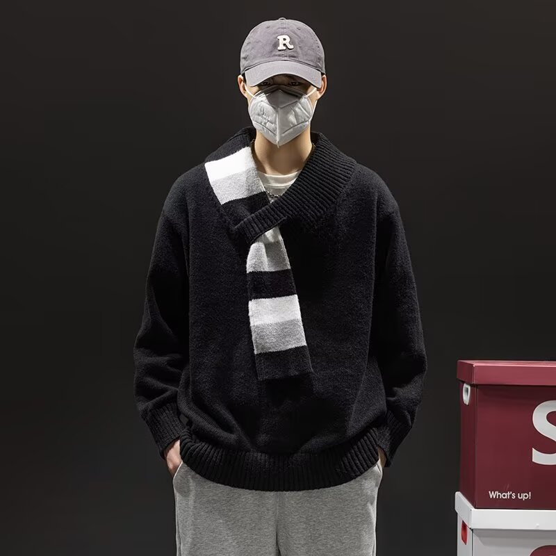 새로운 컬렉션 틈새 디자인 스카프 칼라 스웨터 남성용 느슨한 V 넥 니트 셔츠 풀오버 레드 탑 커플스토어 가기