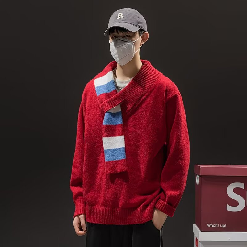 새로운 컬렉션 틈새 디자인 스카프 칼라 스웨터 남성용 느슨한 V 넥 니트 셔츠 풀오버 레드 탑 커플