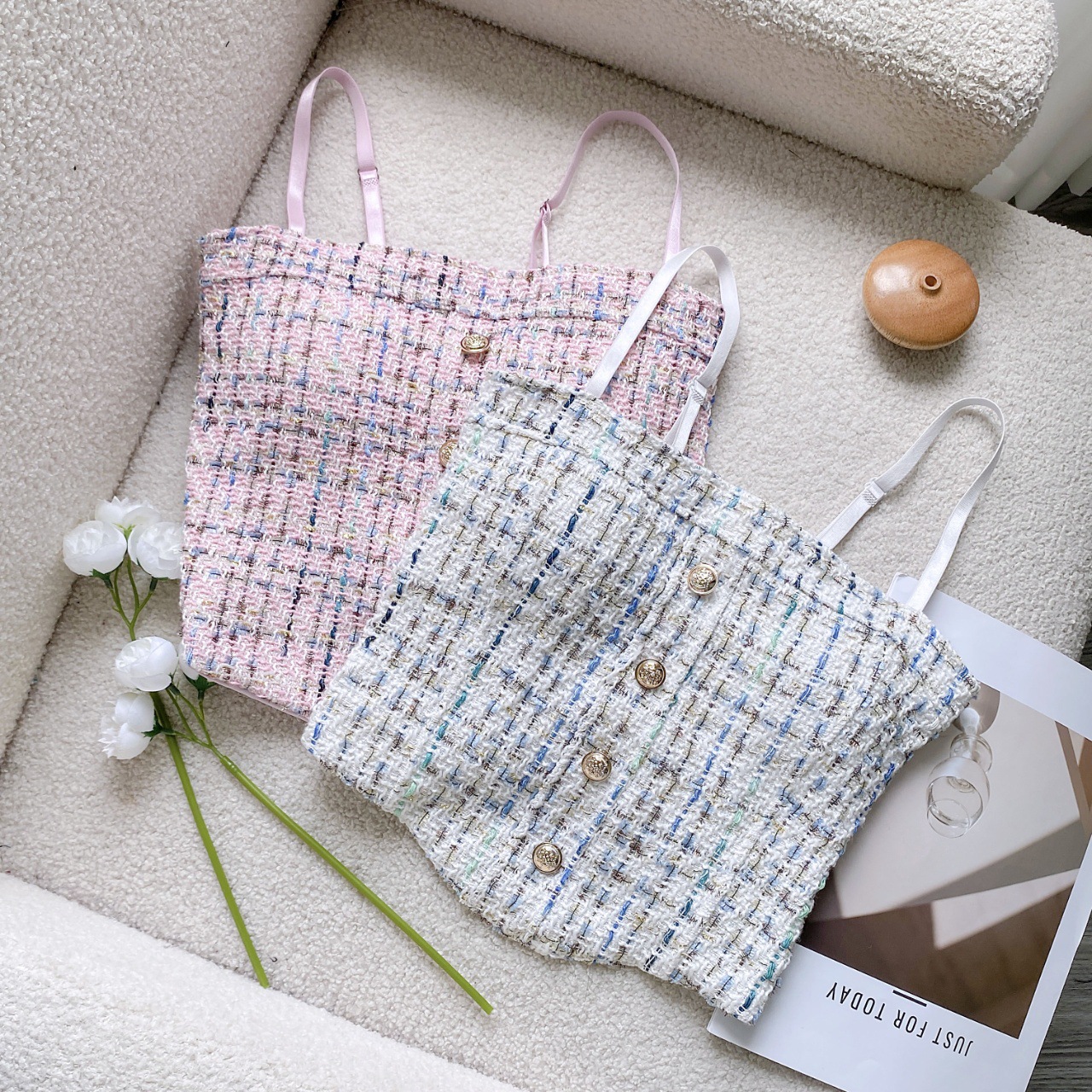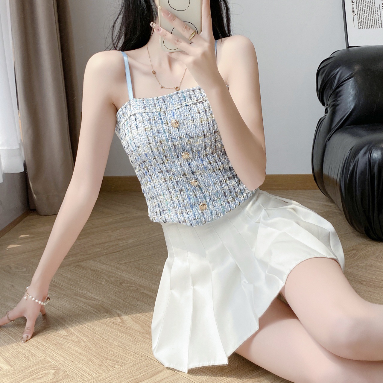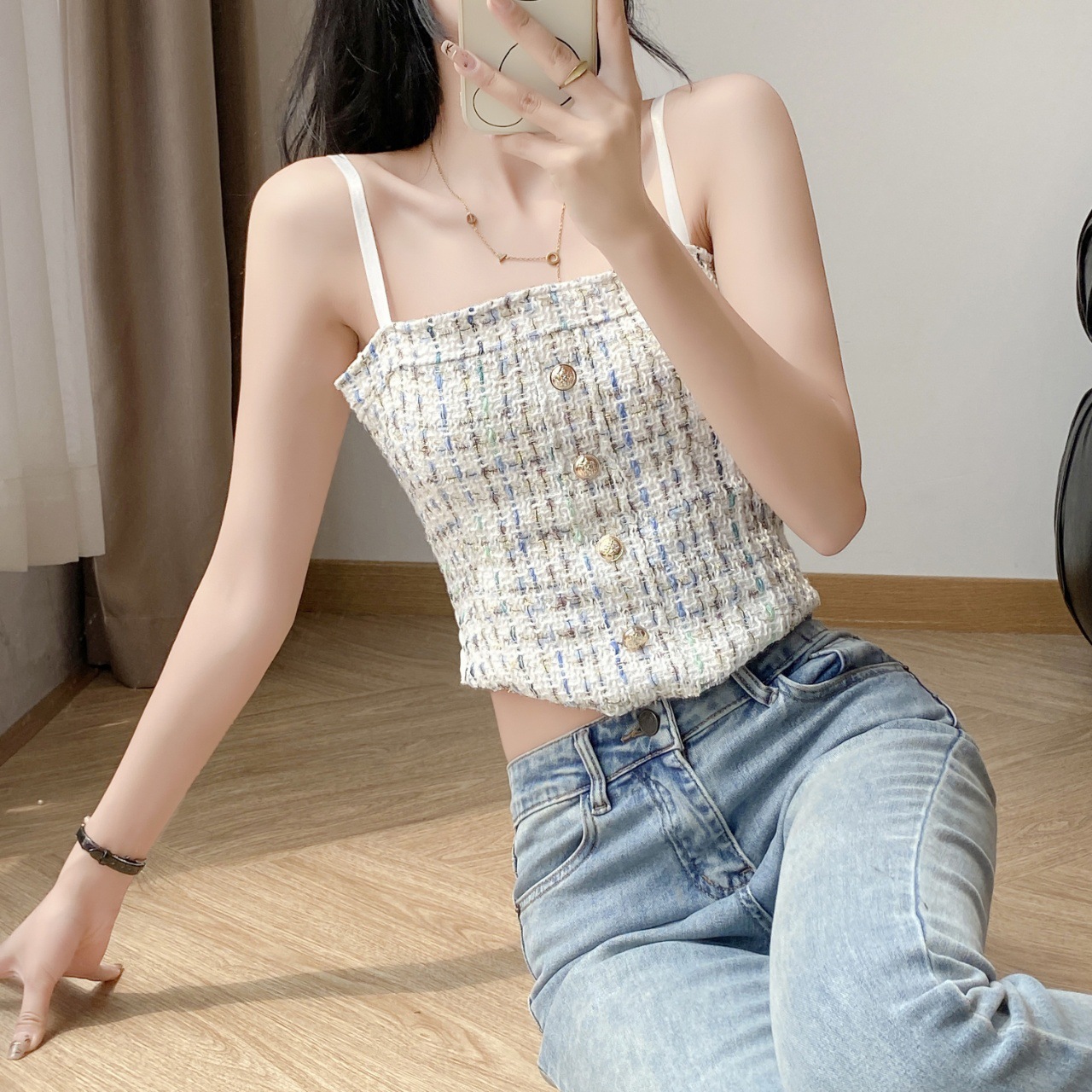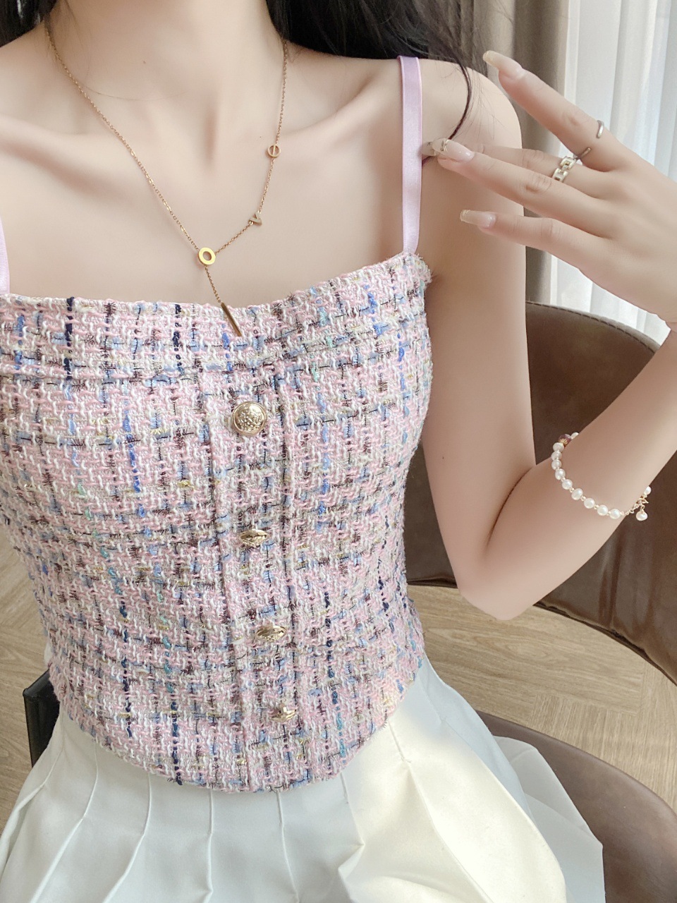 한국 스타일 샤넬 스타일 짠 격자 무늬 카미 솔 조끼 여성의 아름다운 뒷면 스파이스 소녀의 슬림 핏 올 매치 보투 탑