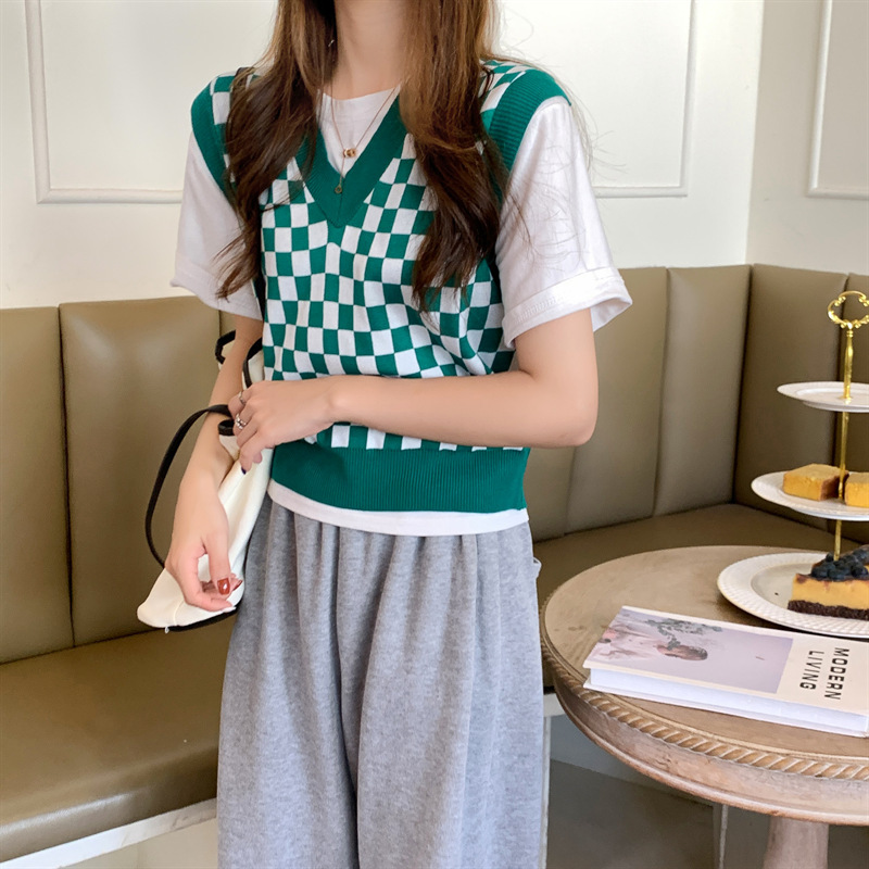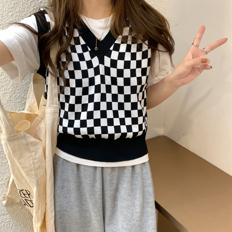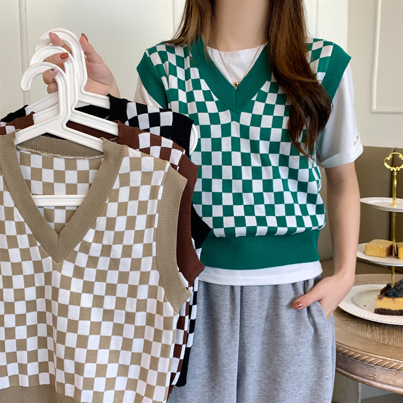 국경 간 공급 - 주문 접수 - 가격이 합리적인 탑 체크 무늬 짧은 니트 여성 조끼 가을스토어 가기