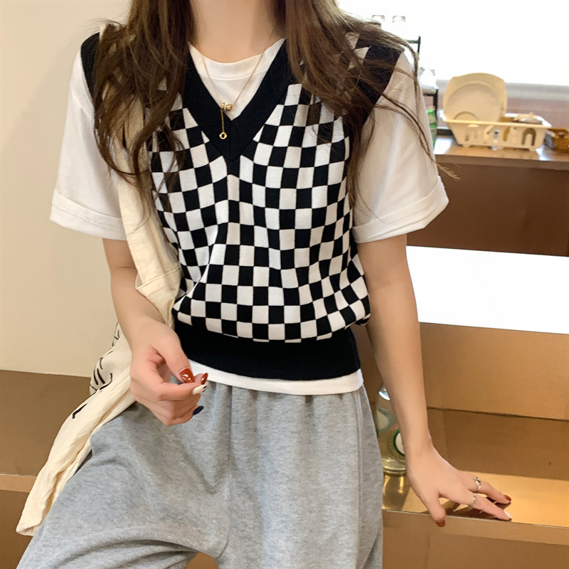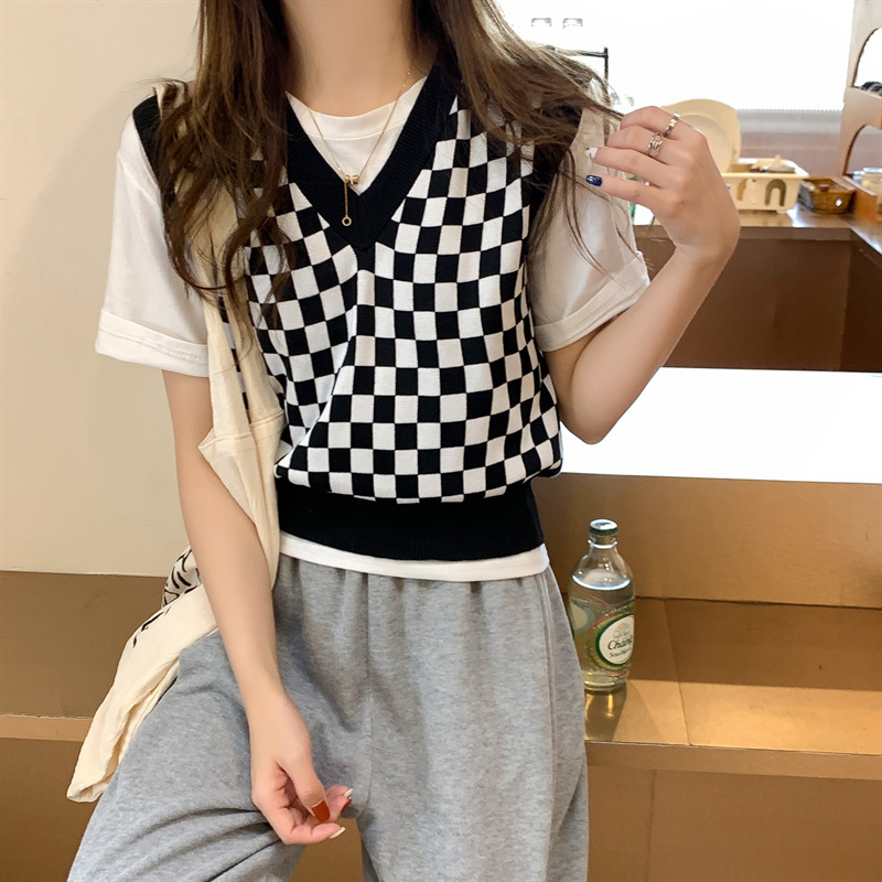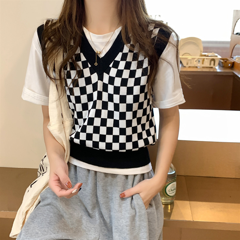 국경 간 공급 - 주문 접수 - 가격이 합리적인 탑 체크 무늬 짧은 니트 여성 조끼 가을